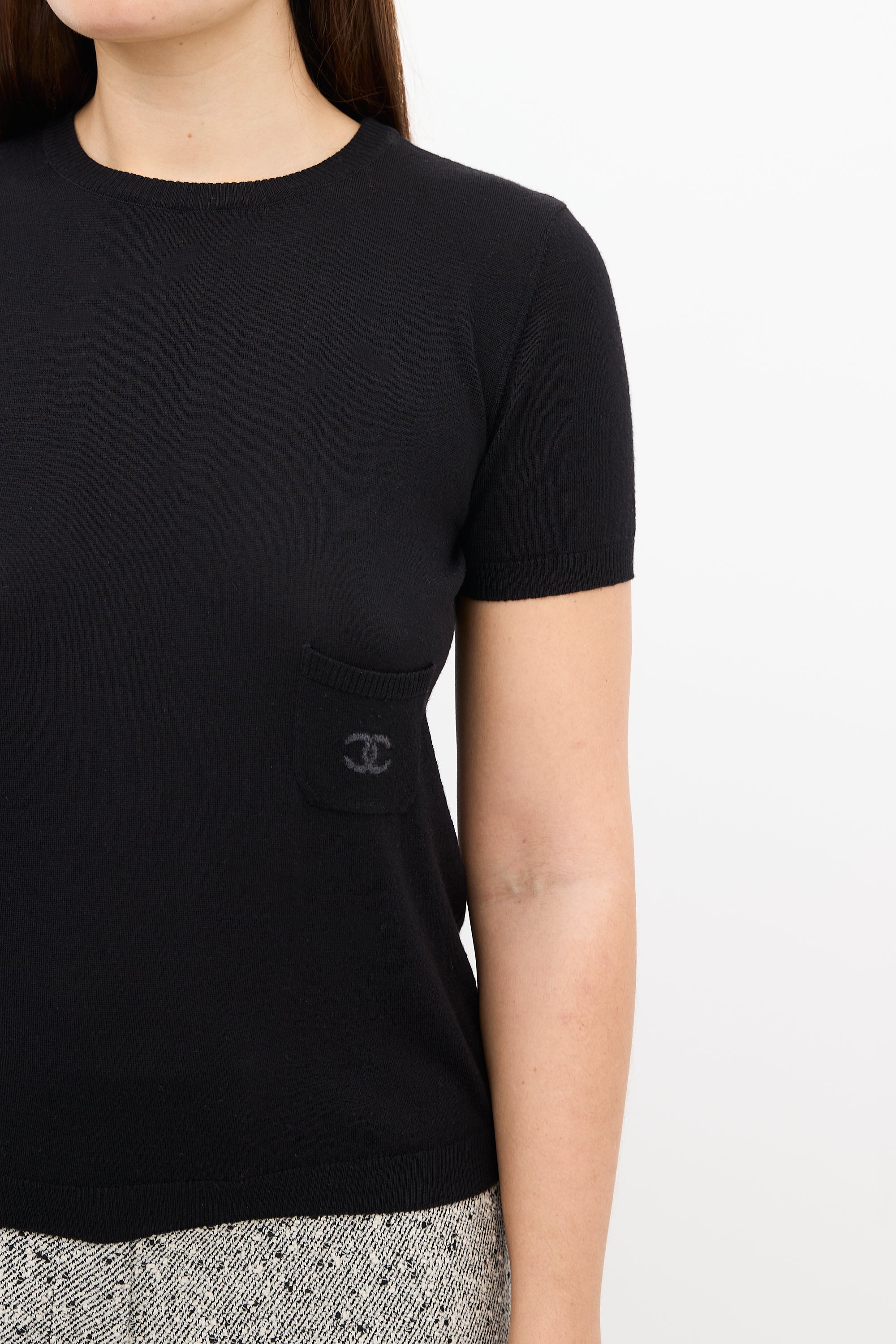 Pre-owned Chanel Fall 2005 black wool knit top featuring a round neckline, front pocket with interlocking CC intarsia, and ribbed collar, hem, and cuffs.