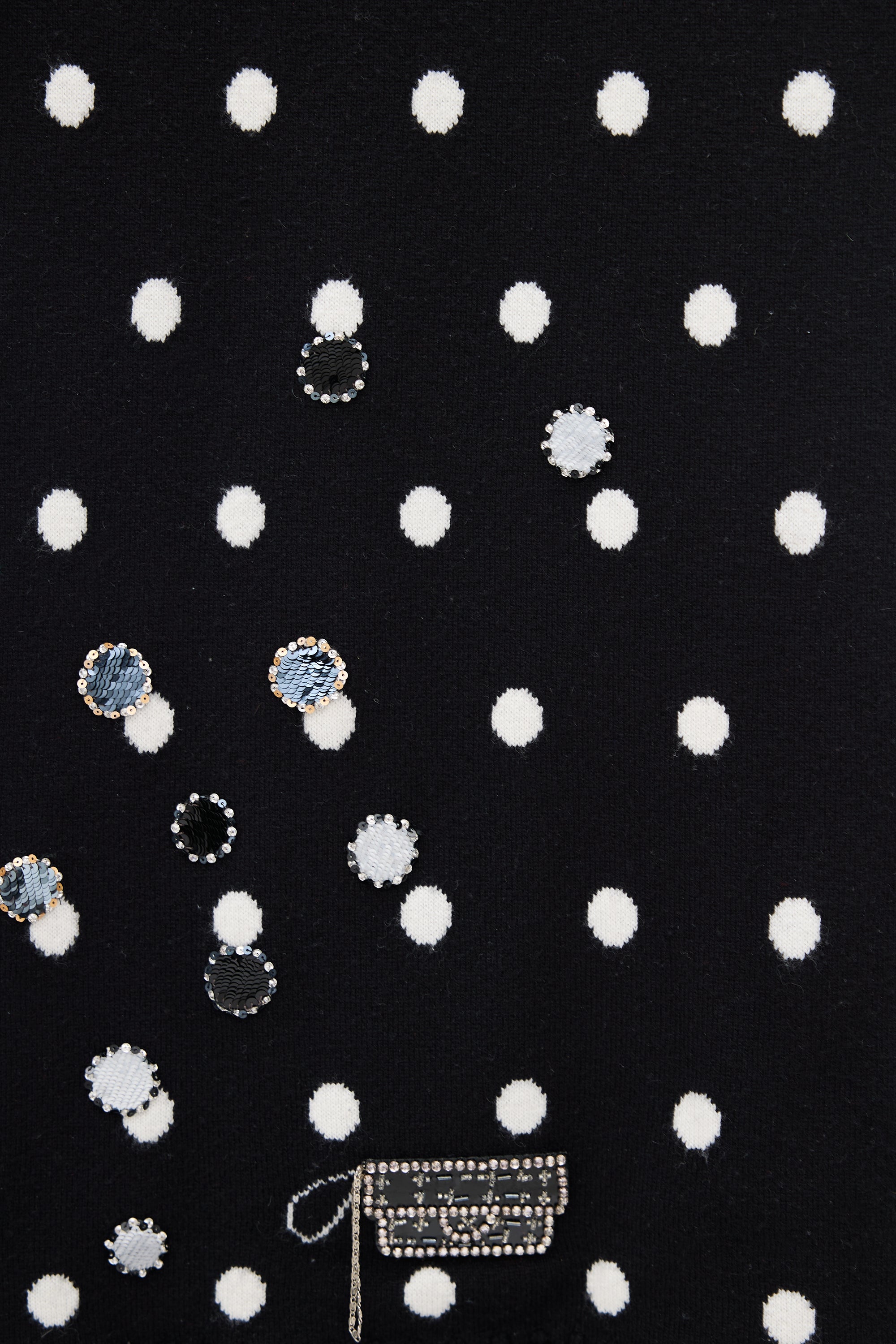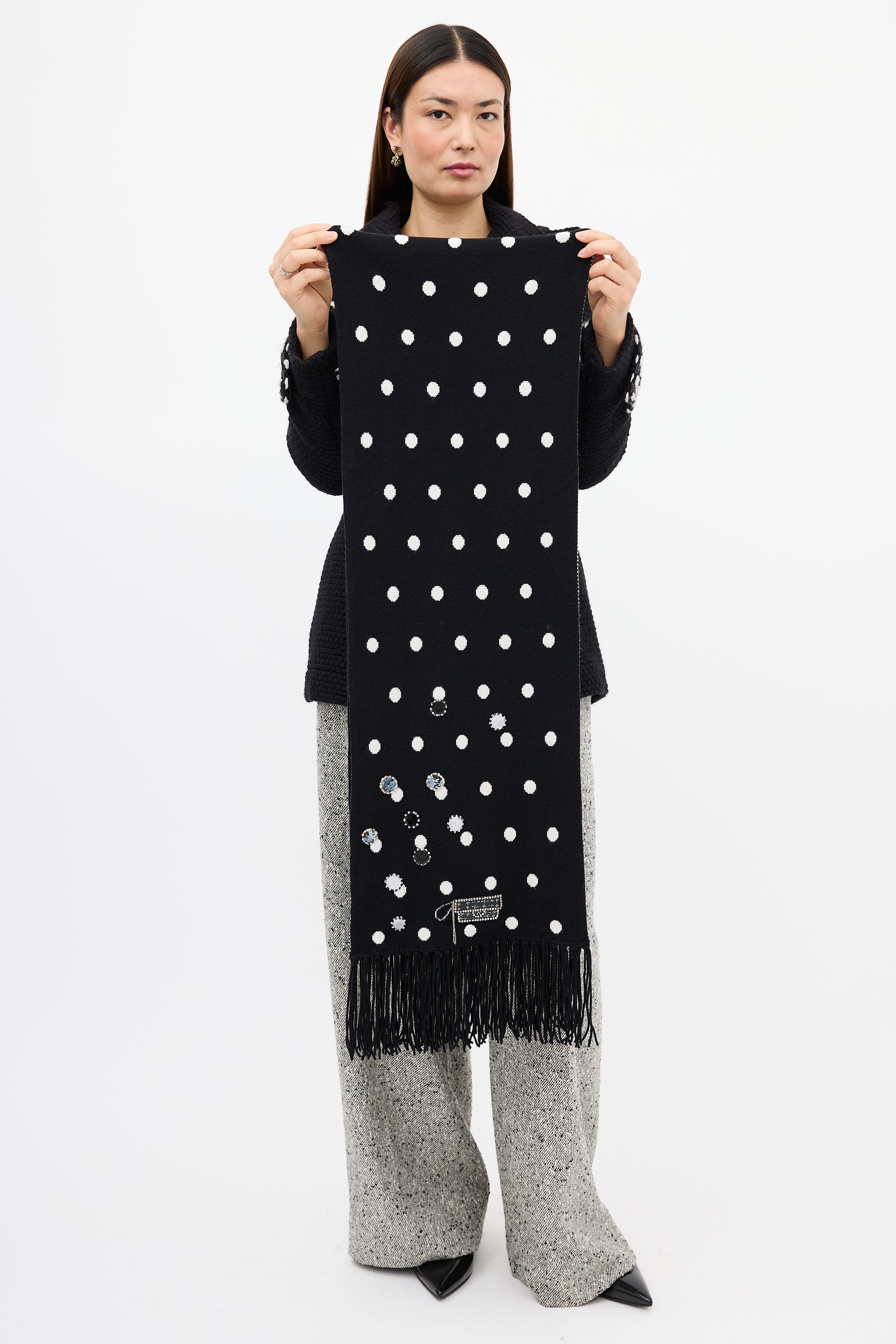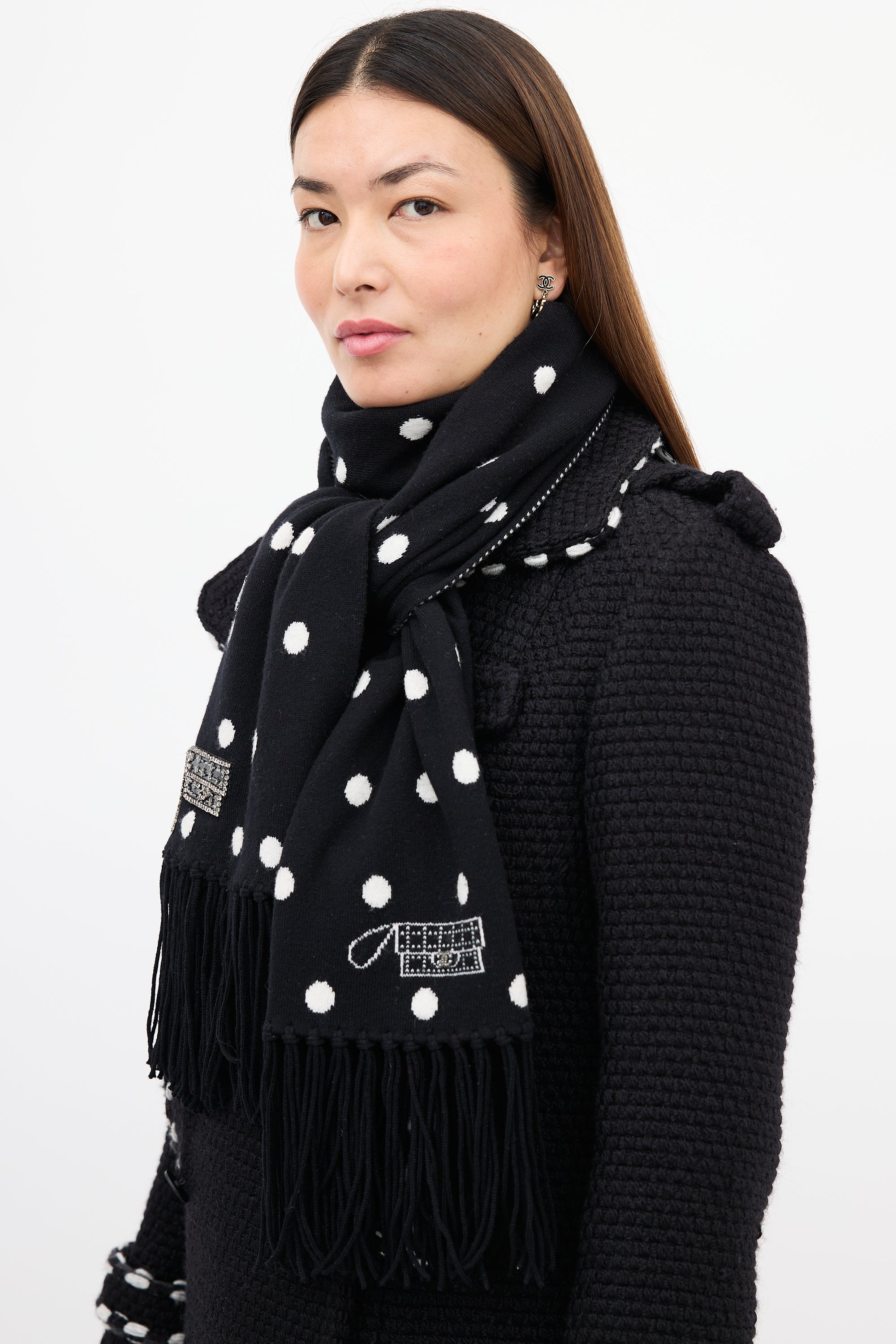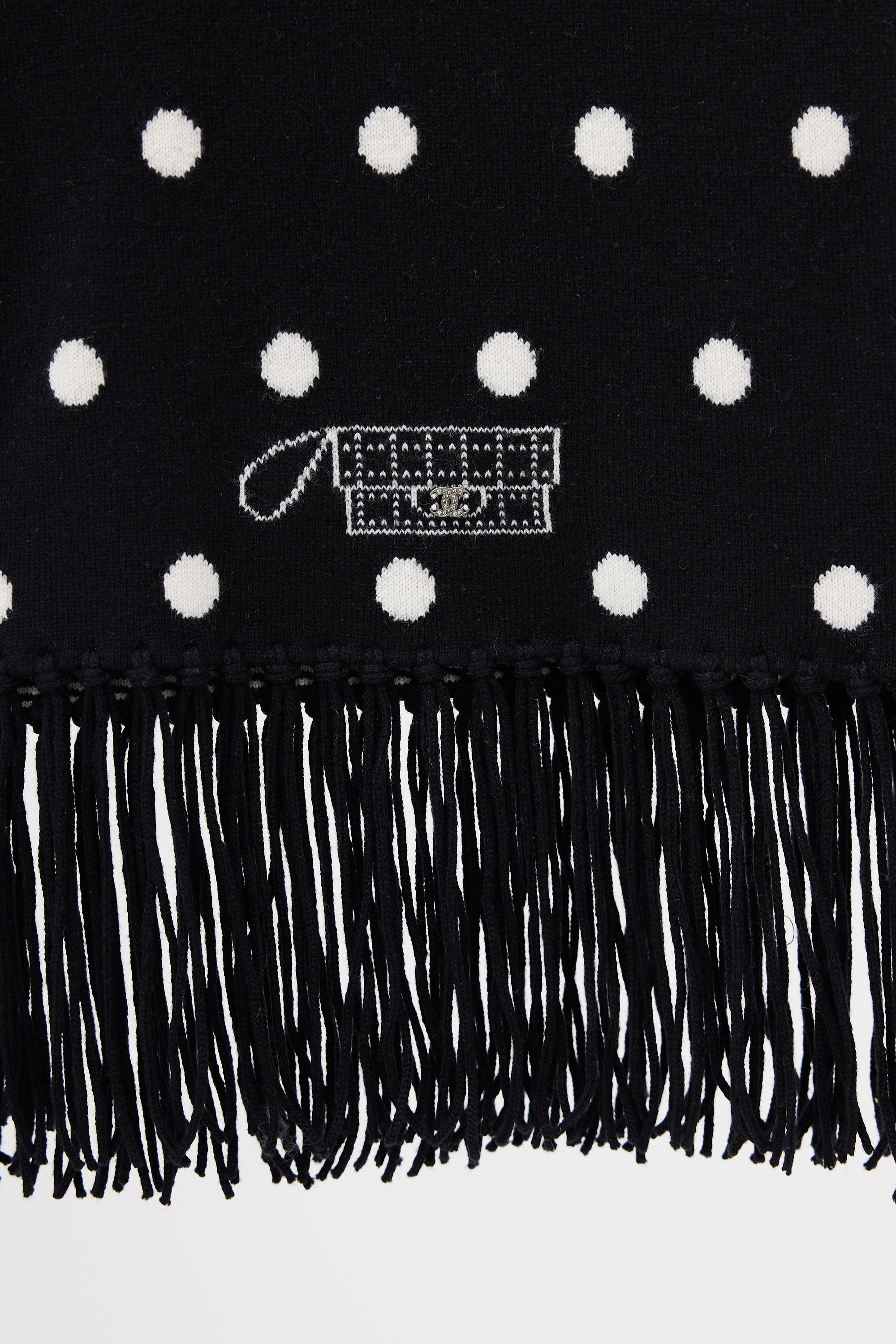 Pre-owned Chanel Fall 2008 black and white cashmere scarf featuring polka dot pattern on with embellishments at one side, stripes at reverse, and fringe at both ends.