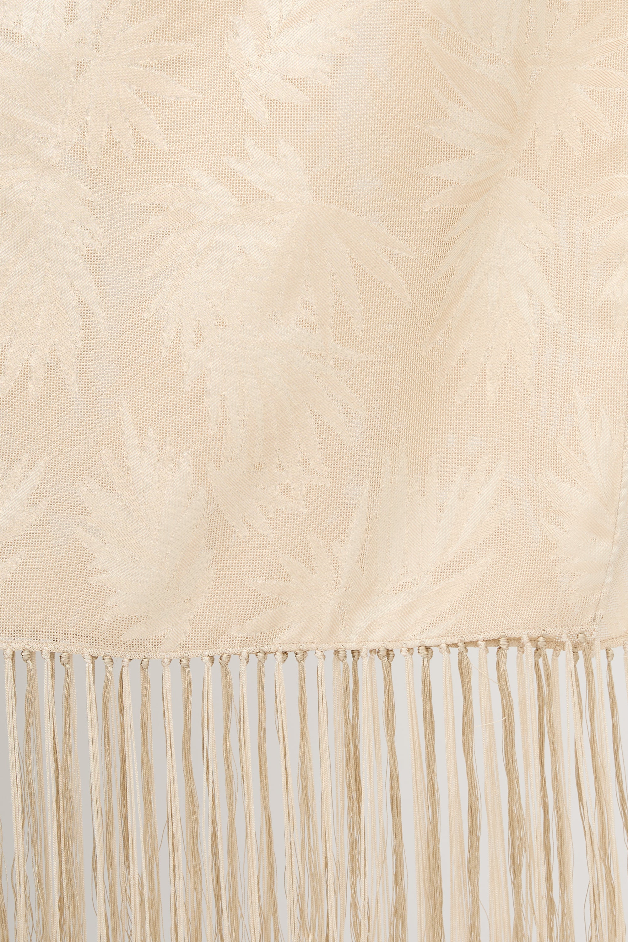 Pre-owned Salvatore Ferragamo beige silk sheer scarf featuring a tonal leaf print and fringe trim.