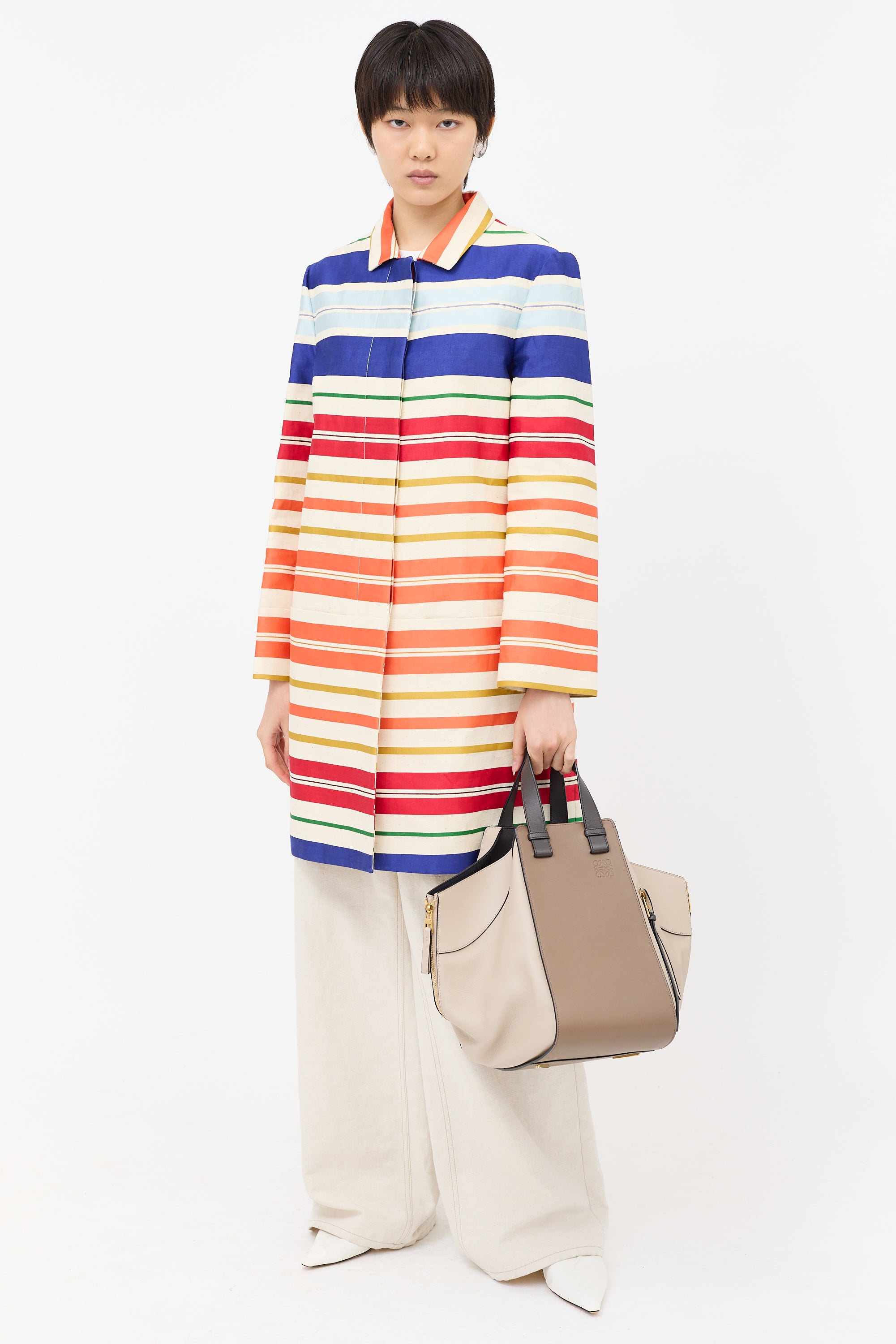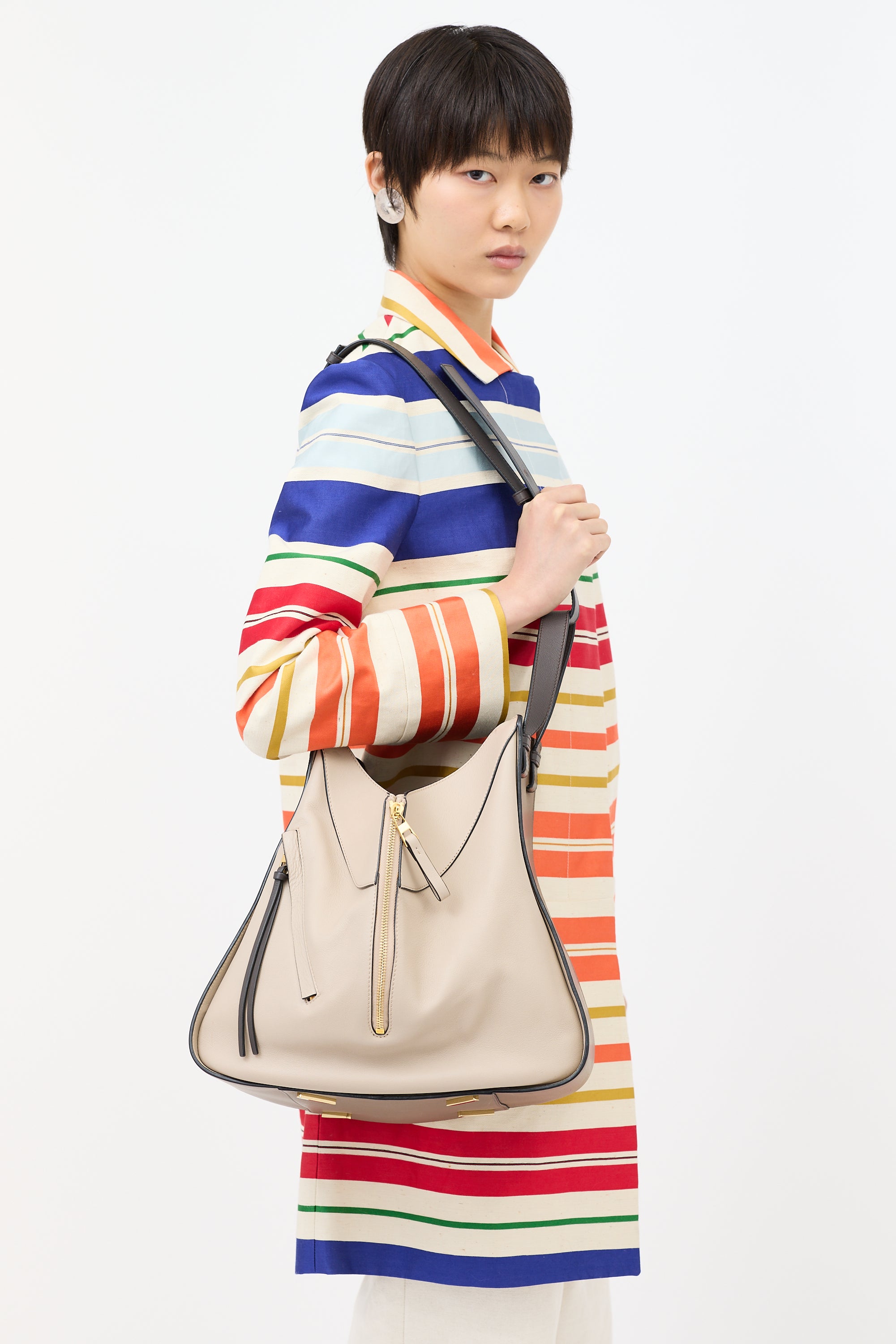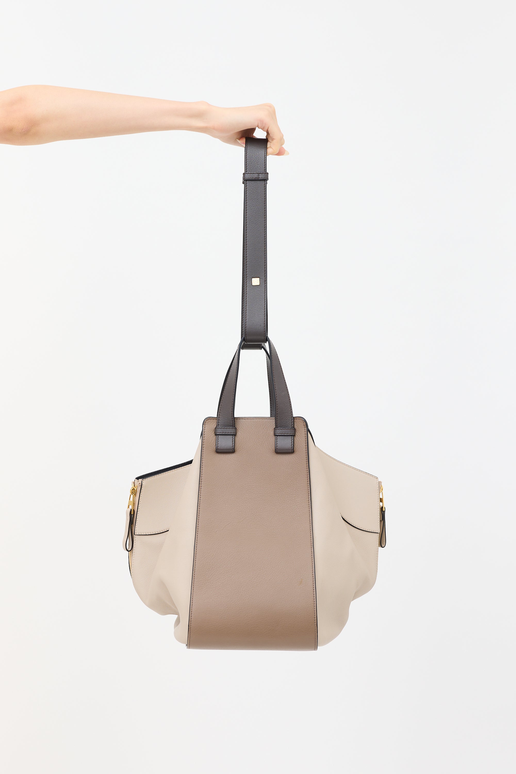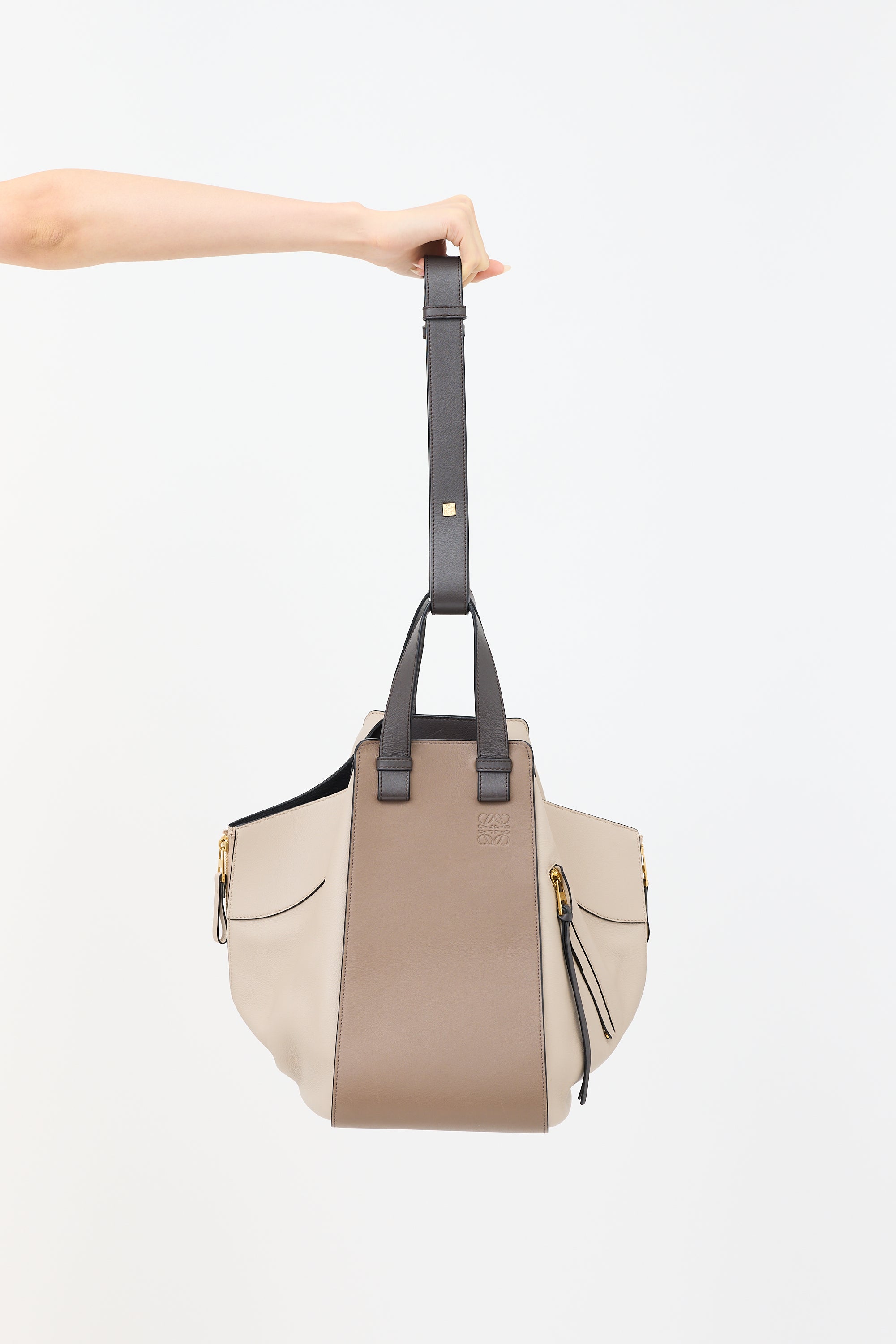 Pre-owned Loewe grey and cream leather medium Hammock bag featuring two flat brown leather top handles, gold tone hardware, one detachable and adjustable brown leather shoulder strap, one zip pocket at front, expandable zippered sides, debossed Anagram logo at front, four protective feet, open top compartment with black textile lining, and key ring at interior. Comes with original dust bag.