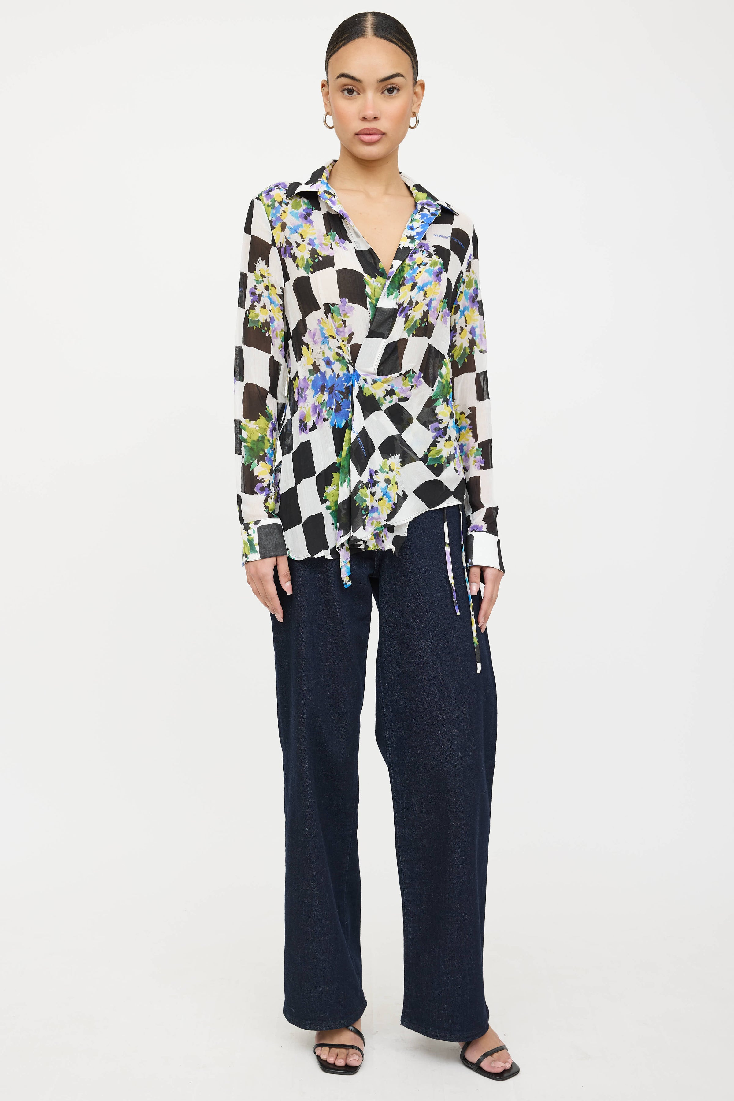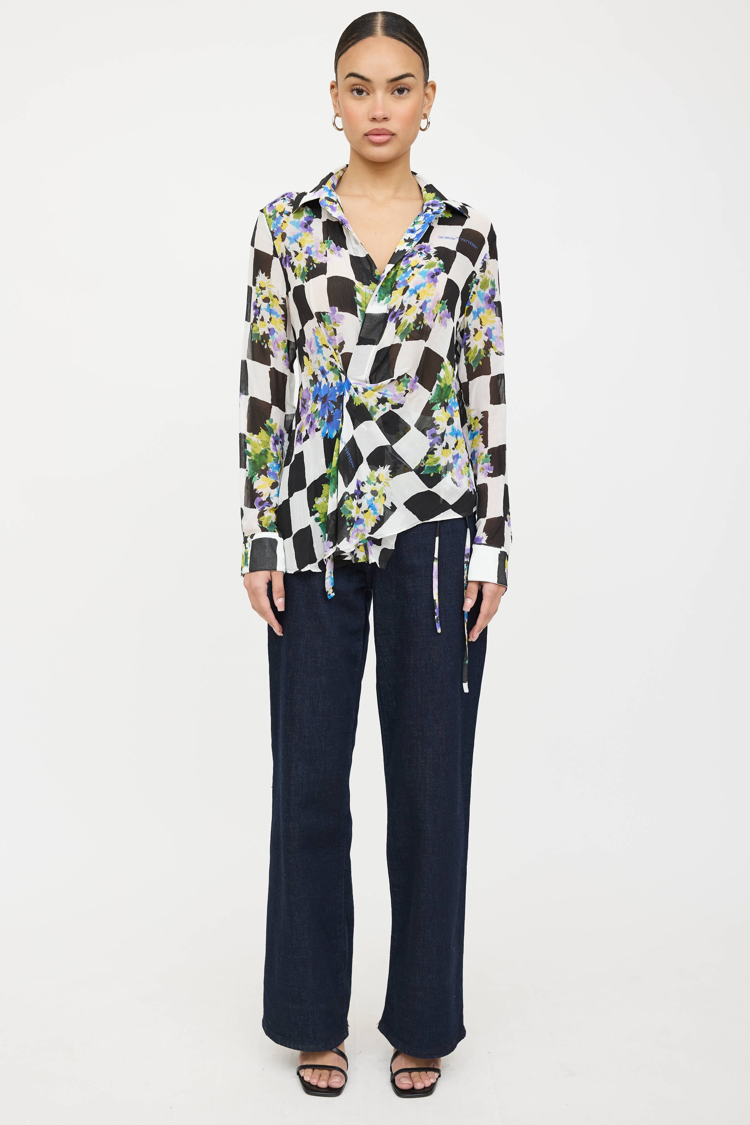 Pre-owned Off-White white sheer shirt featuring a multicolour floral checkerboard pattern throughout, pointed collar, long sleeves with buttoned cuffs, and gathered tie detail at waist.