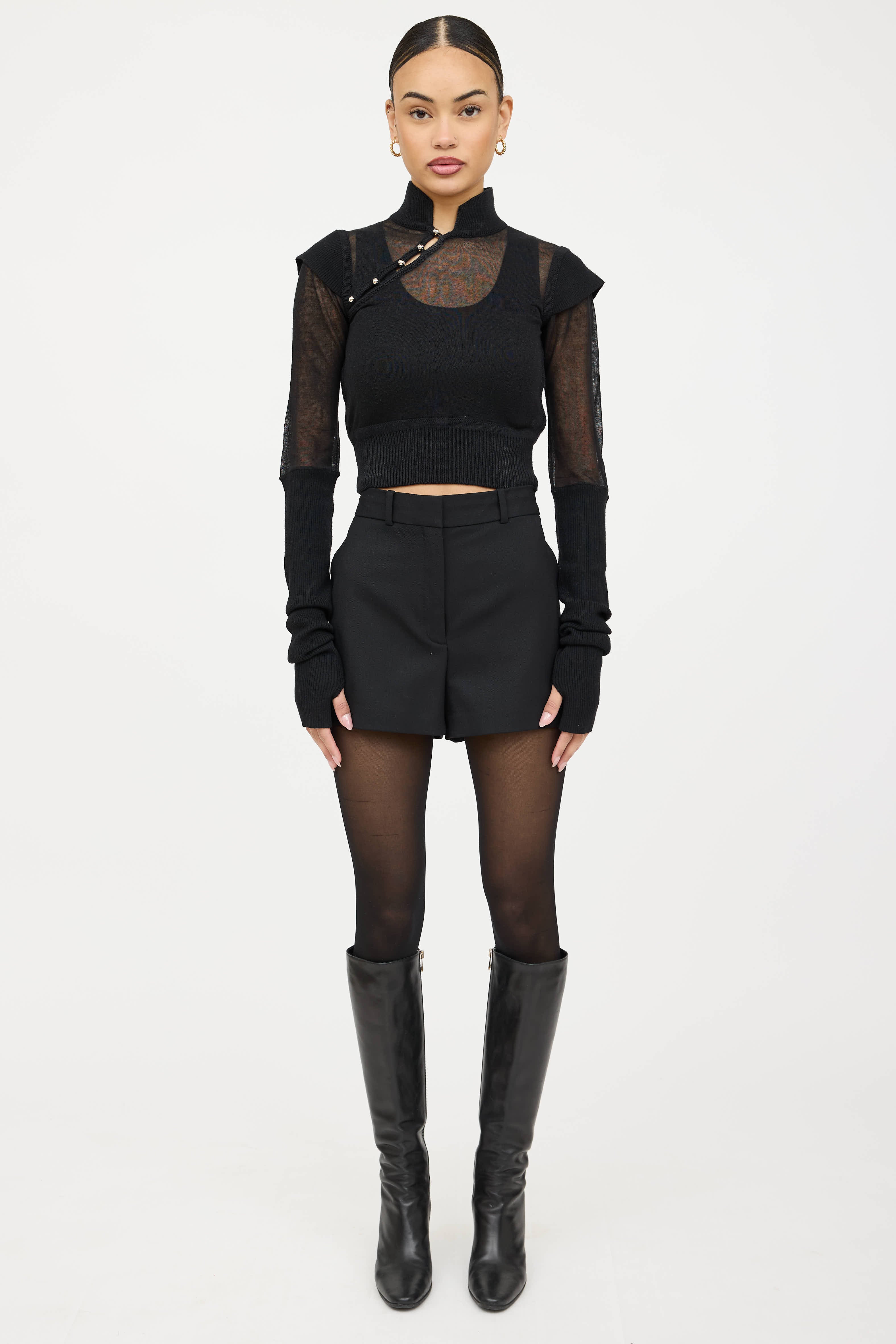 Pre-owned Private Policy black knit top featuring a mock neck collar, long sleeves with extended cuffs, sheer layered detailing at bust, asymmetrical button detailing at shoulder, and ribbed hem.