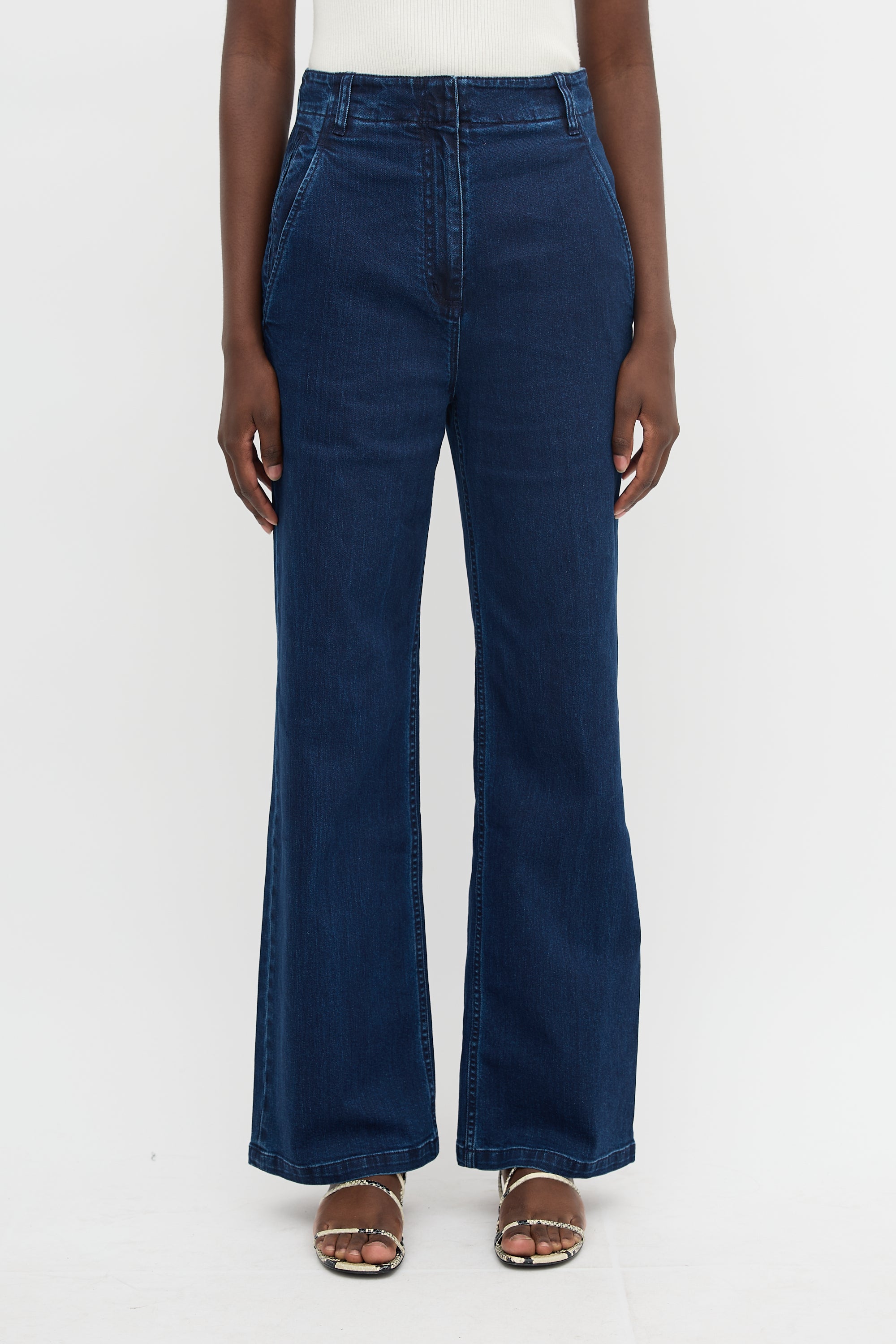Pre-owned Tibi indigo Barry jeans featuring adjustable high waist, straight leg, five pocket styling, and zip fly.