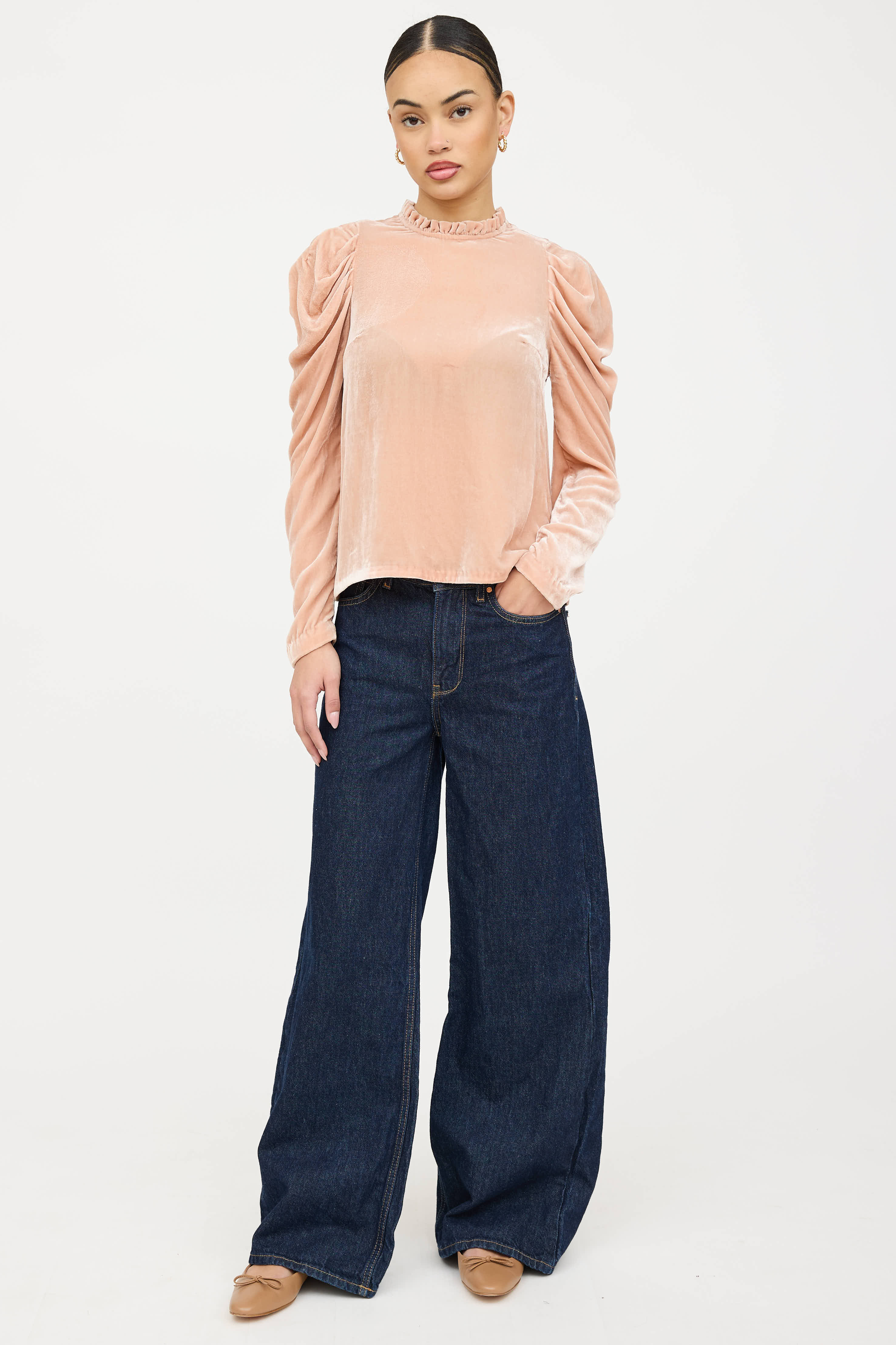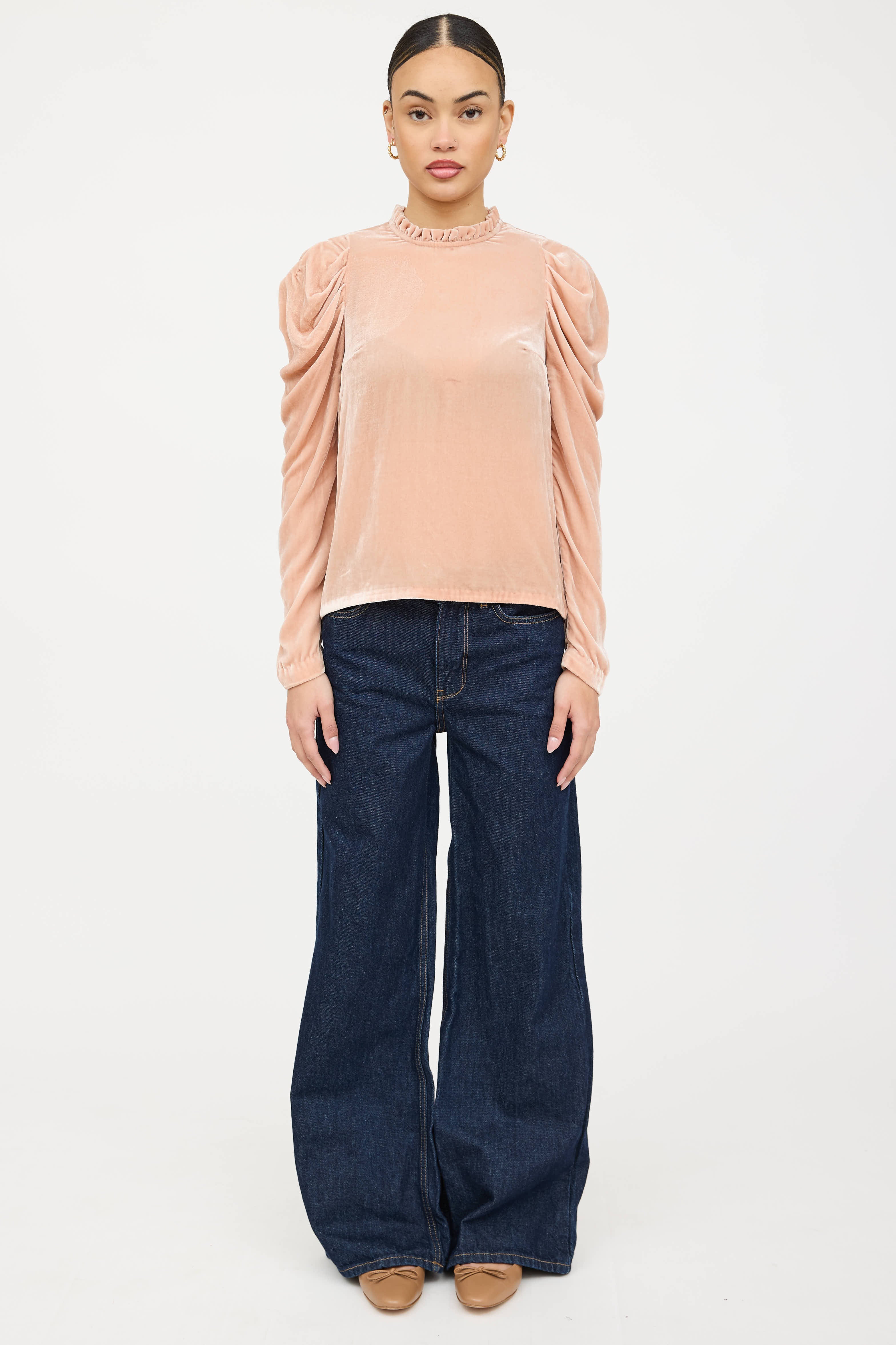 Pre-owned Ulla Johnson pink velvet top featuring a round ruffled neckline, long gathered sleeves, darted bust, and button closure at back.