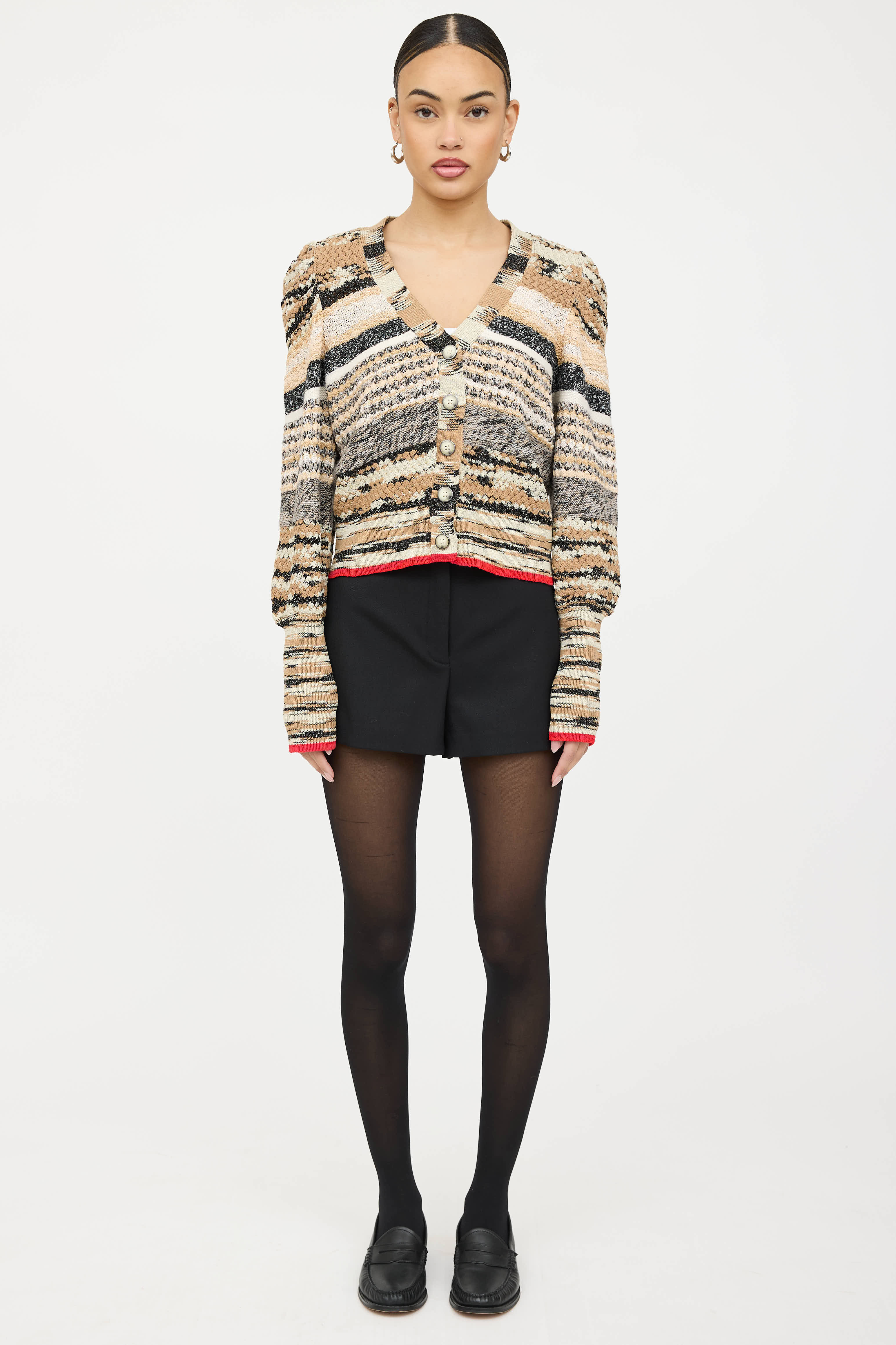 Pre-owned Veronica Beard beige Cecily knit cardigan featuring a multicolour marbled woven pattern throughout, V-neckline, long sleeves, and ribbed hem.