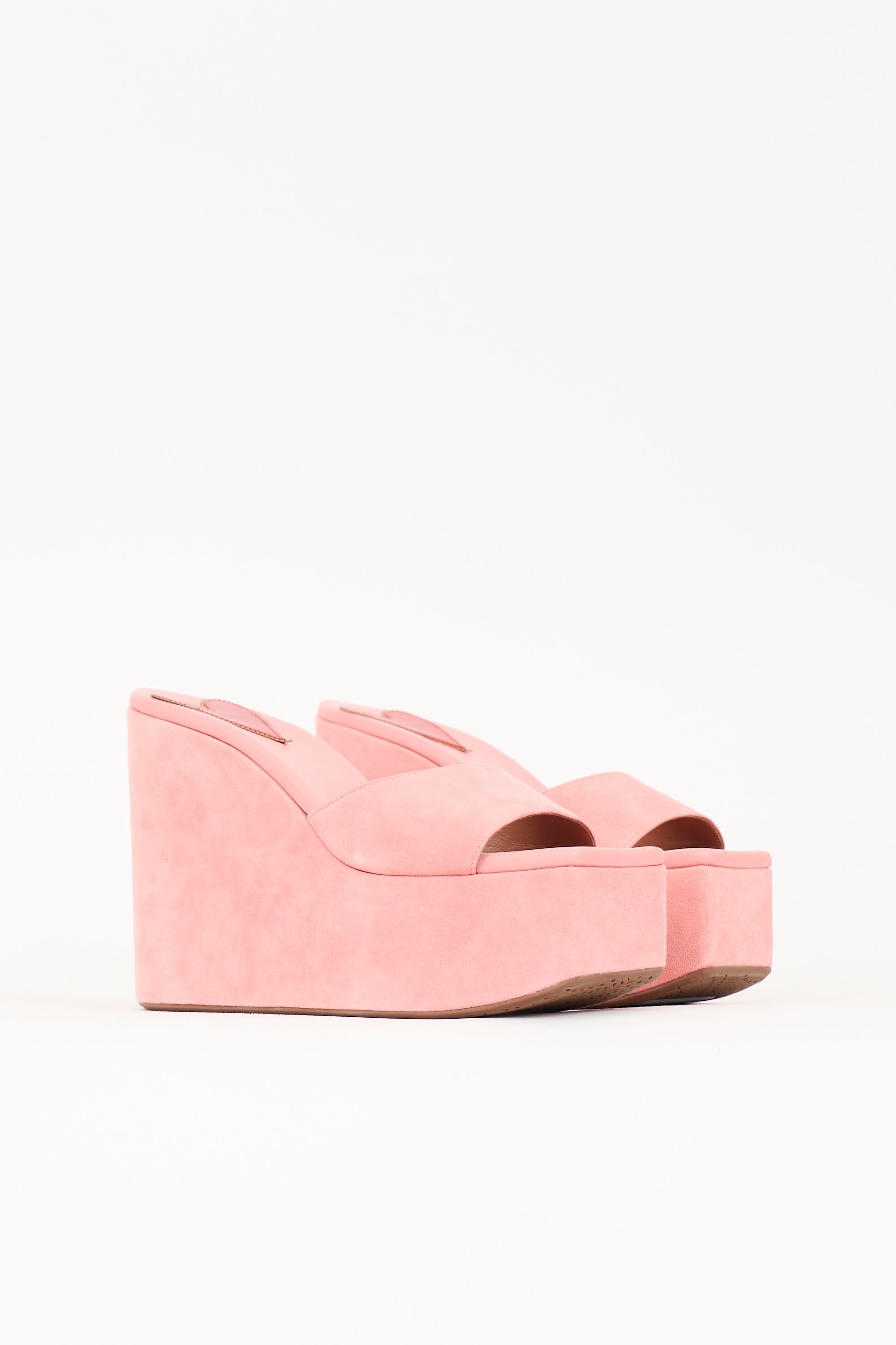 Pre-owned Alaïa pink suede sandals featuring open square toe, pointed heel counter, and wedge heel.