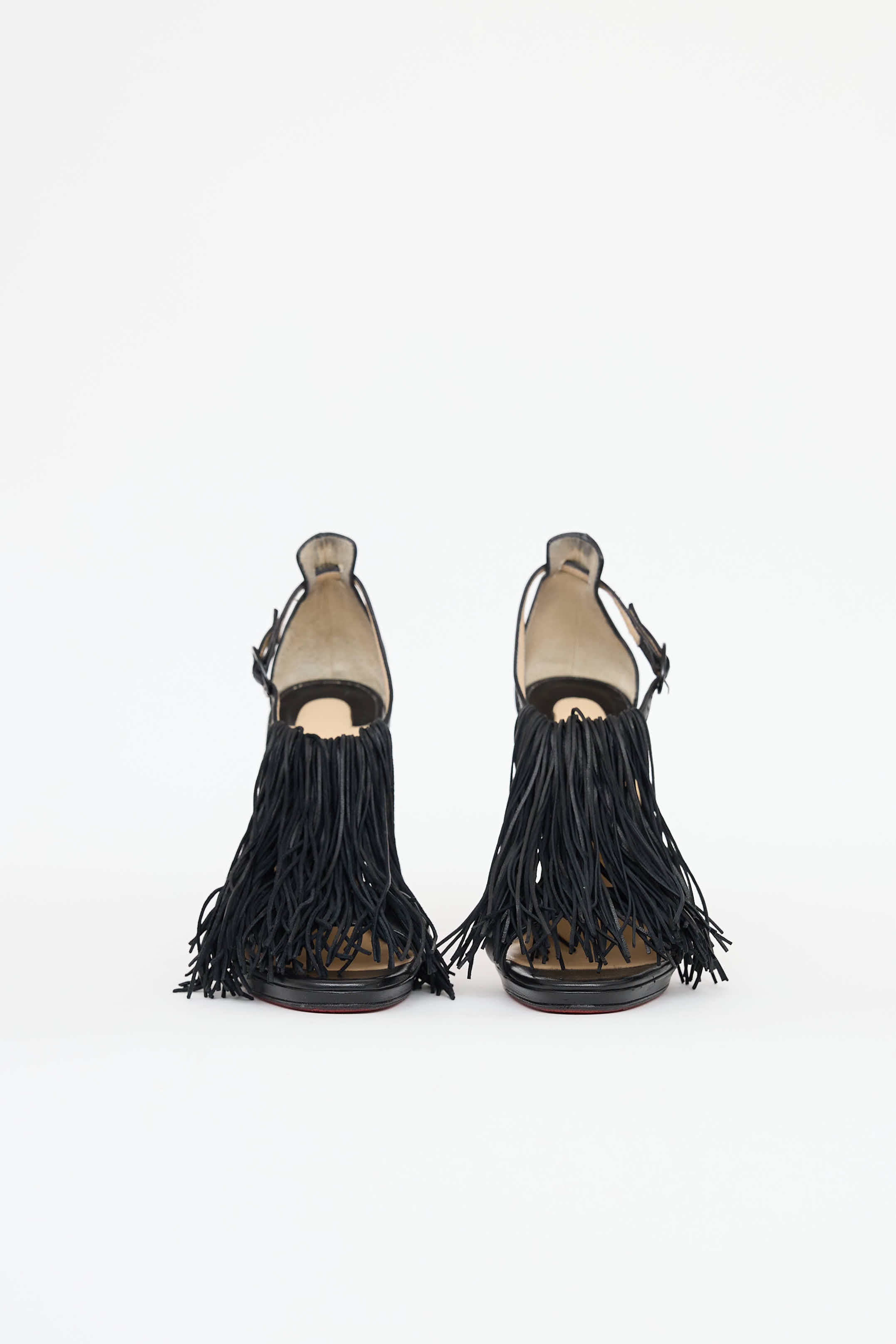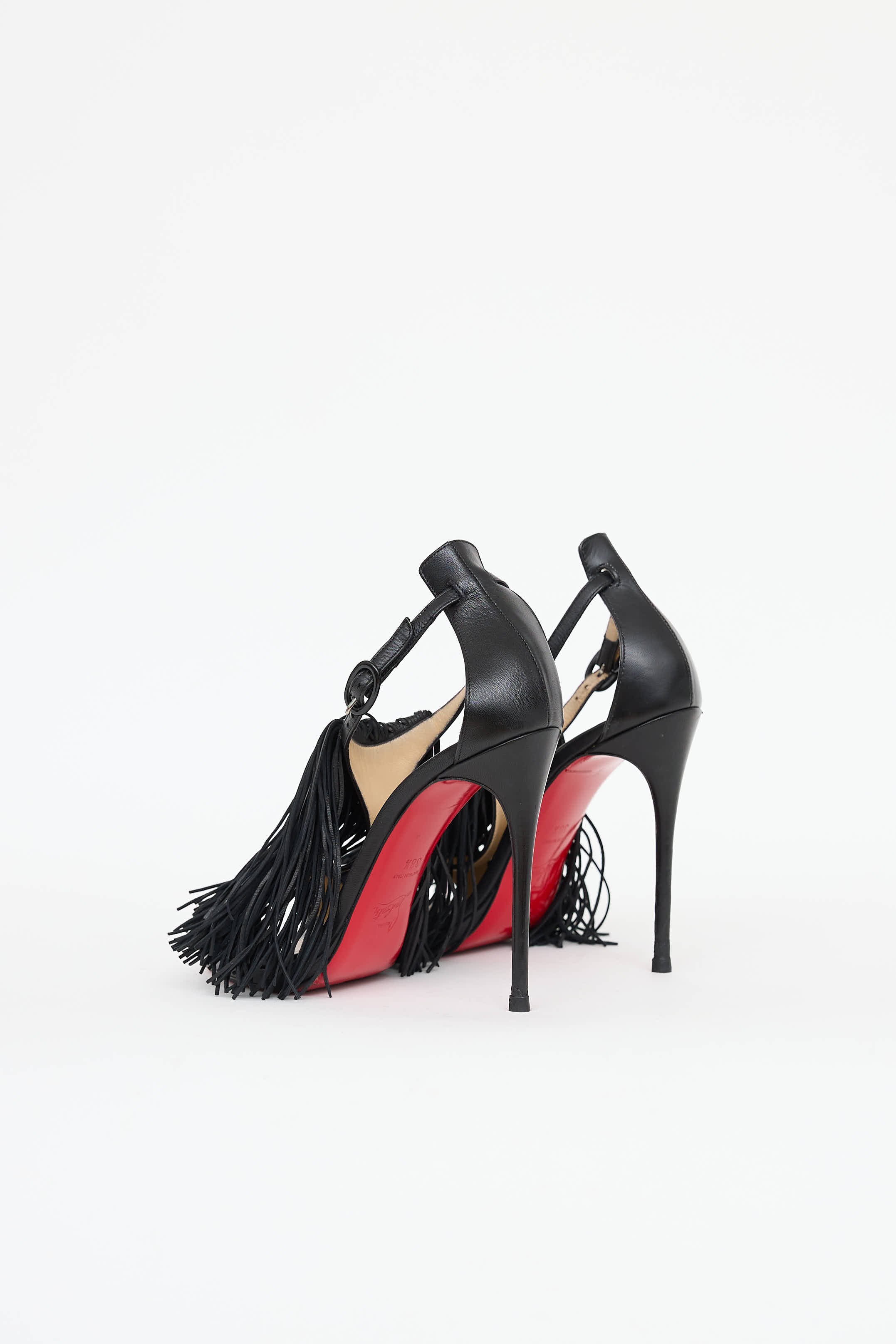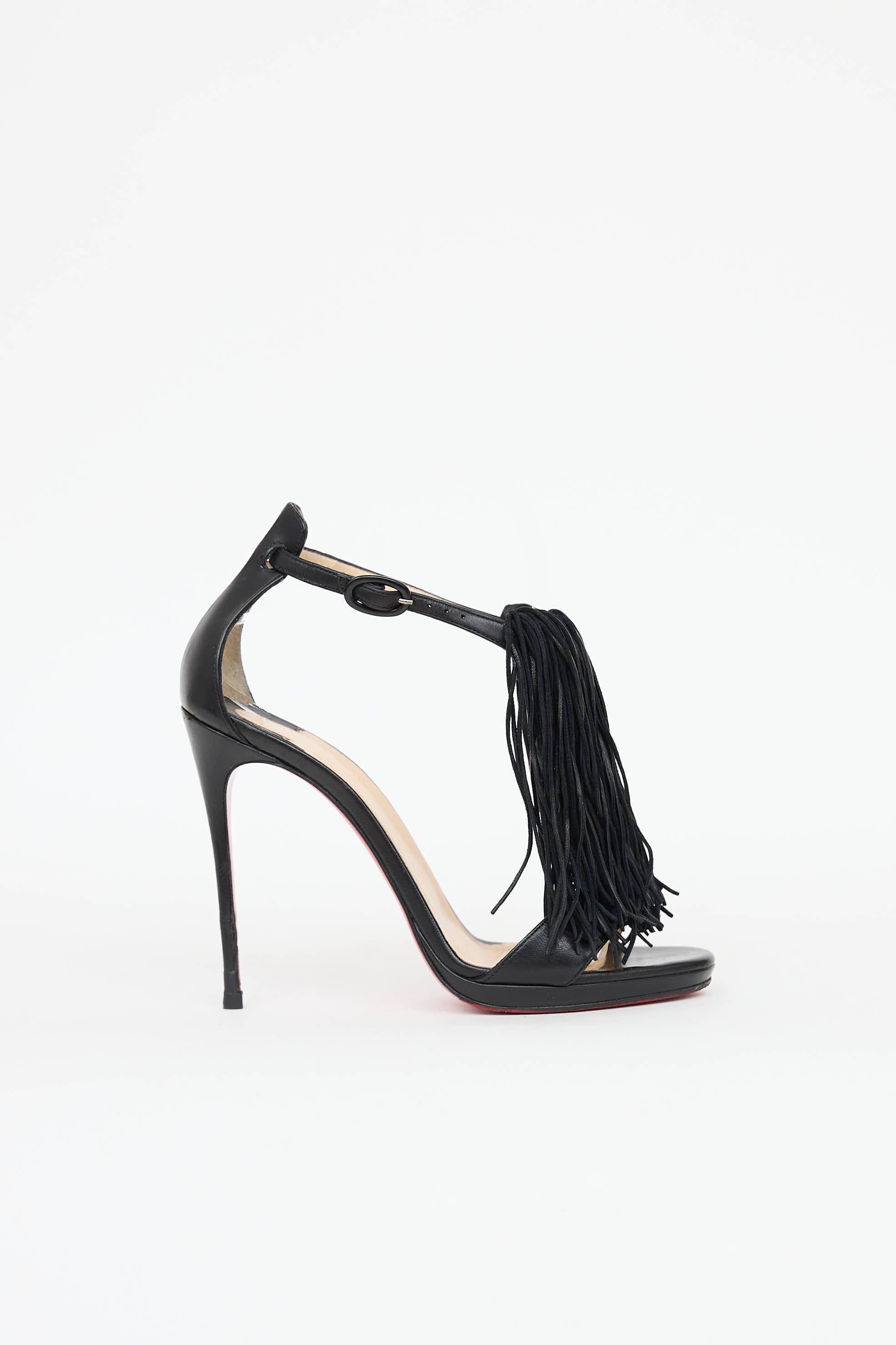 Pre-owned Christian Louboutin black Casanovella sandal featuring an almond open toe, leather uppers, T-strap with fringe detailing, adjustable buckle at ankle strap, covered stiletto heel, and signature red lacquered outsole.