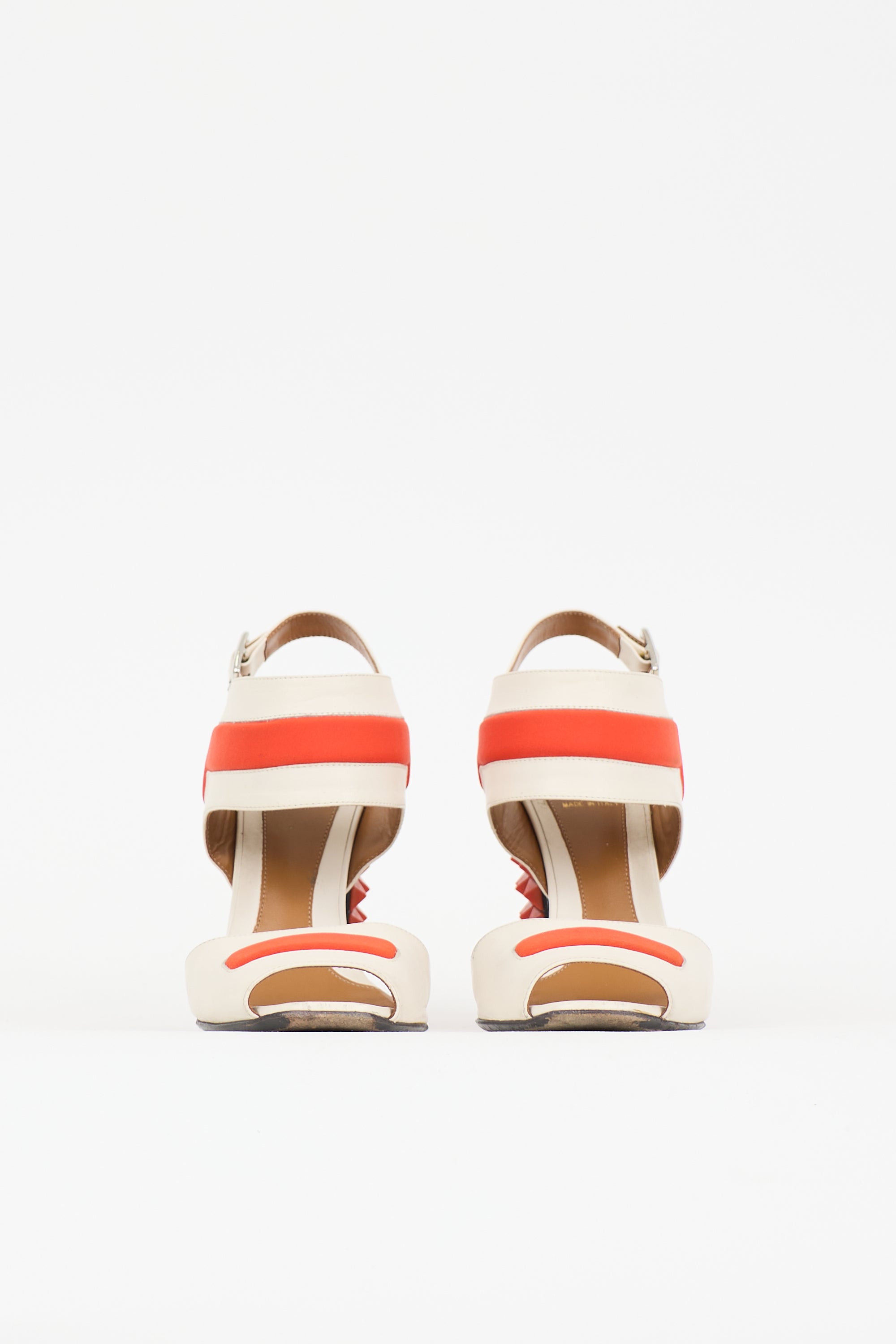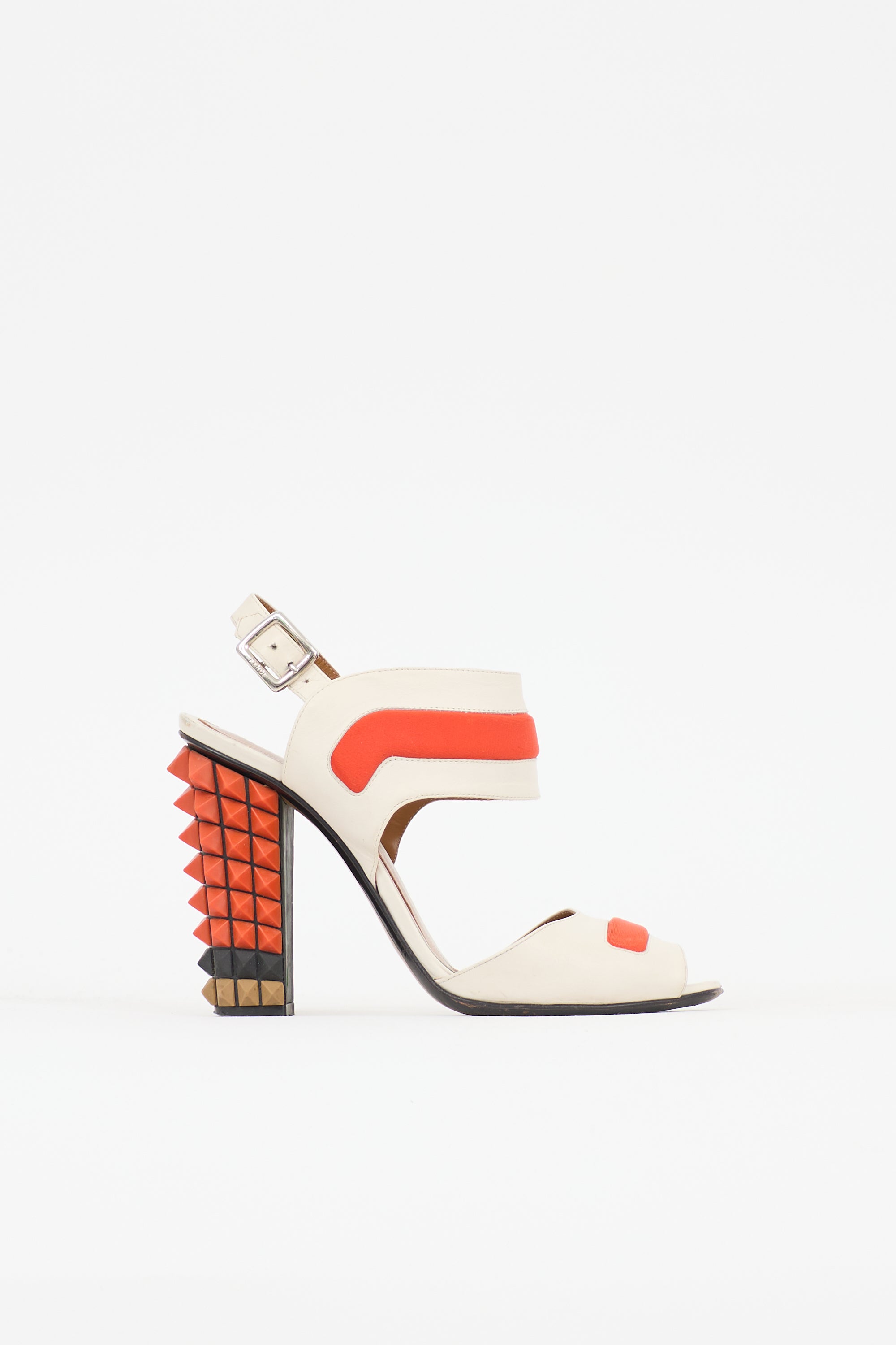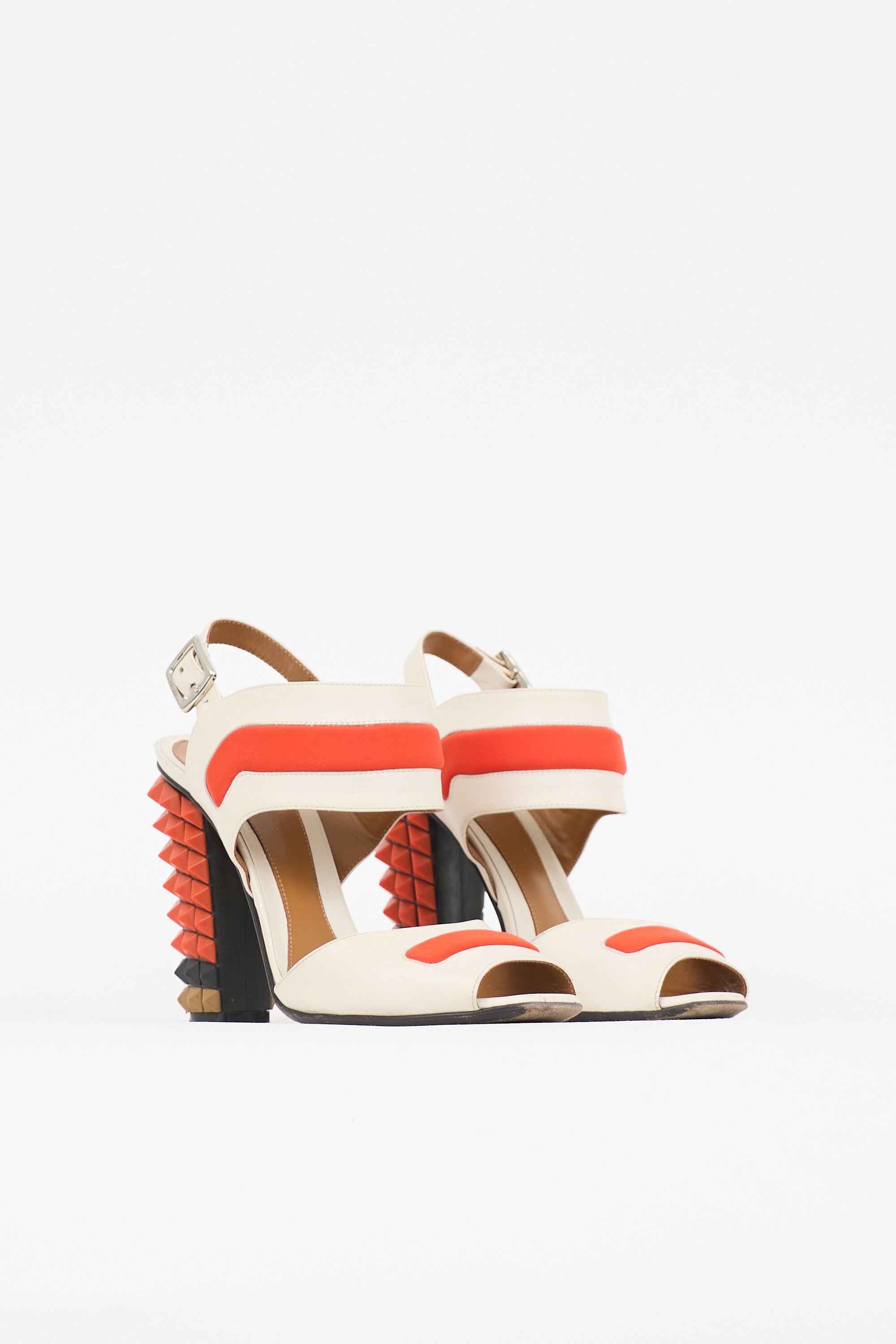 Pre-owned Fendi beige leather Polifonia sandals featuring square peep toe, orange neoprene panels, adjustable ankle strap, and block heel with multicolour rubber stud embellishment.