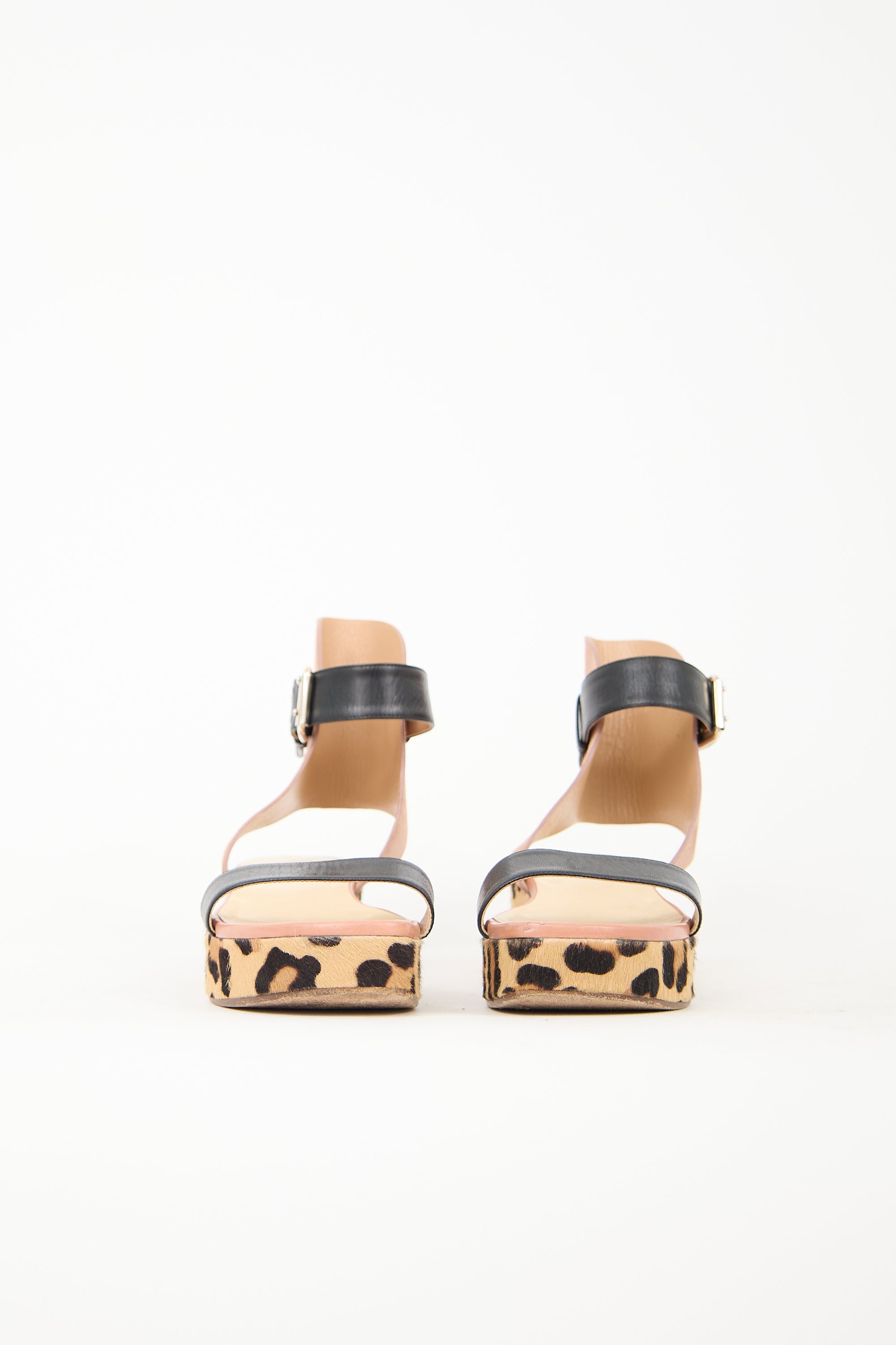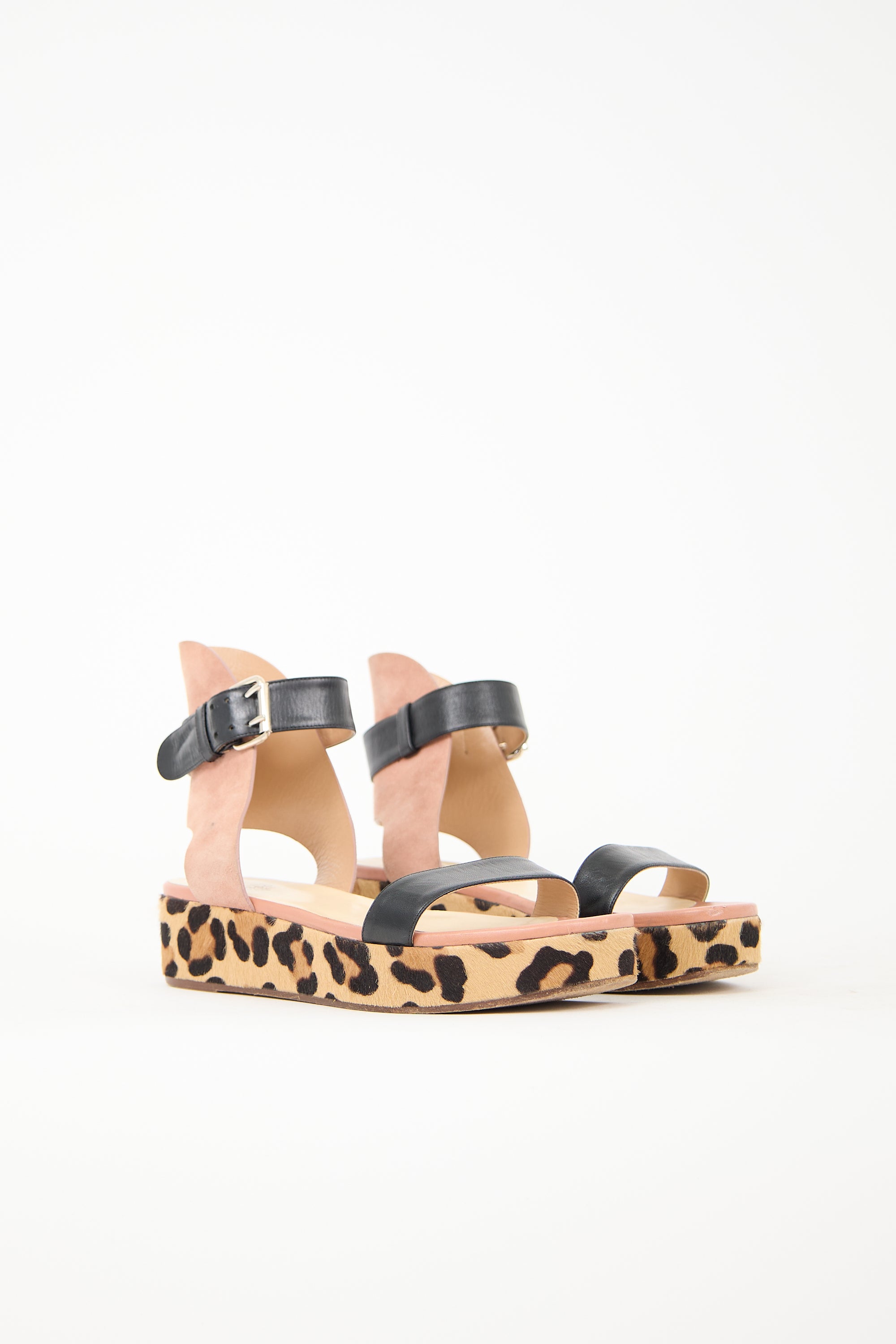 Pre-owned Francesco Russo black and pink sandals featuring leather and suede paneled uppers, a squared toe, strap across vamp, covered counter with adjustable ankle strap, silver tone buckle fastening, and a leopard printed goat hair platform sole.