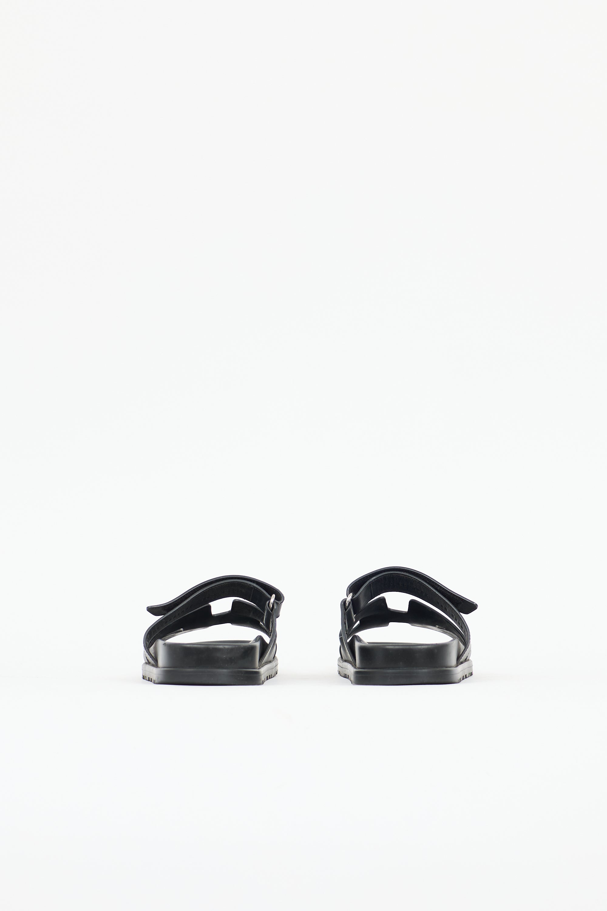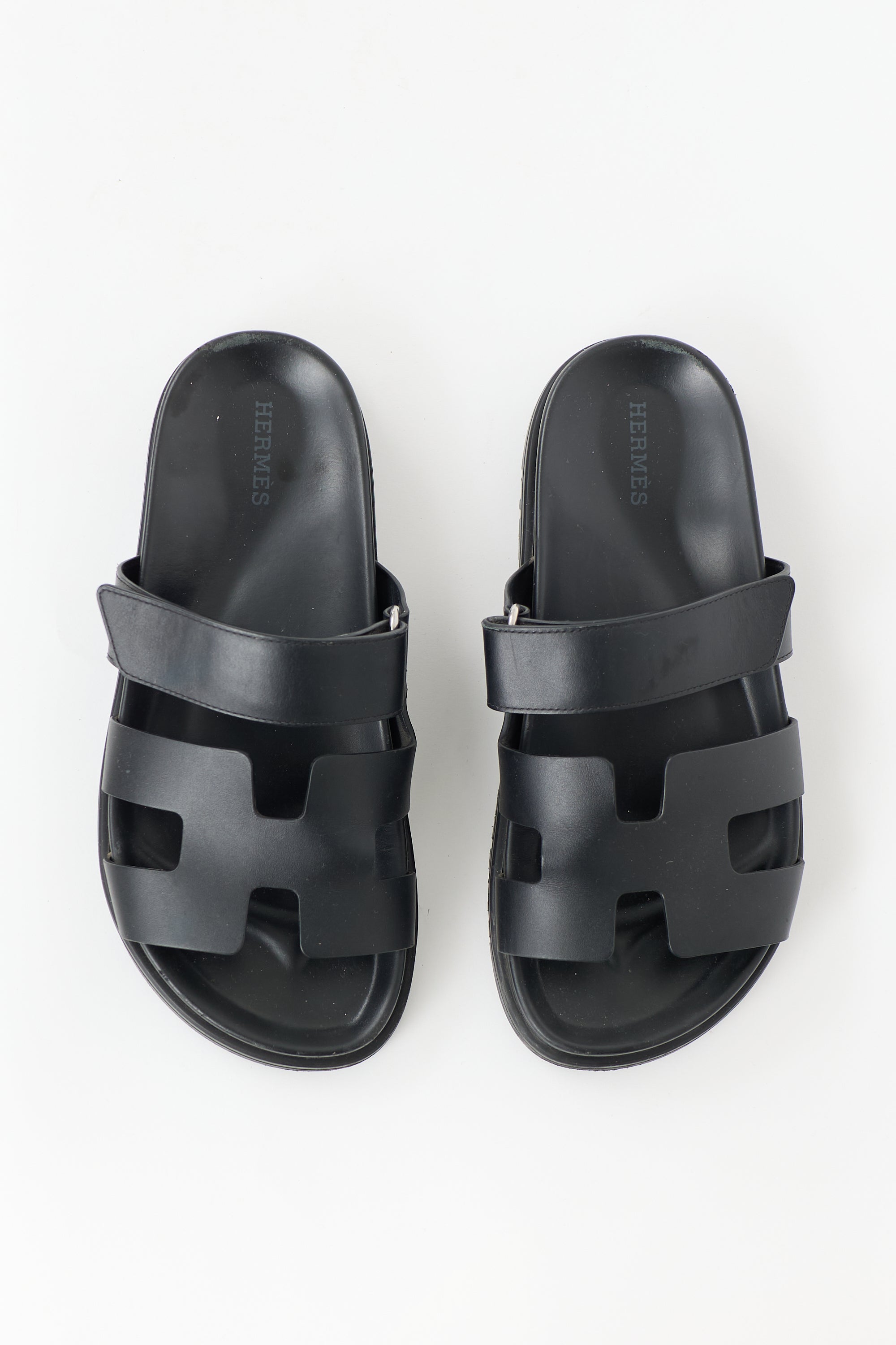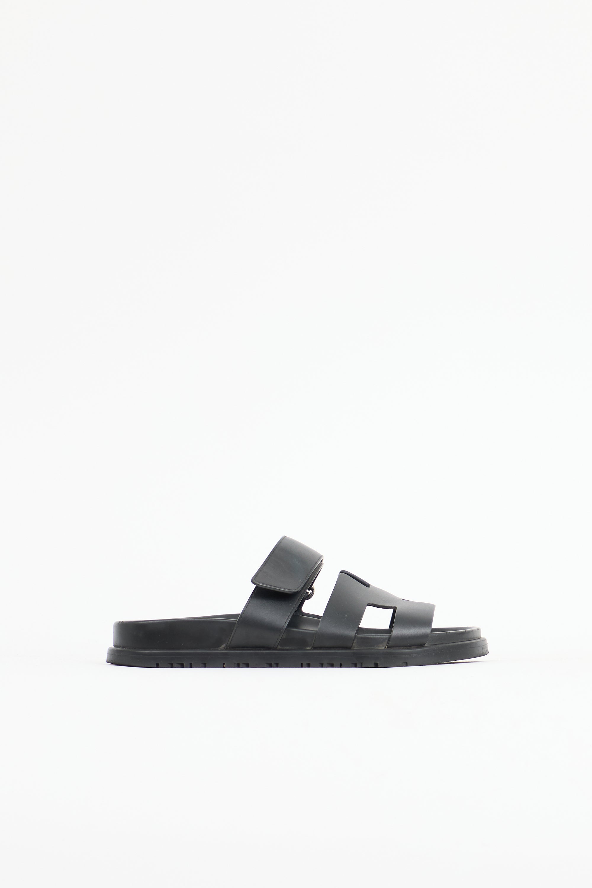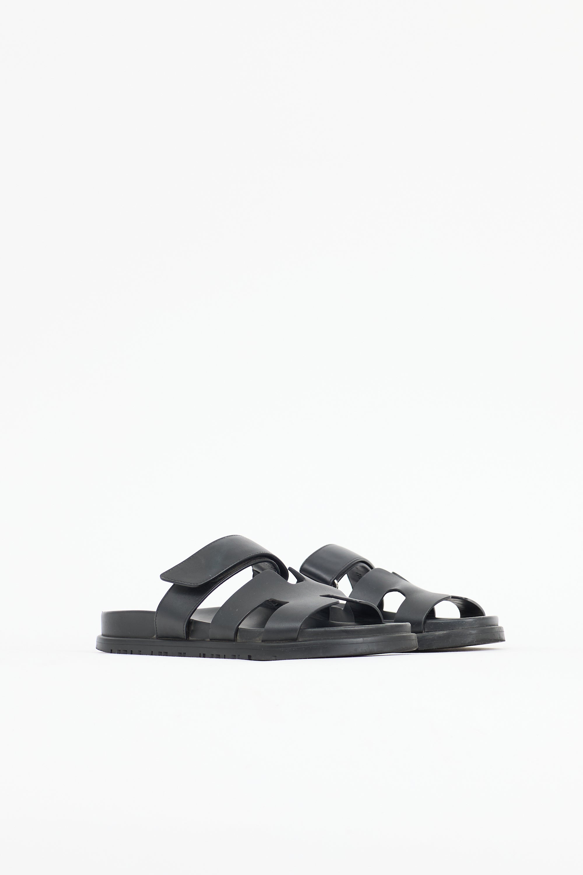 Pre-owned Hermès black leather Chypre sandals featuring an open rounded toe, cut out H motif, adjustable Velcro strap at vamp, leather insole, and slip on entry. Includes original dust bags.