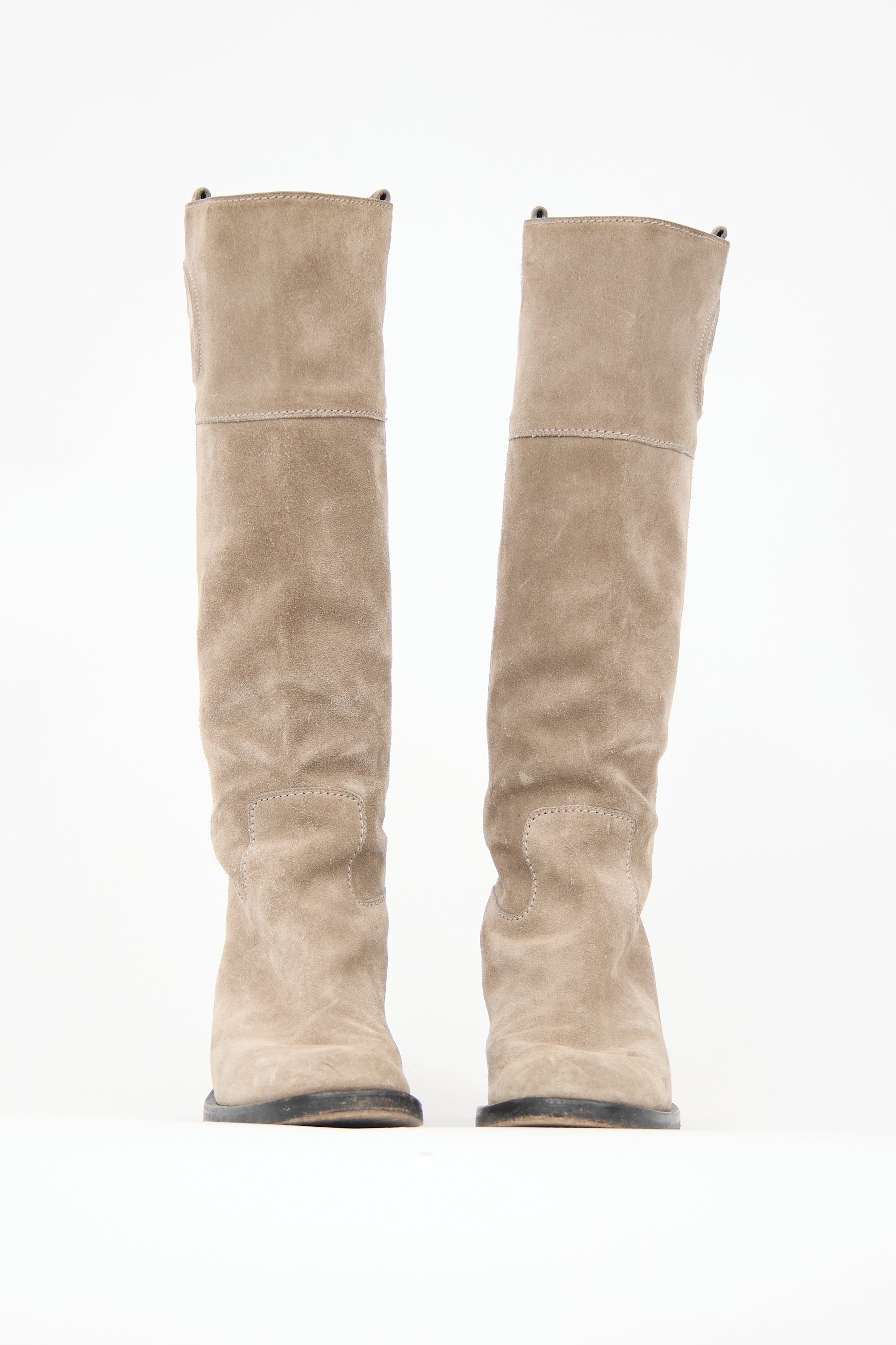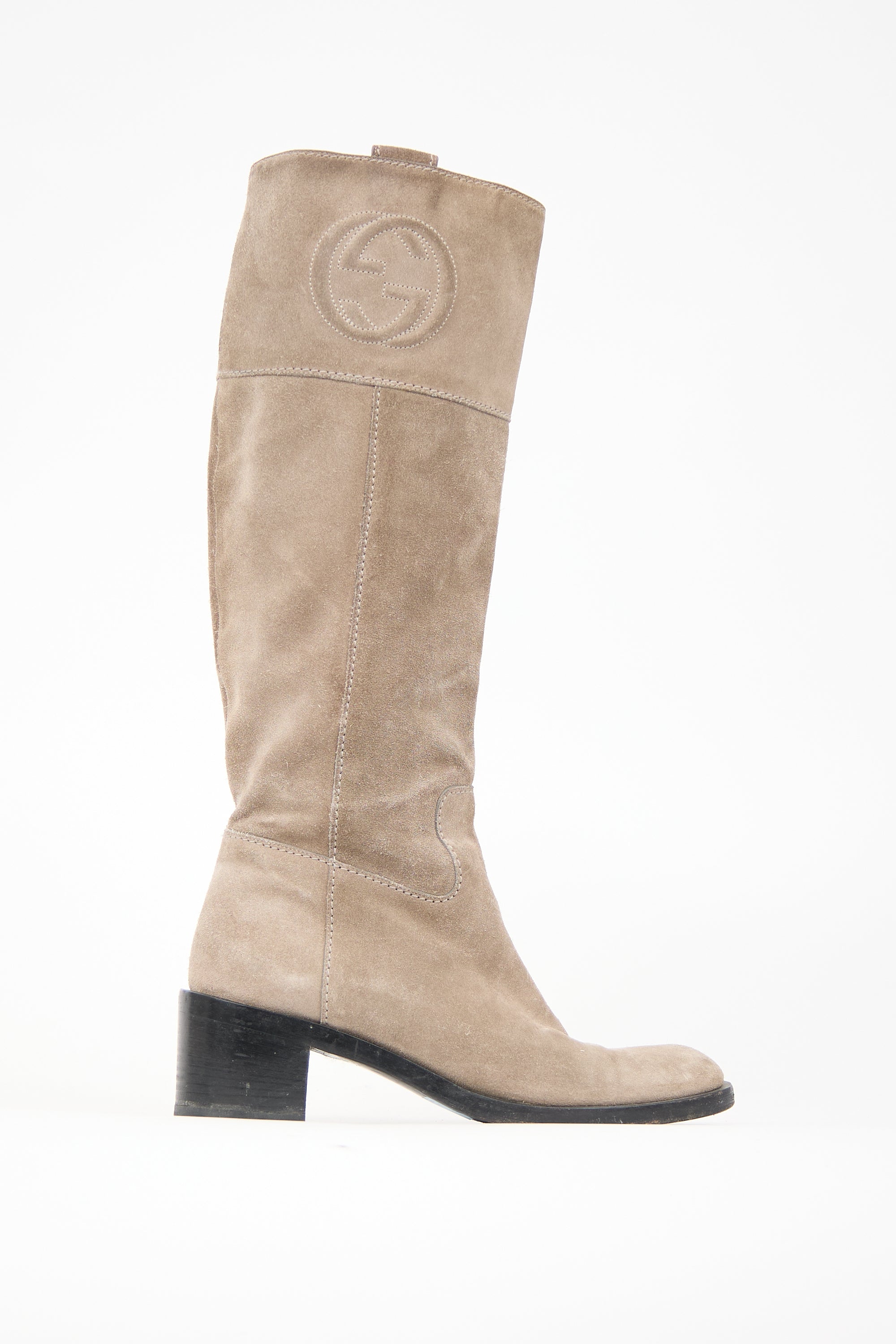 Pre-owned Gucci grey suede knee high boots featuring a rounded toe, stitched interlocking GG at collar, two interior pull tabs, and a stacked block heel.