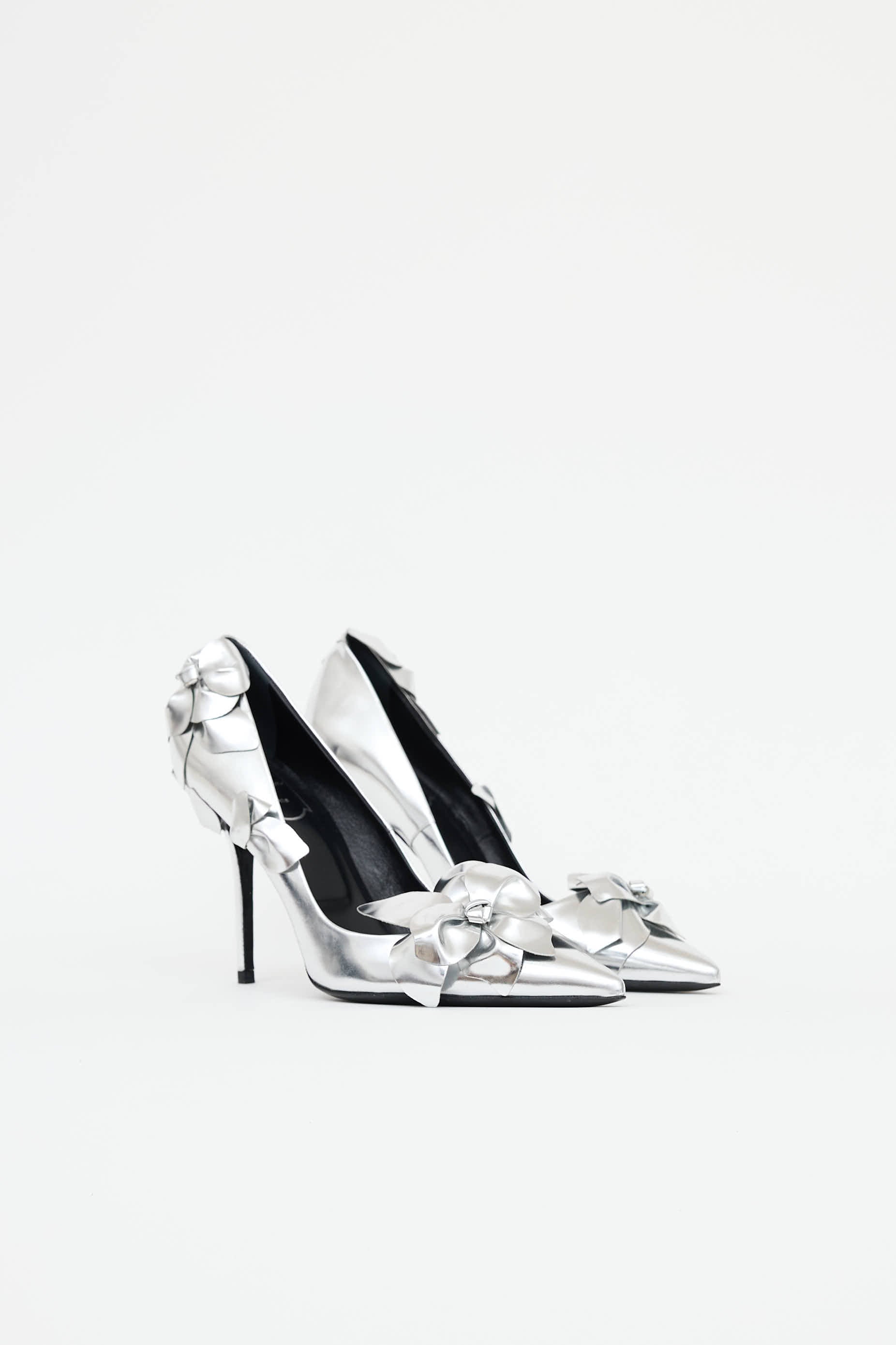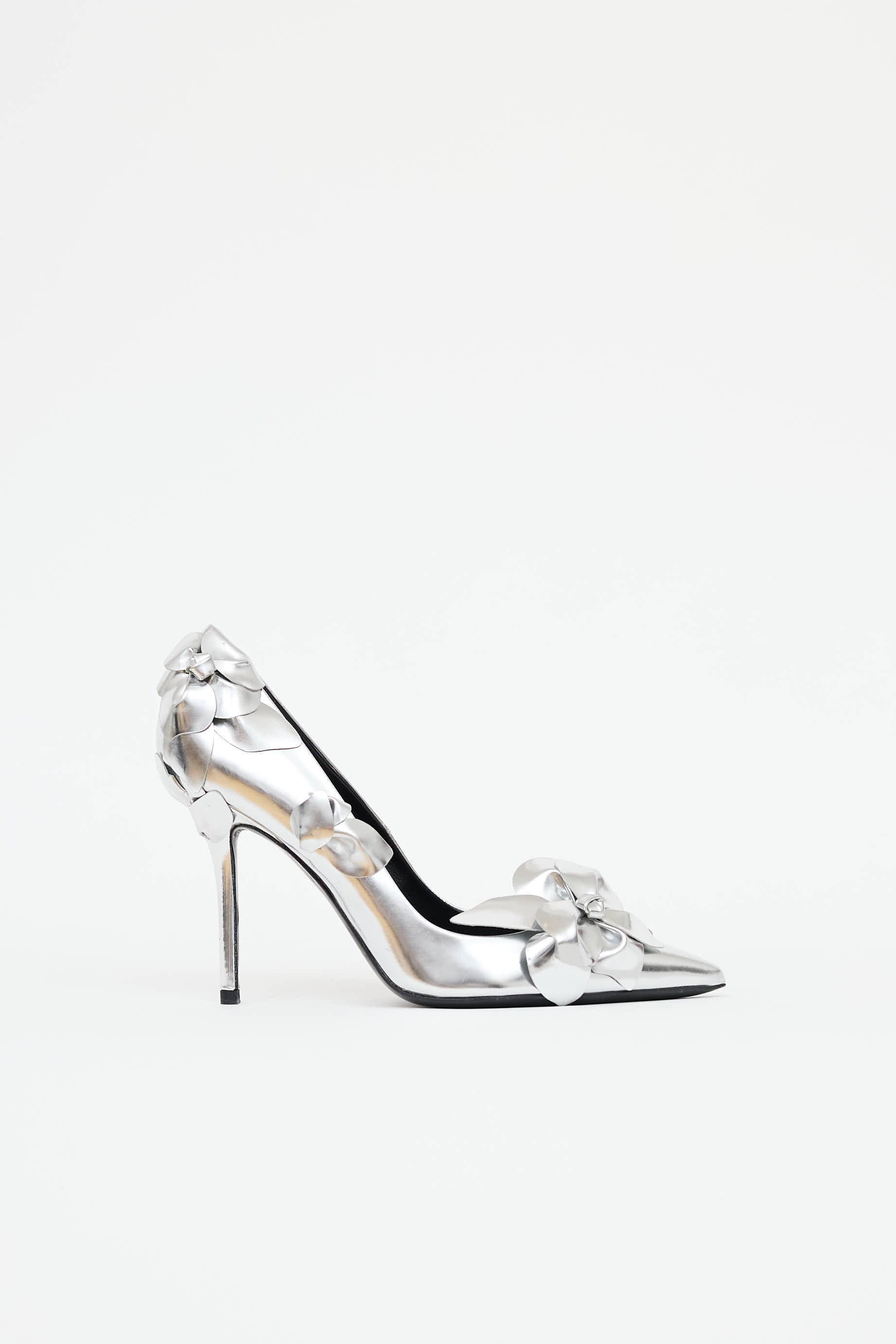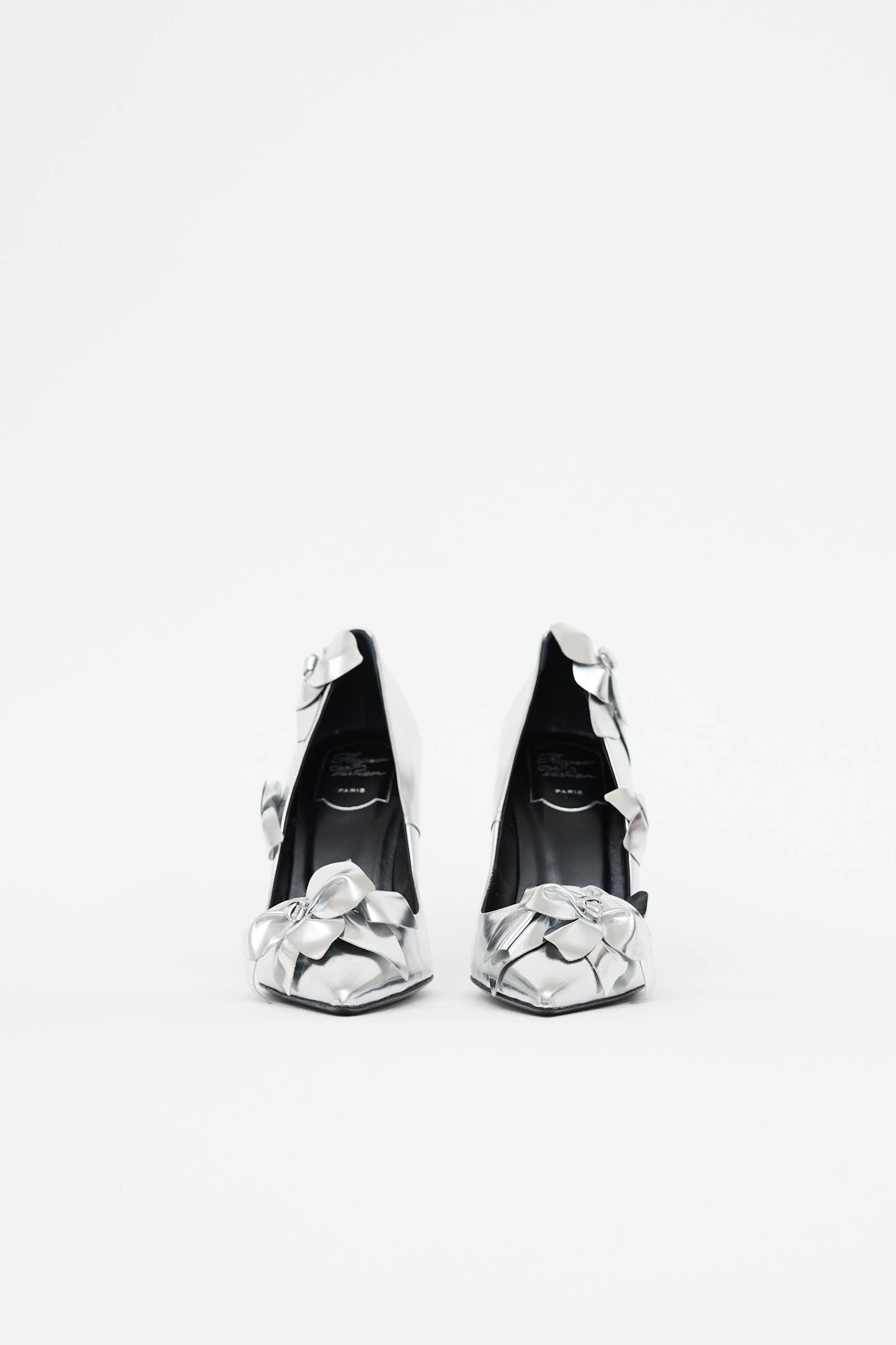 Pre-owned Roger Vivier silver pumps featuring a pointed toe, slip on entry, metallic upper with floral embellishments and a covered stiletto heel.