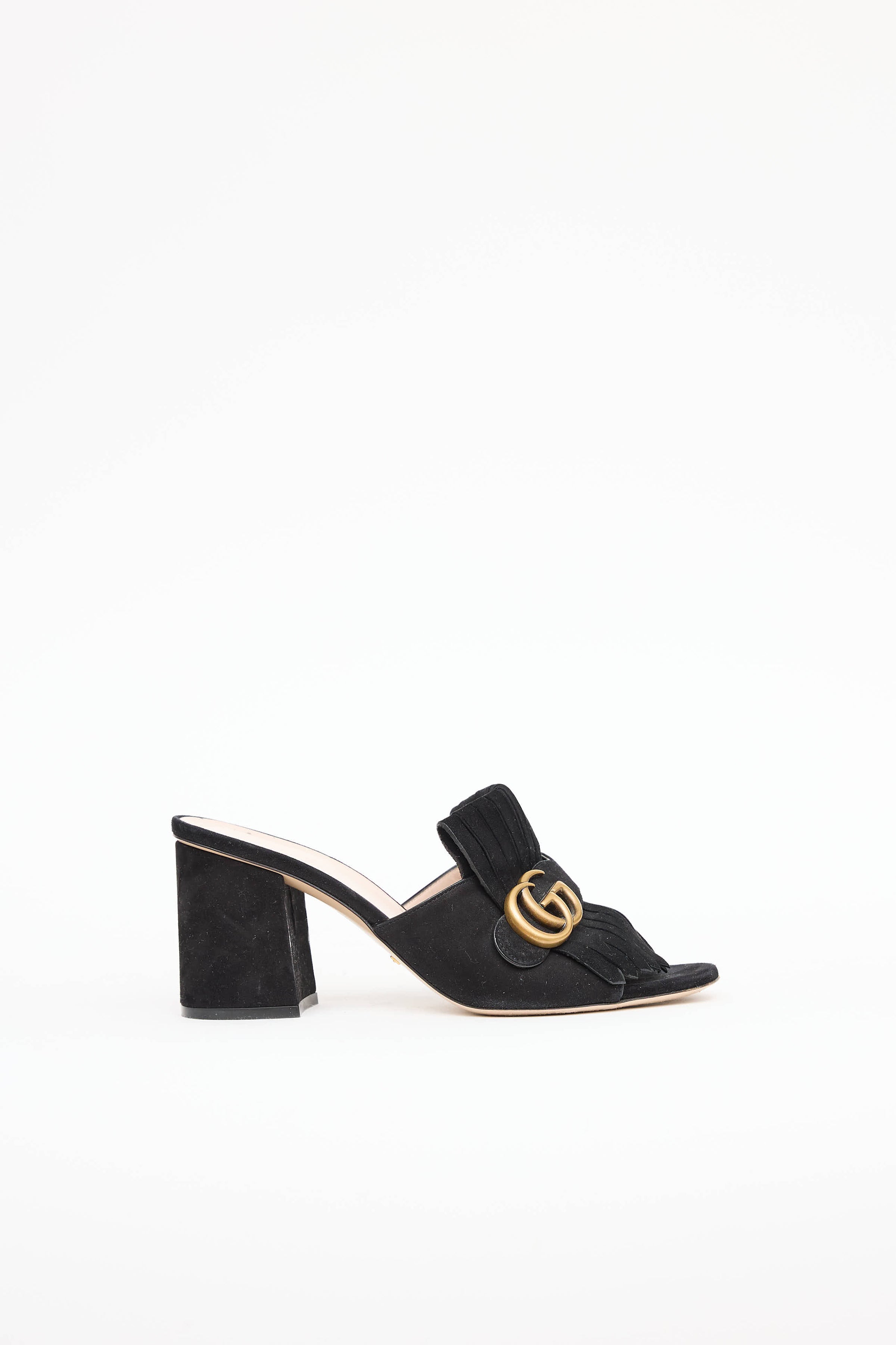 Pre-owned Gucci black suede Marmont mules featuring round toe, fringe upper, strap with gold tone GG hardware and covered block heel.