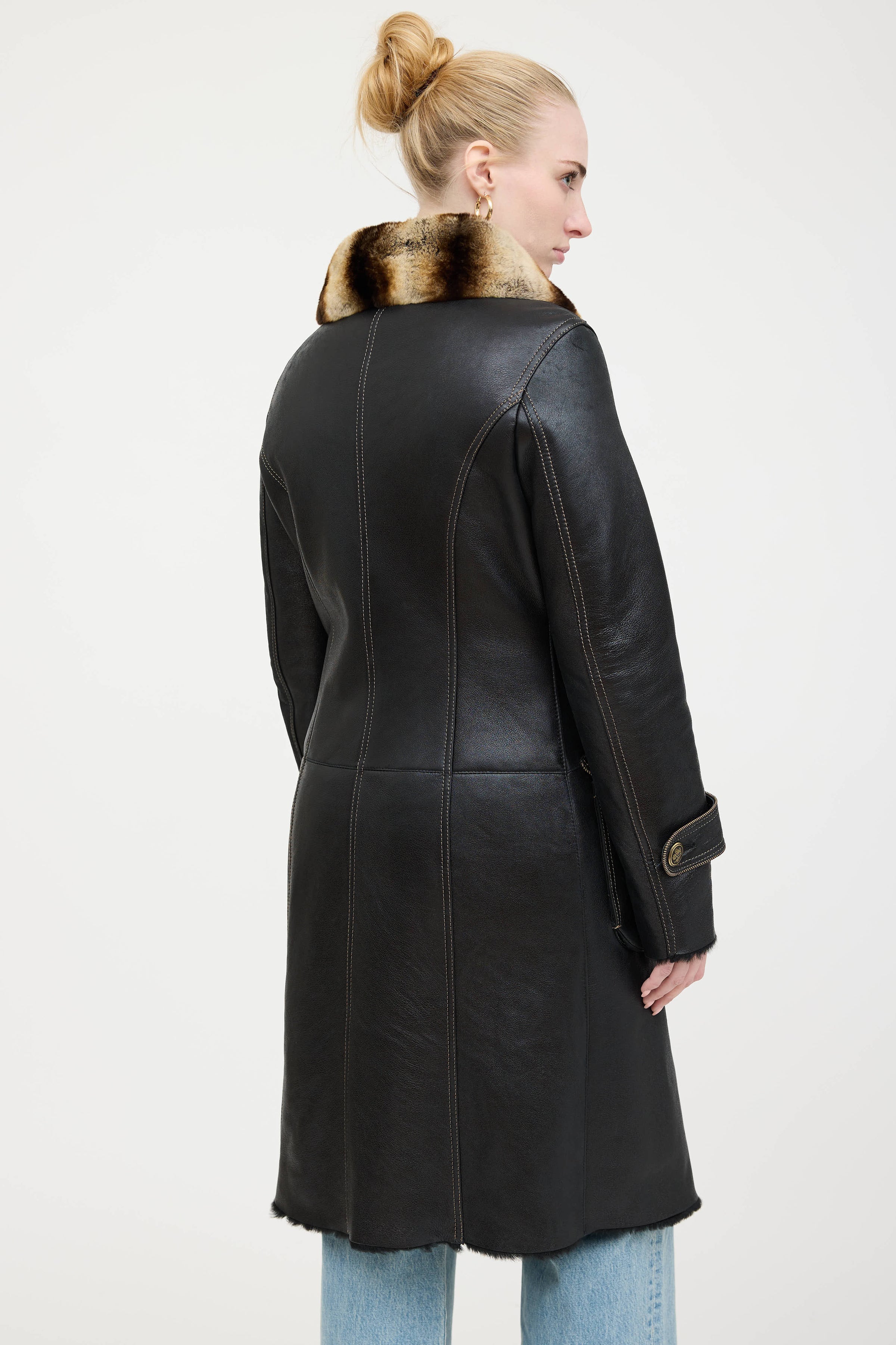 Pre-owned Demmy black and multicolor leather coat featuring chinchilla fur stand collar, zip front, patch pocket and slit pockets at front, and straps at cuff. Shearling Lined.