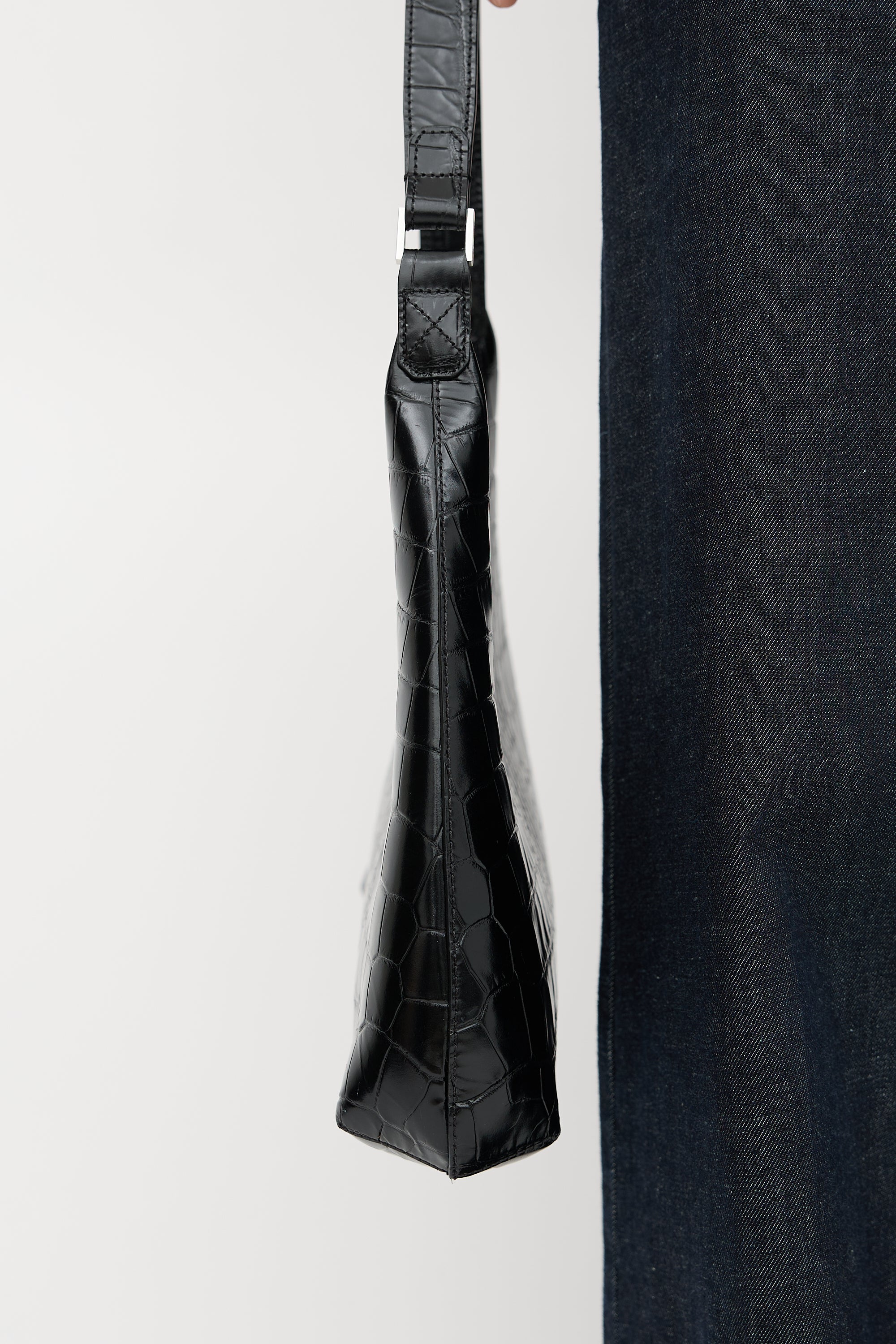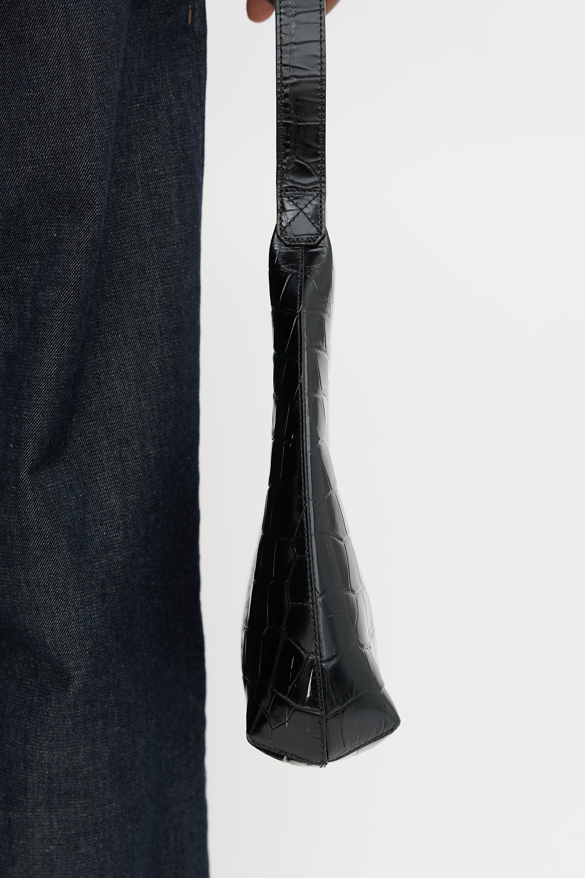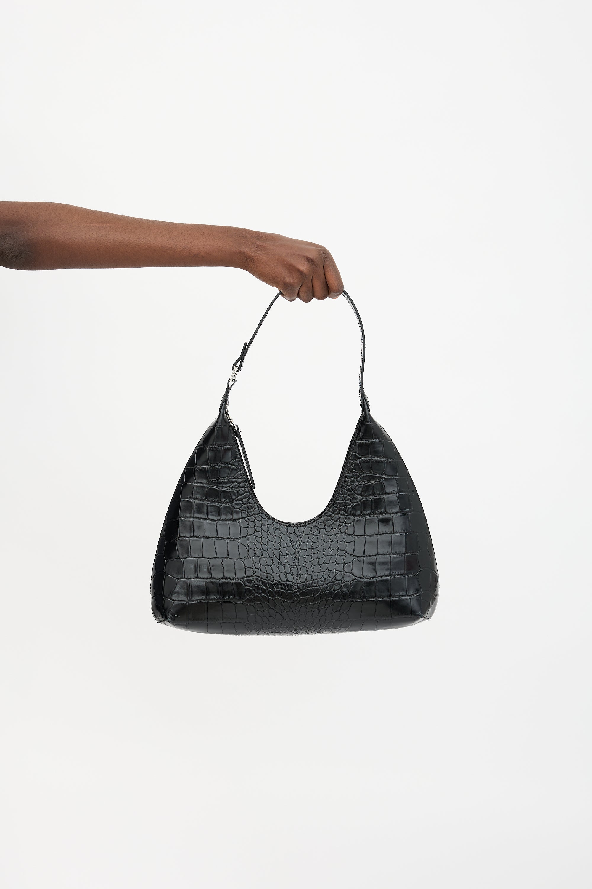 Pre-owned By Far black leather Amber shoulder bag featuring croc embossing, silver tone hardware, single flat top handle, top zip closure, and one lined main compartment with three slip pockets. Comes with original dust bag.