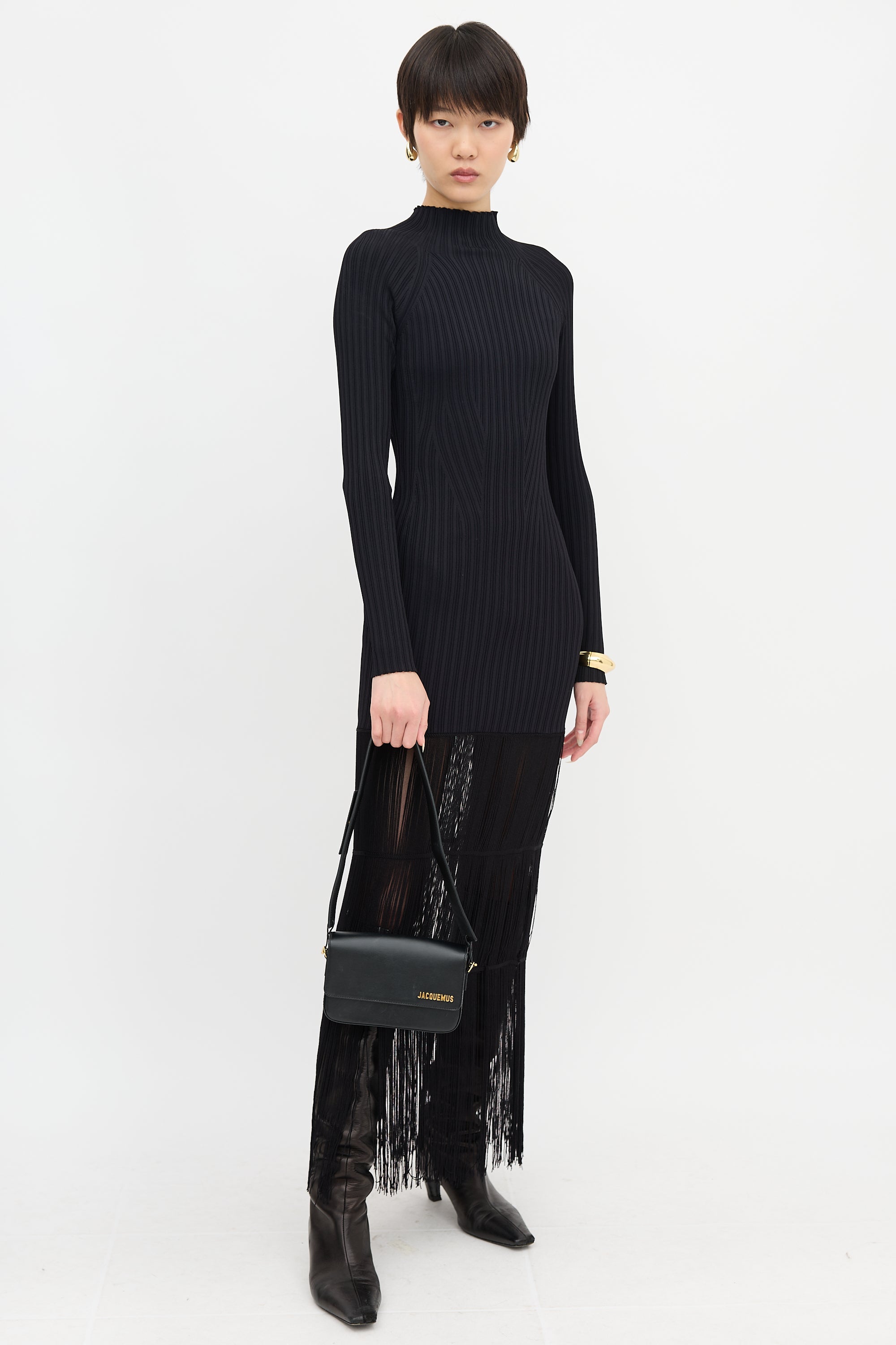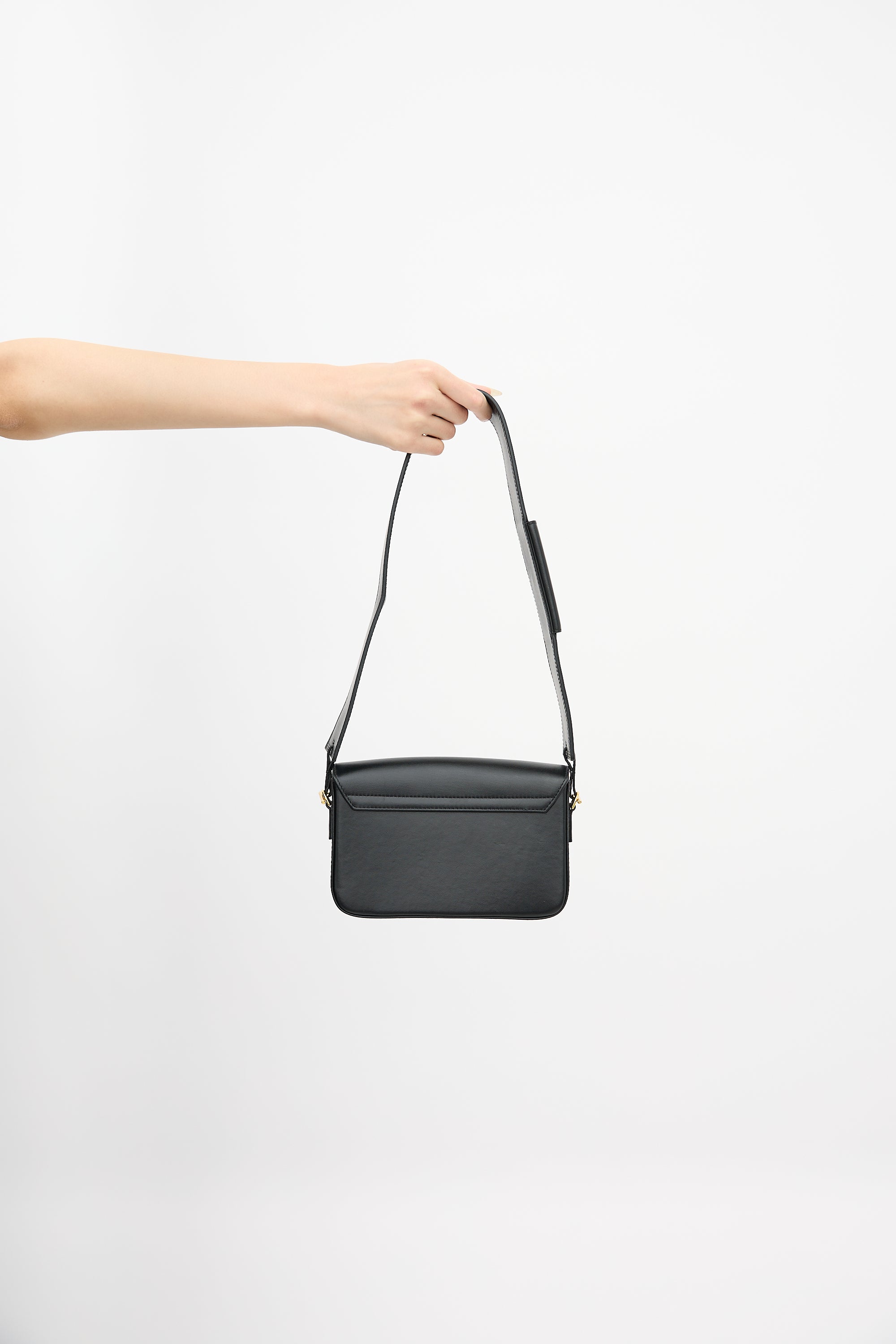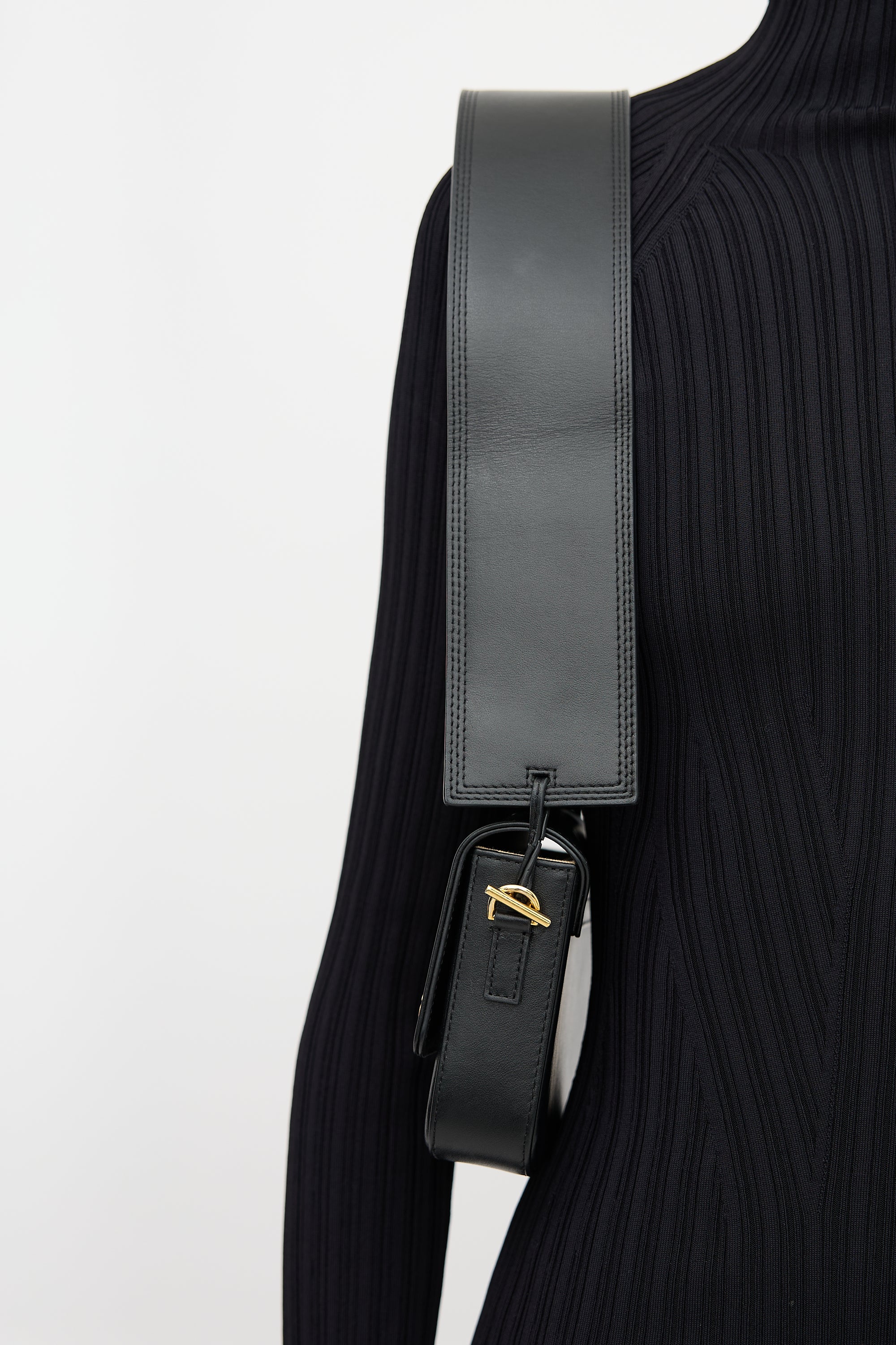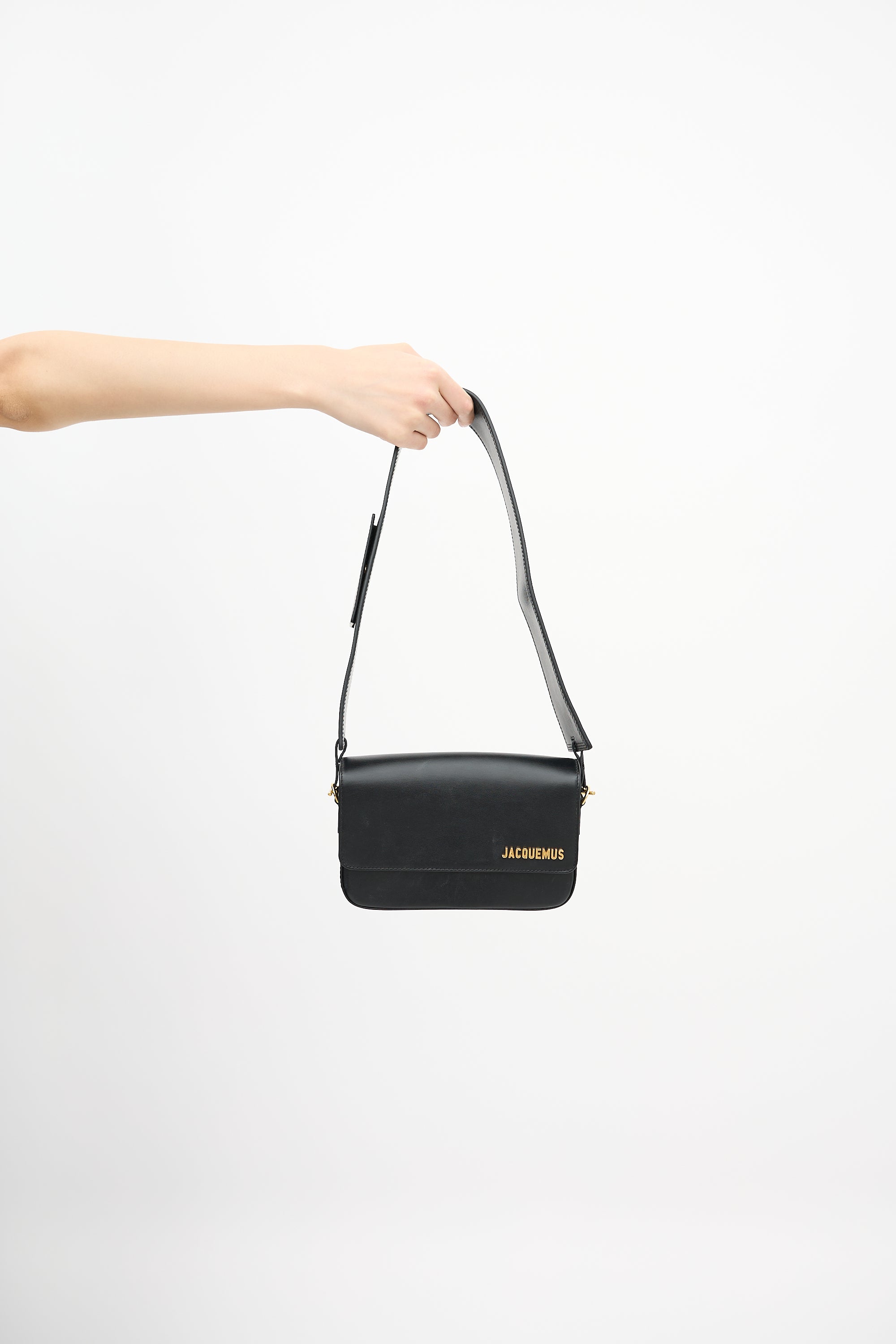 Pre-owned Jacquemus black leather Le Carinu shoulder bag featuring tonal stitching, gold tone logo embellishment at front flap, removable wide shoulder strap, magnetic closure, and one lined main compartment with one slip pocket. Comes with original dust bag.