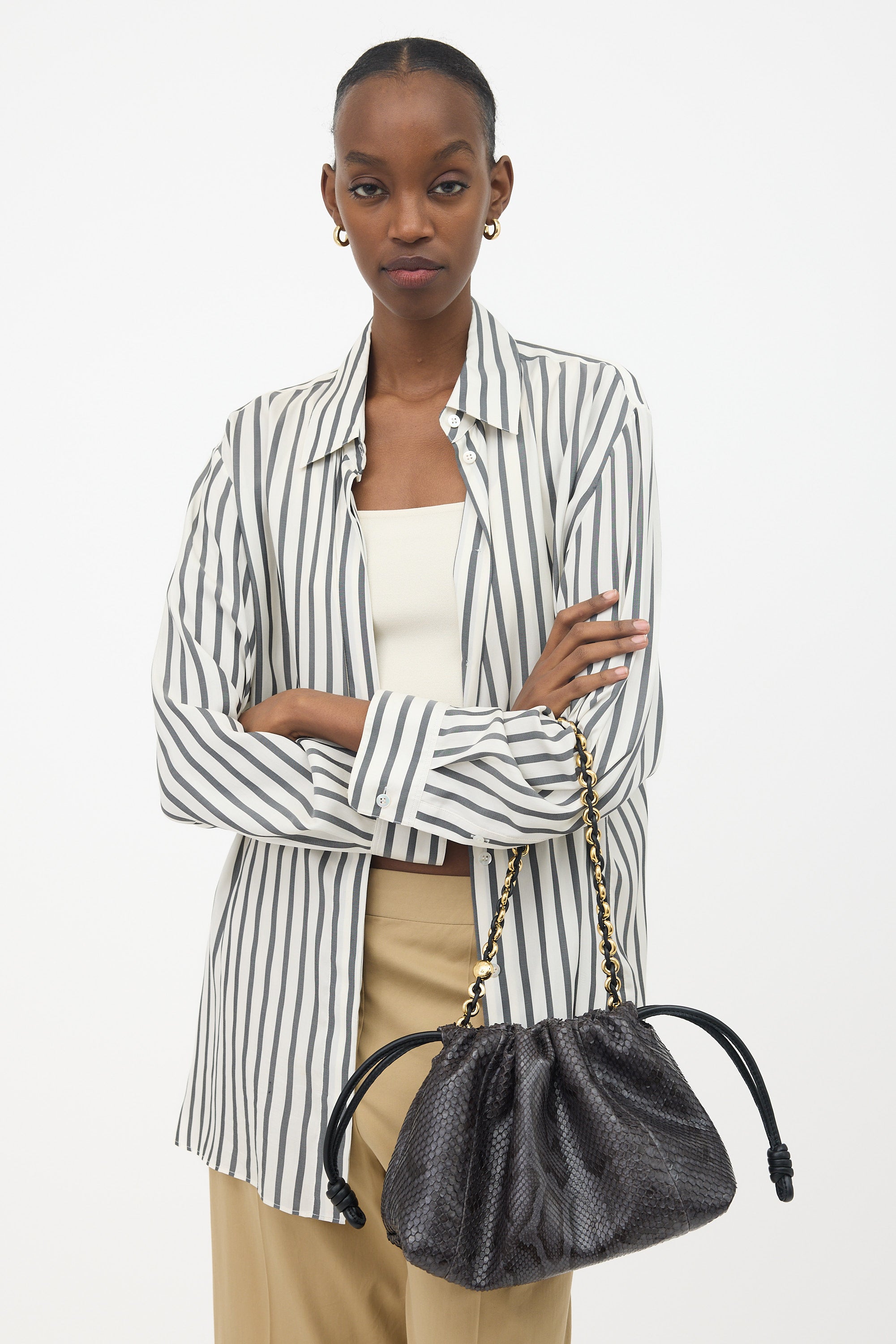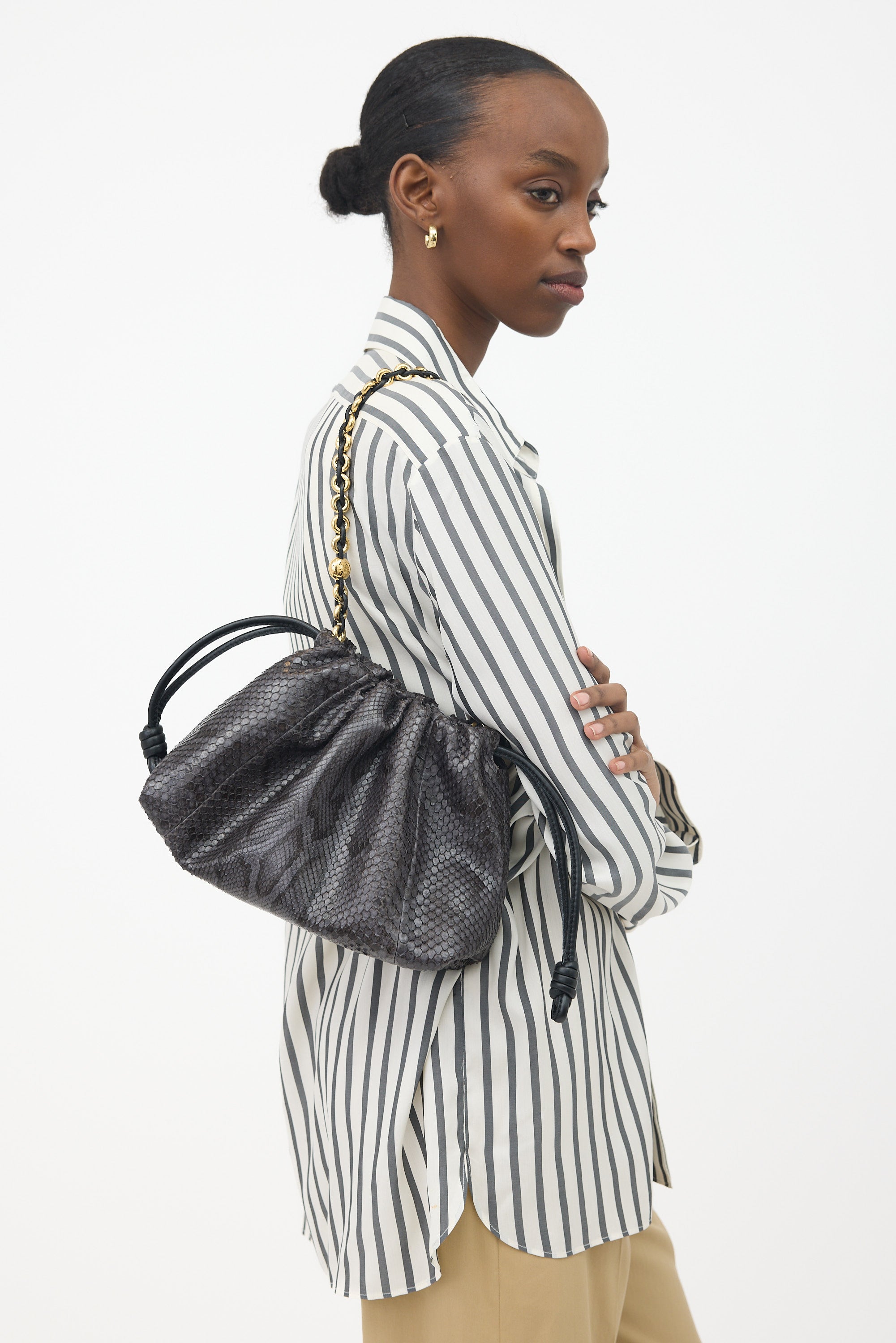 Pre-owned Loewe grey snakeskin leather Flamenco bag featuring a detachable leather shoulder strap with knot details, detachable braided chain shoulder strap, knotted drawstring top with magnetic closure, and one lined main compartment. Authenticated by in-house luxury specialists.