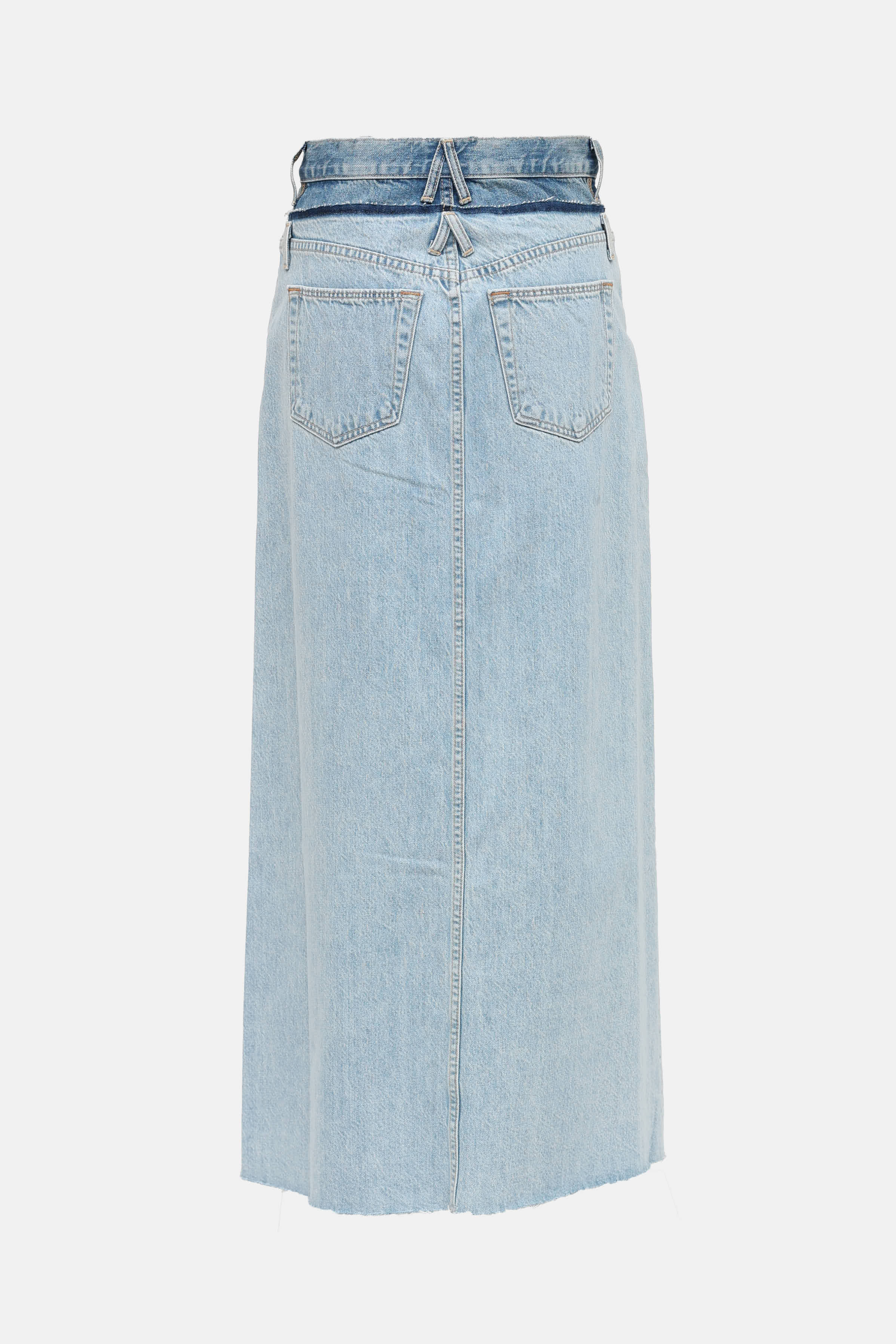 Pre-owned SLVRLAKE light wash Re-work Dallas Double waistband skirt featuring double waistband, belt loops, constrast stitching, zip fly, five pocket styling, slit at front, and raw hemline.
