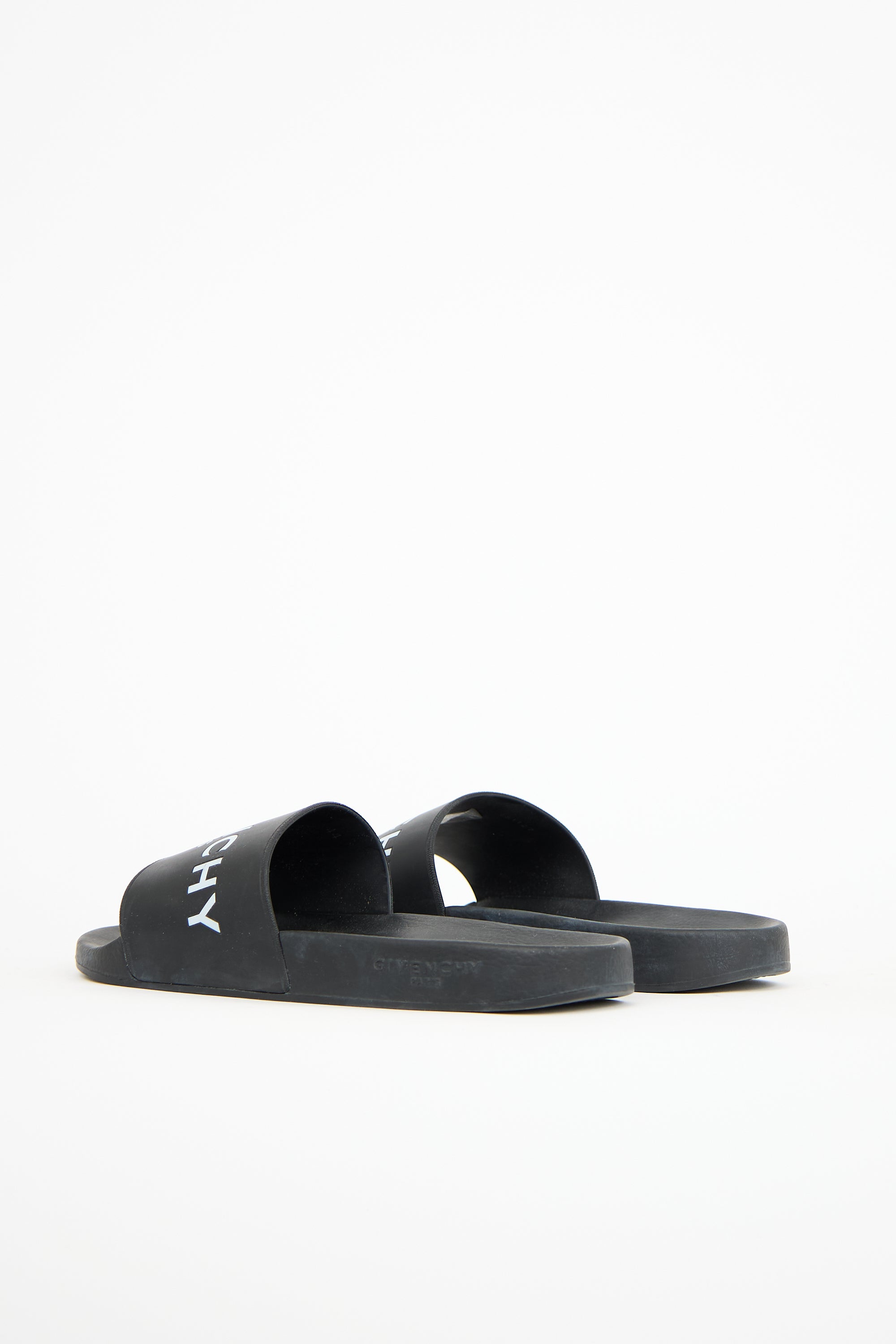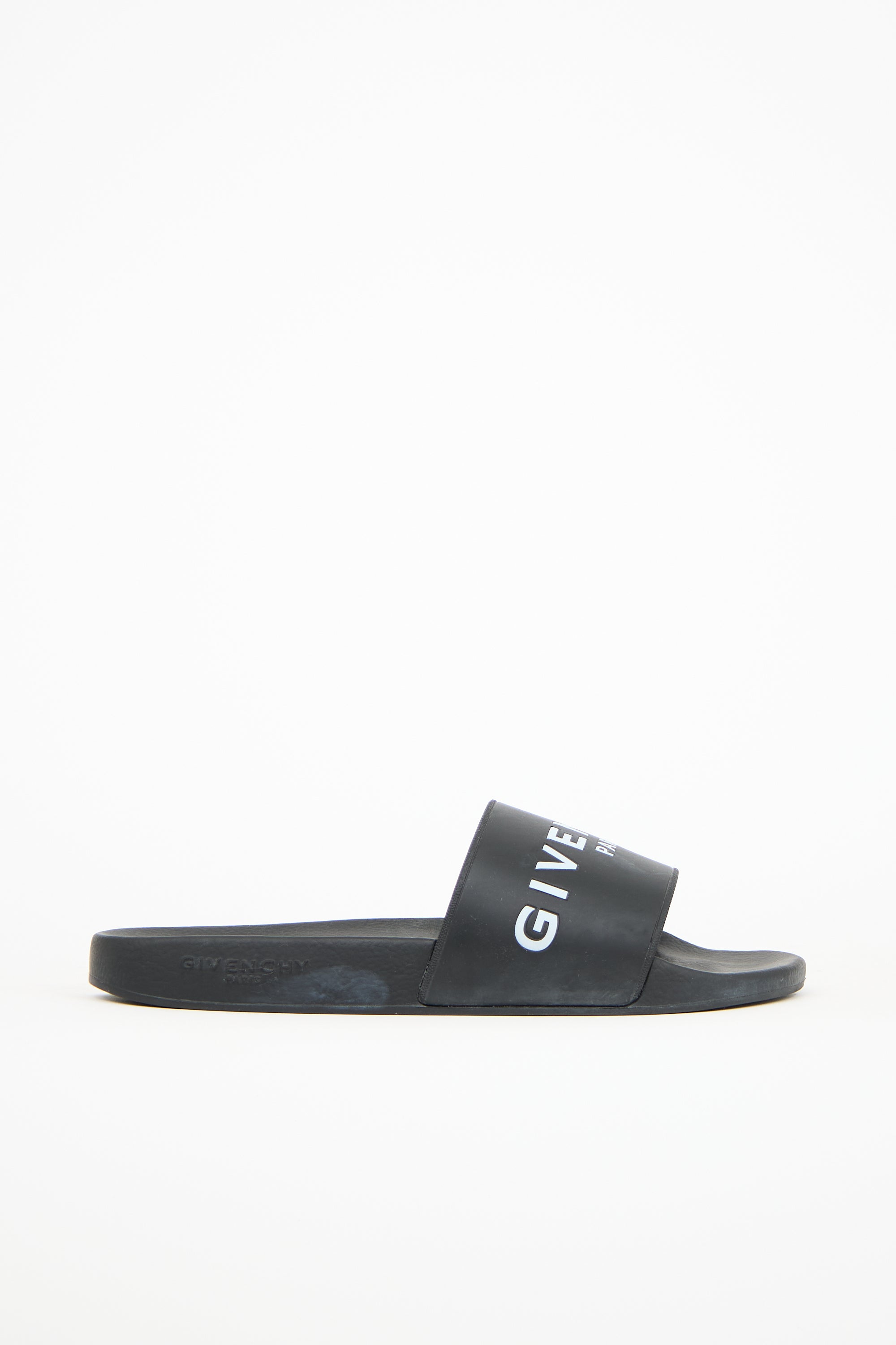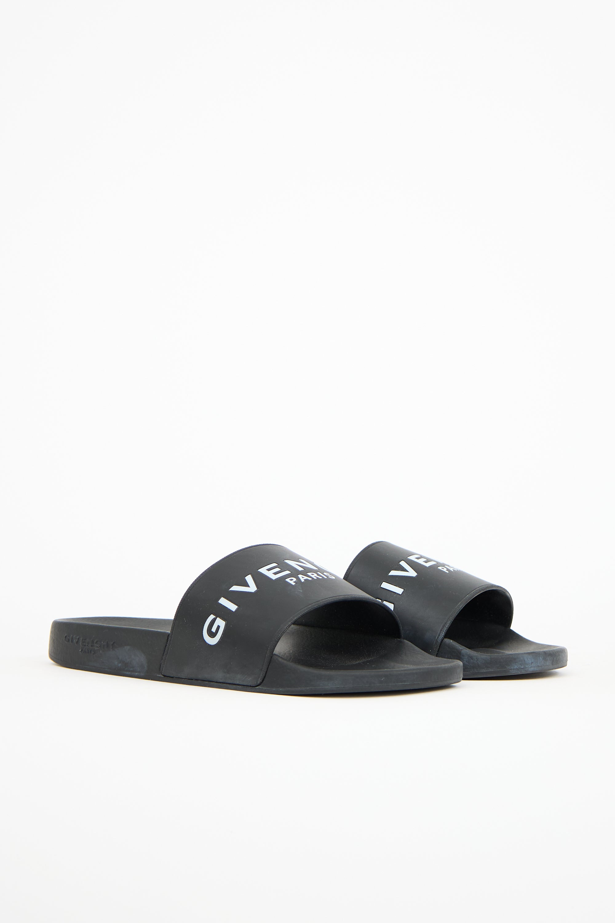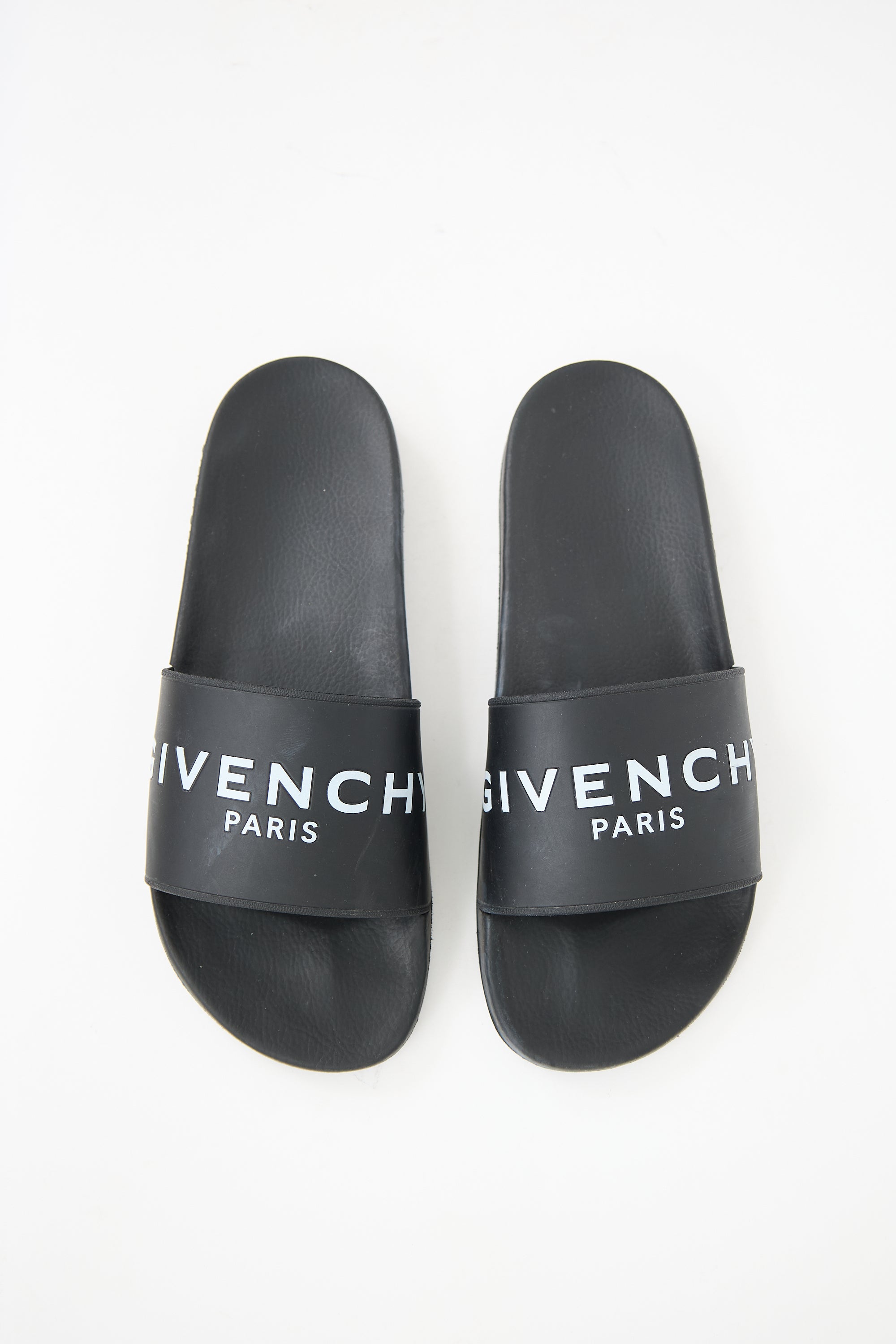 Pre-owned Givenchy black rubber slides featuring a strap at vamp with a bonded logo, embossed logo at outer sides, and slip on entry. Includes original dust bag.
