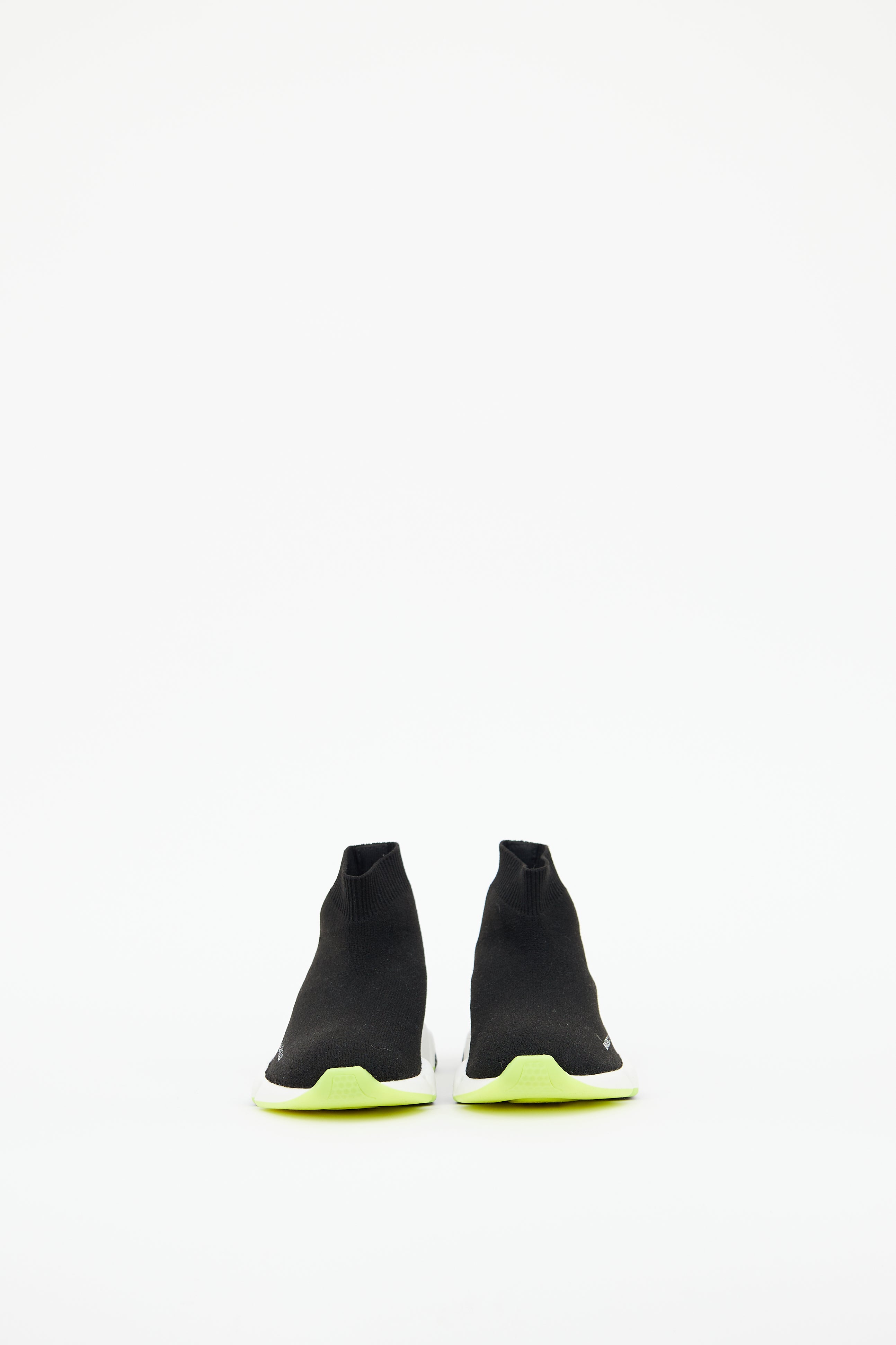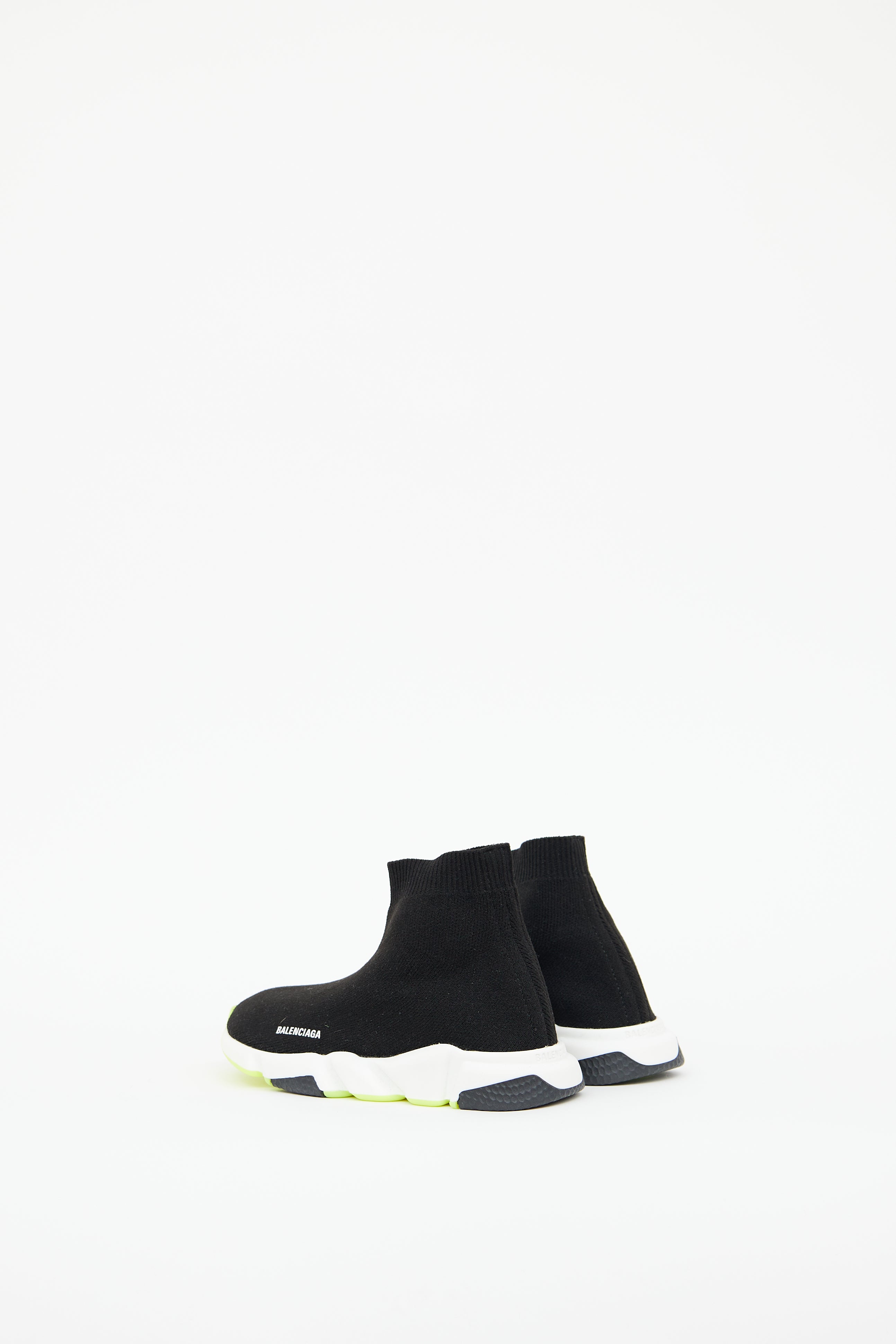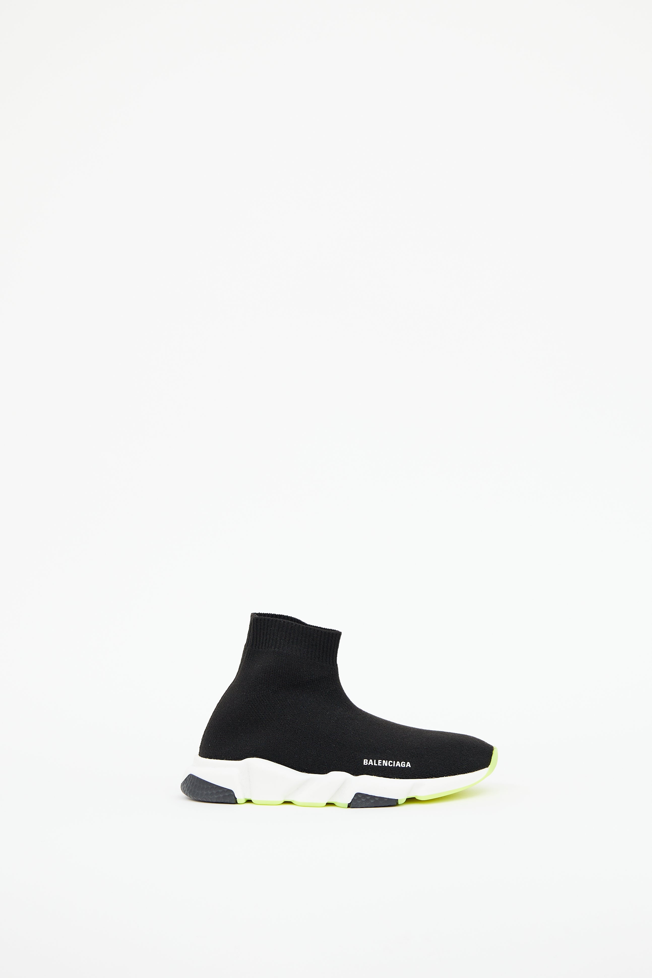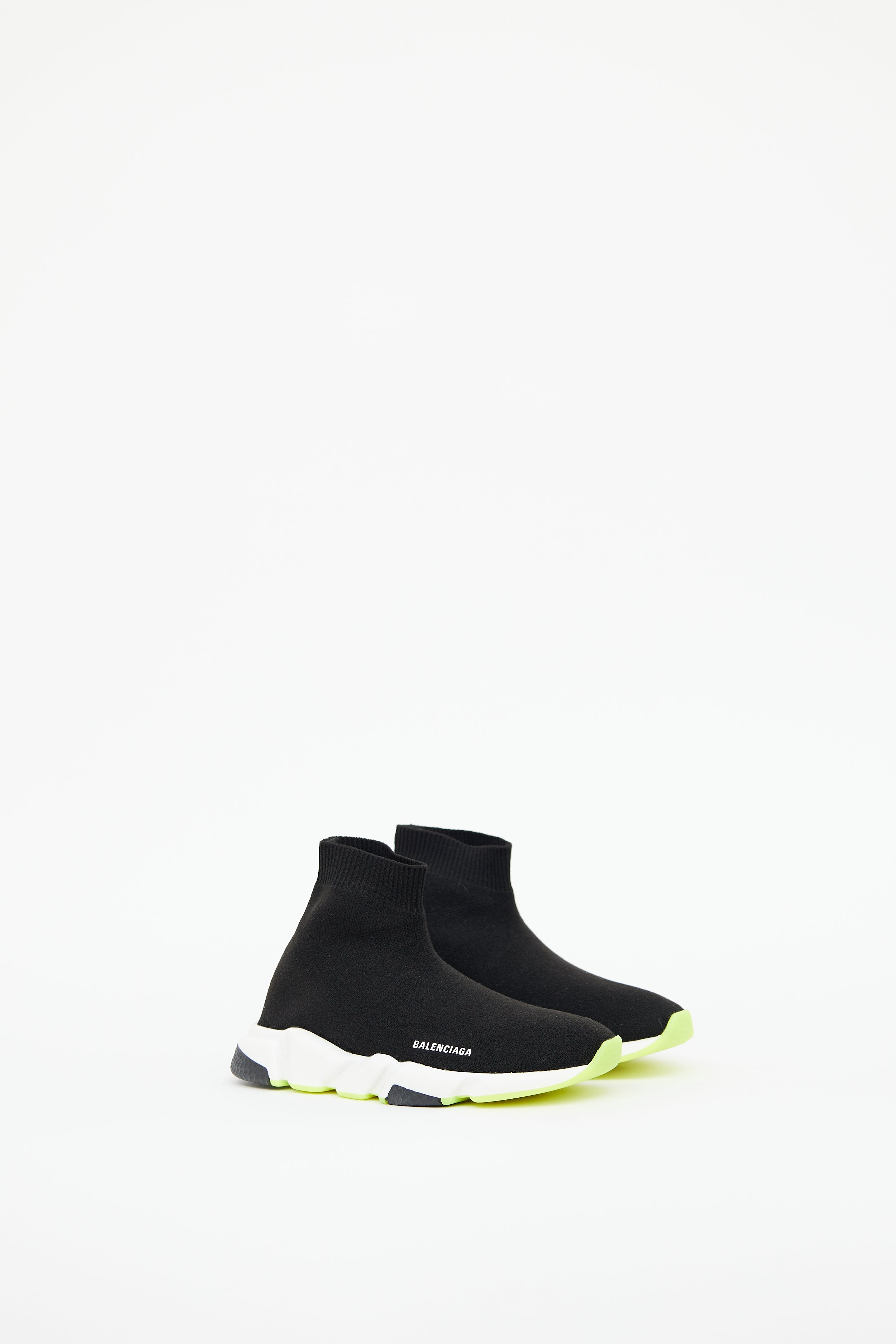 Pre-owned Balenciaga black kids Speed Knit sneakers featuring rounded toe, textile upper with printed logo at outer sides, white and neon green ribbed rubber midsole with debossed logo at heel, and elasticated entry.