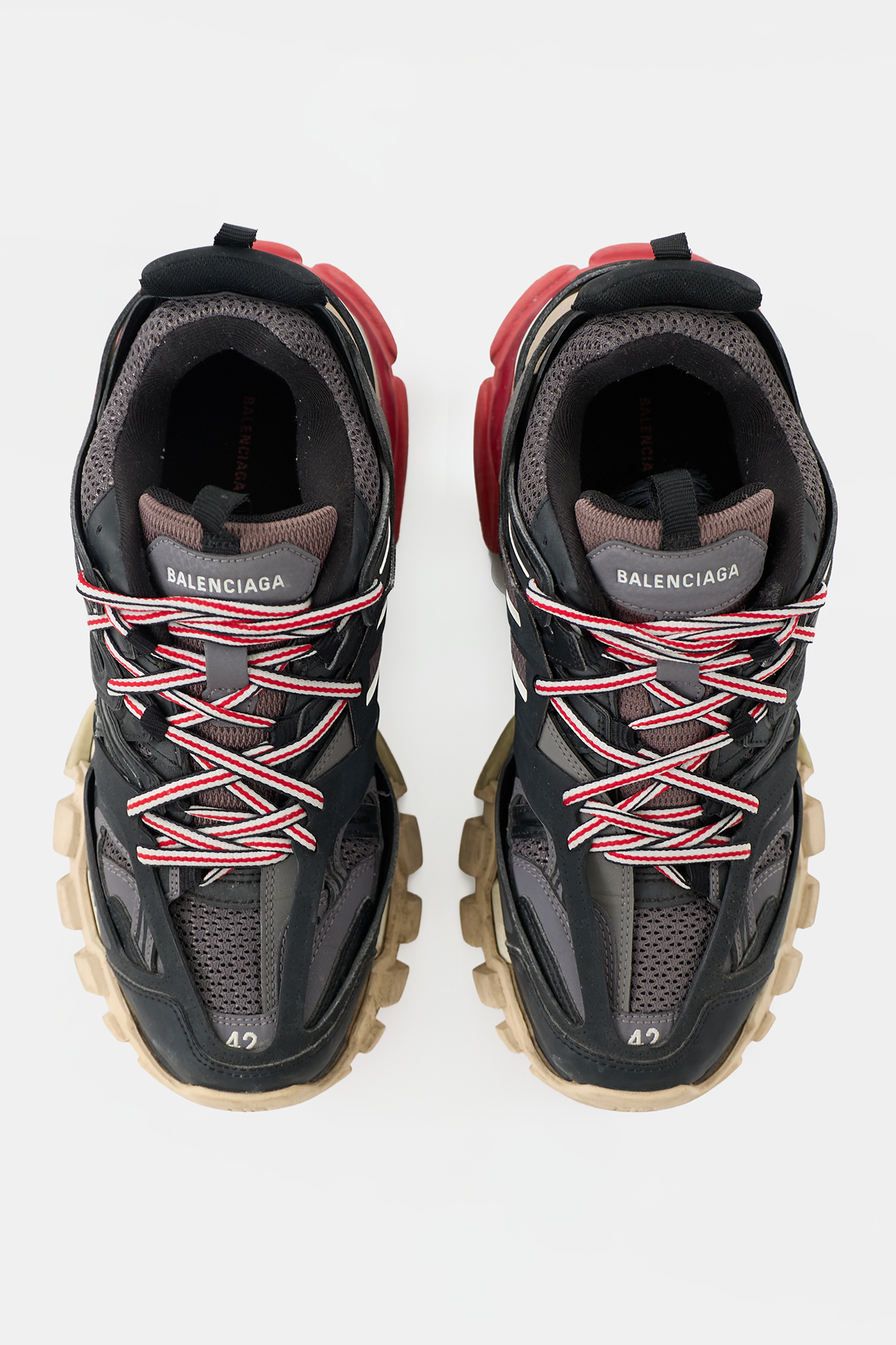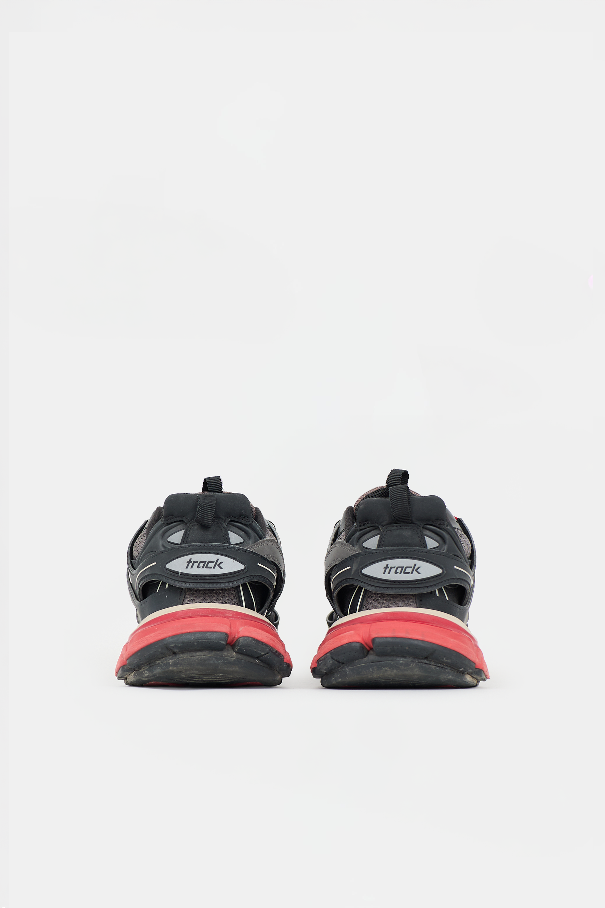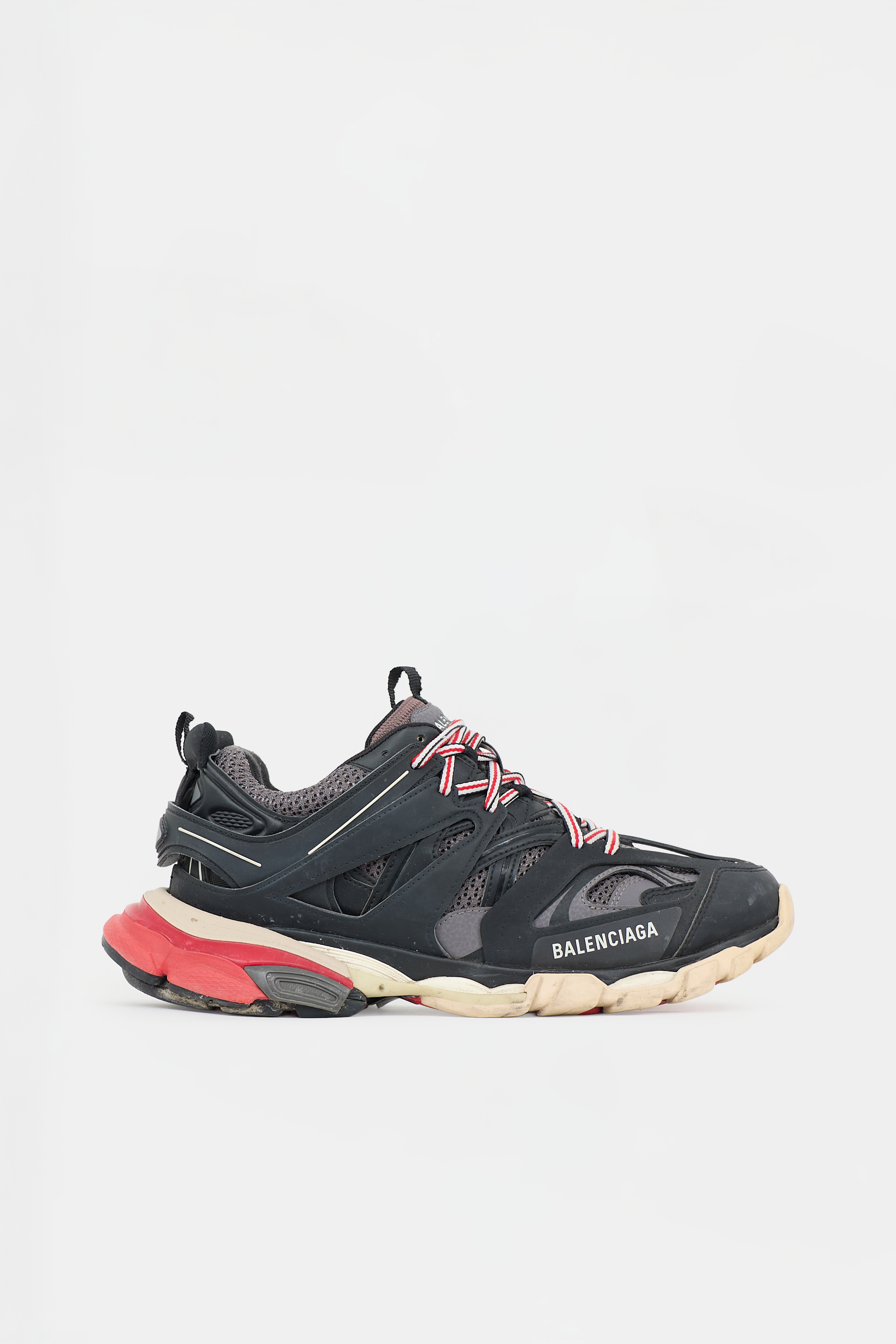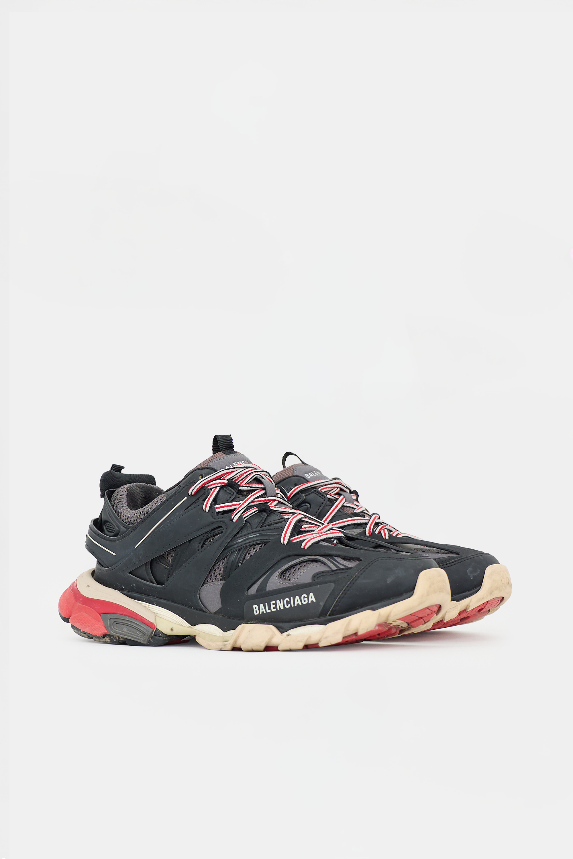 Pre-owned Balenciaga black, grey, and red track sneakers featuring rounded toe, mesh and rubber panelled upper, multi cross lace up instep, pull tab at tongue and counter, printed logos throughout, embroidered size notation at toe, and chunky treaded sole.