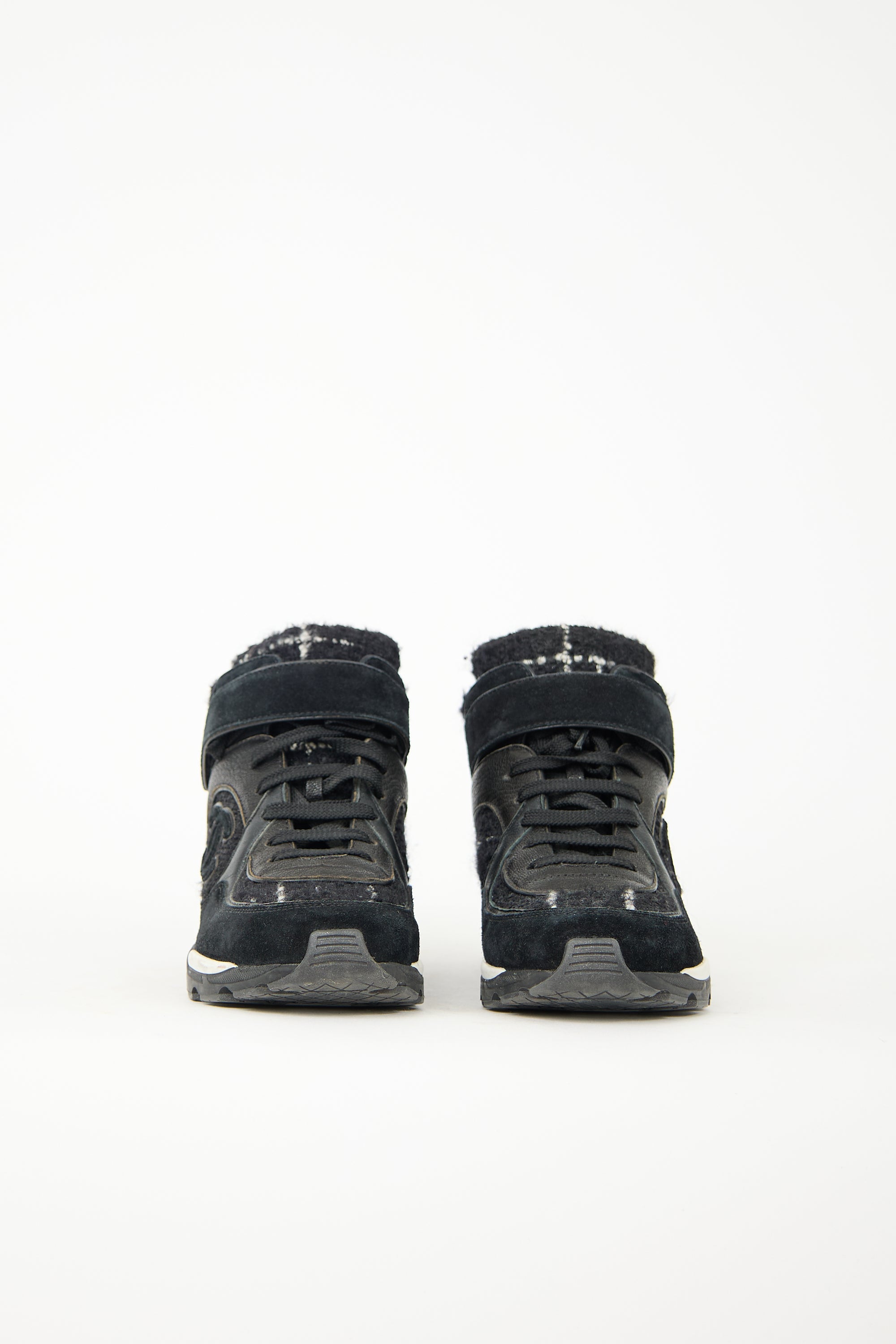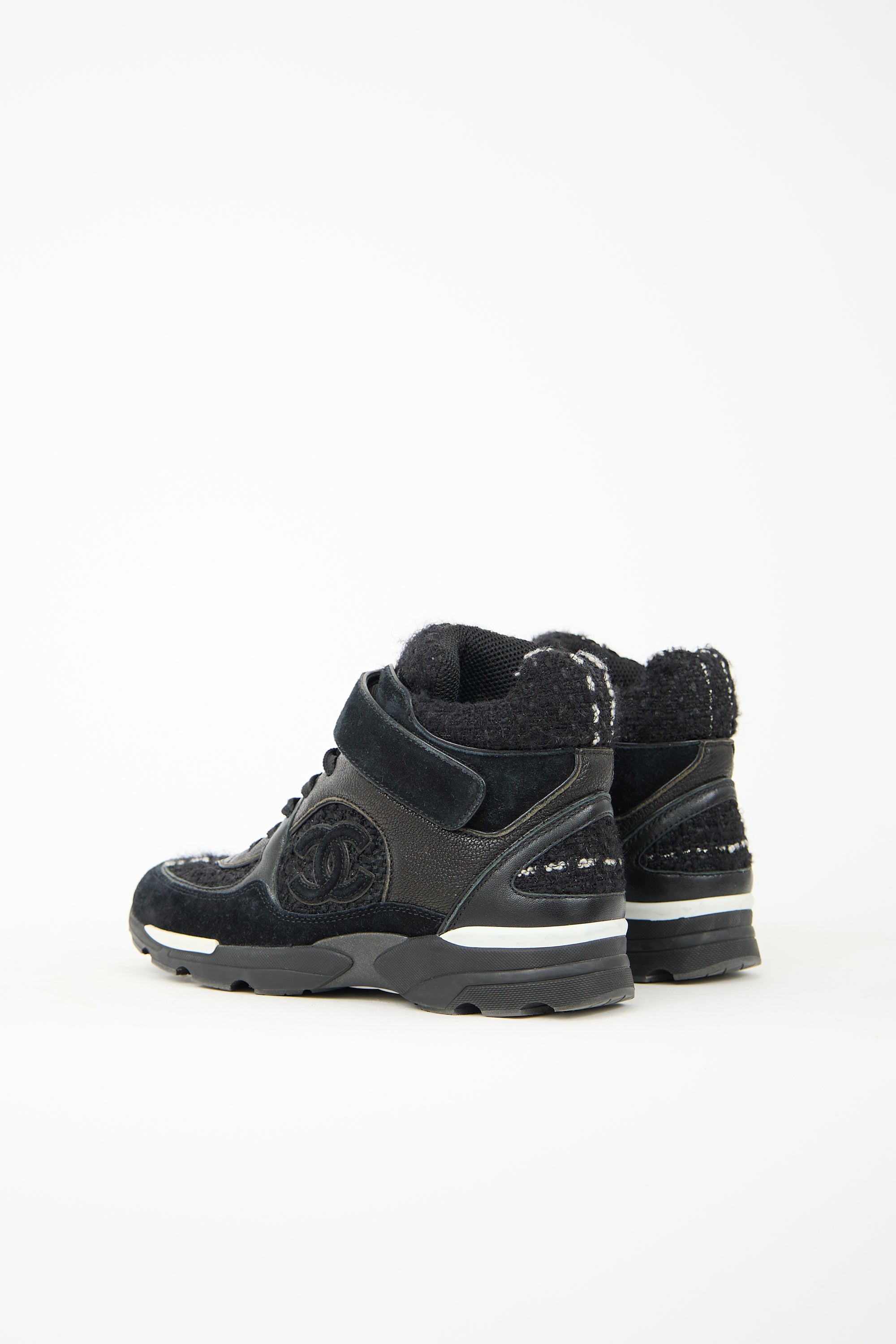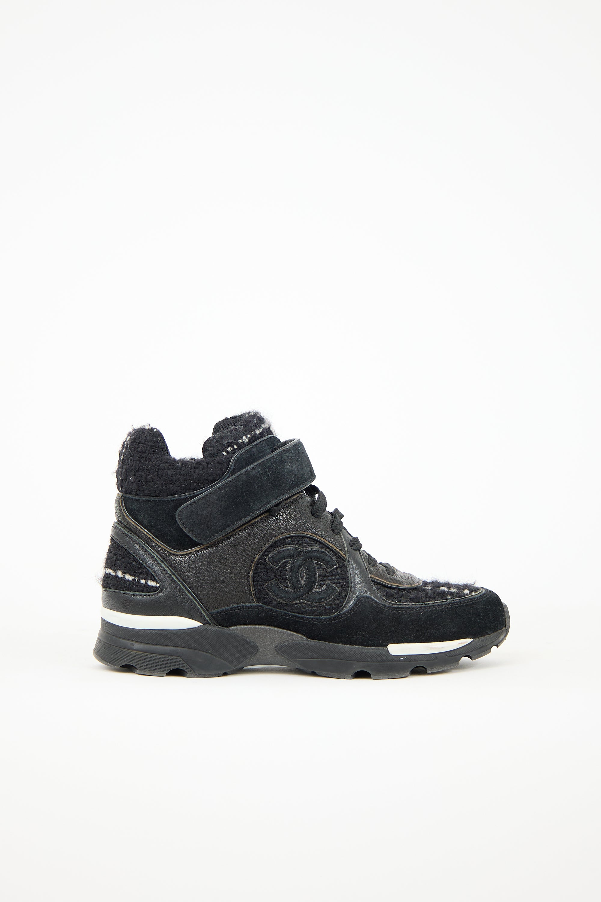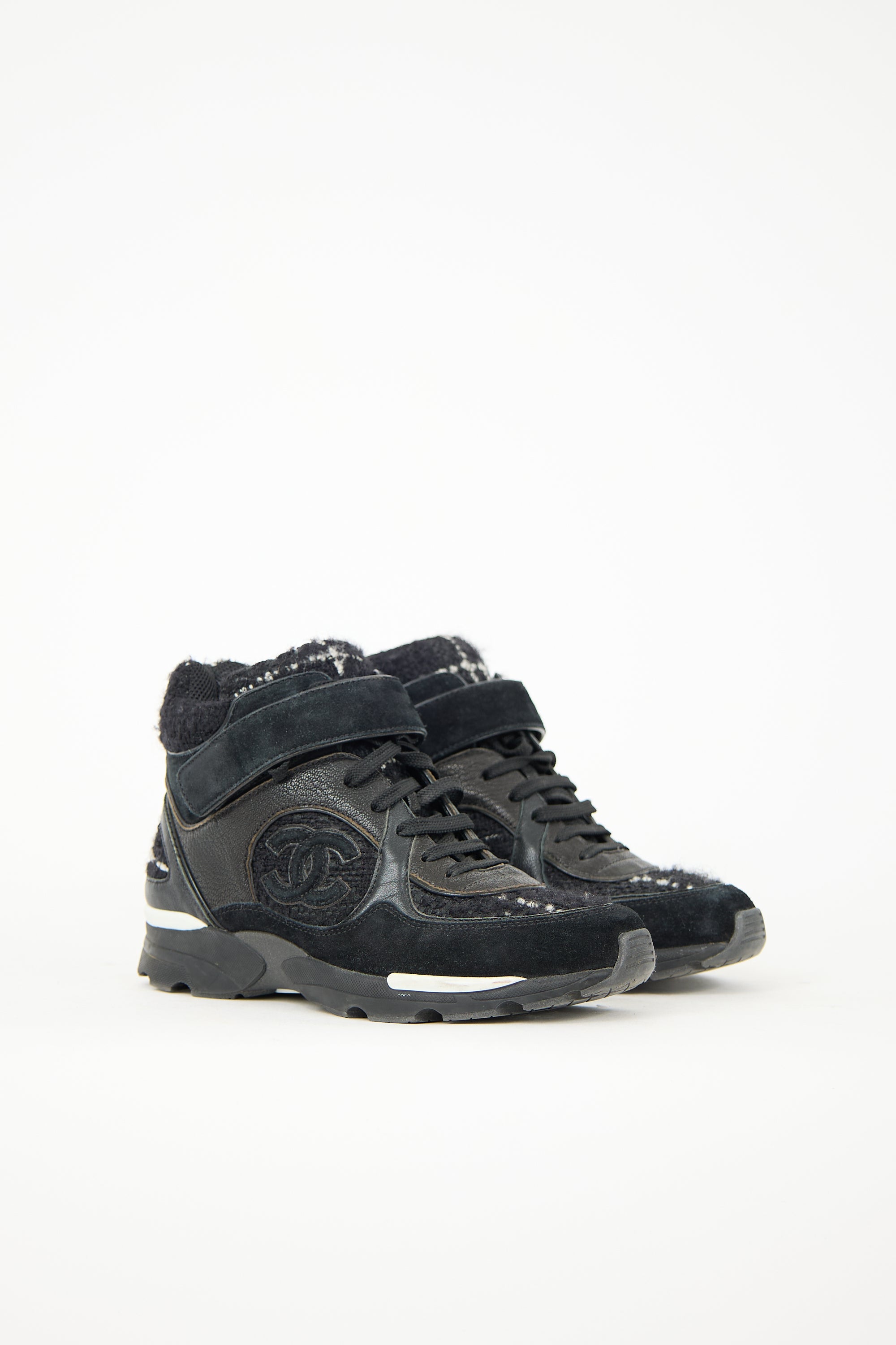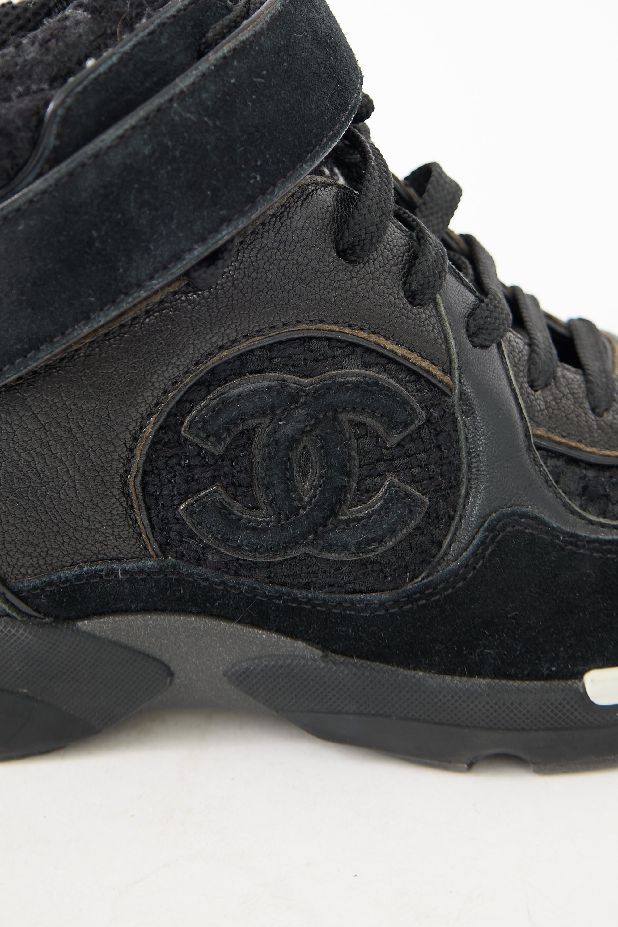 Pre-owned Chanel black CC suede and leather high top sneakers featuring rounded toe, lace up front, Velcro strap at throat, interlocking CC logo patch at outer side, and rubber sole.
