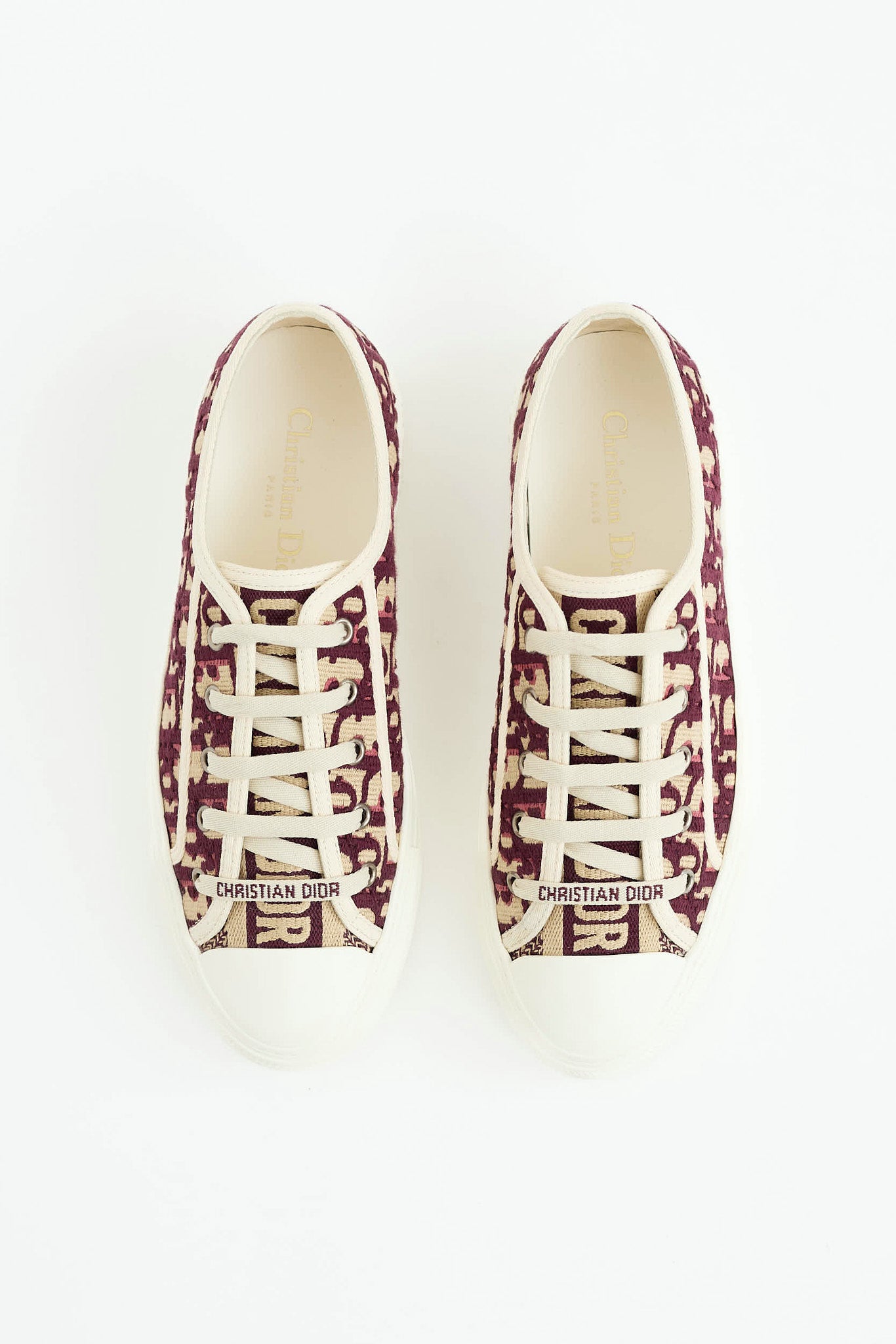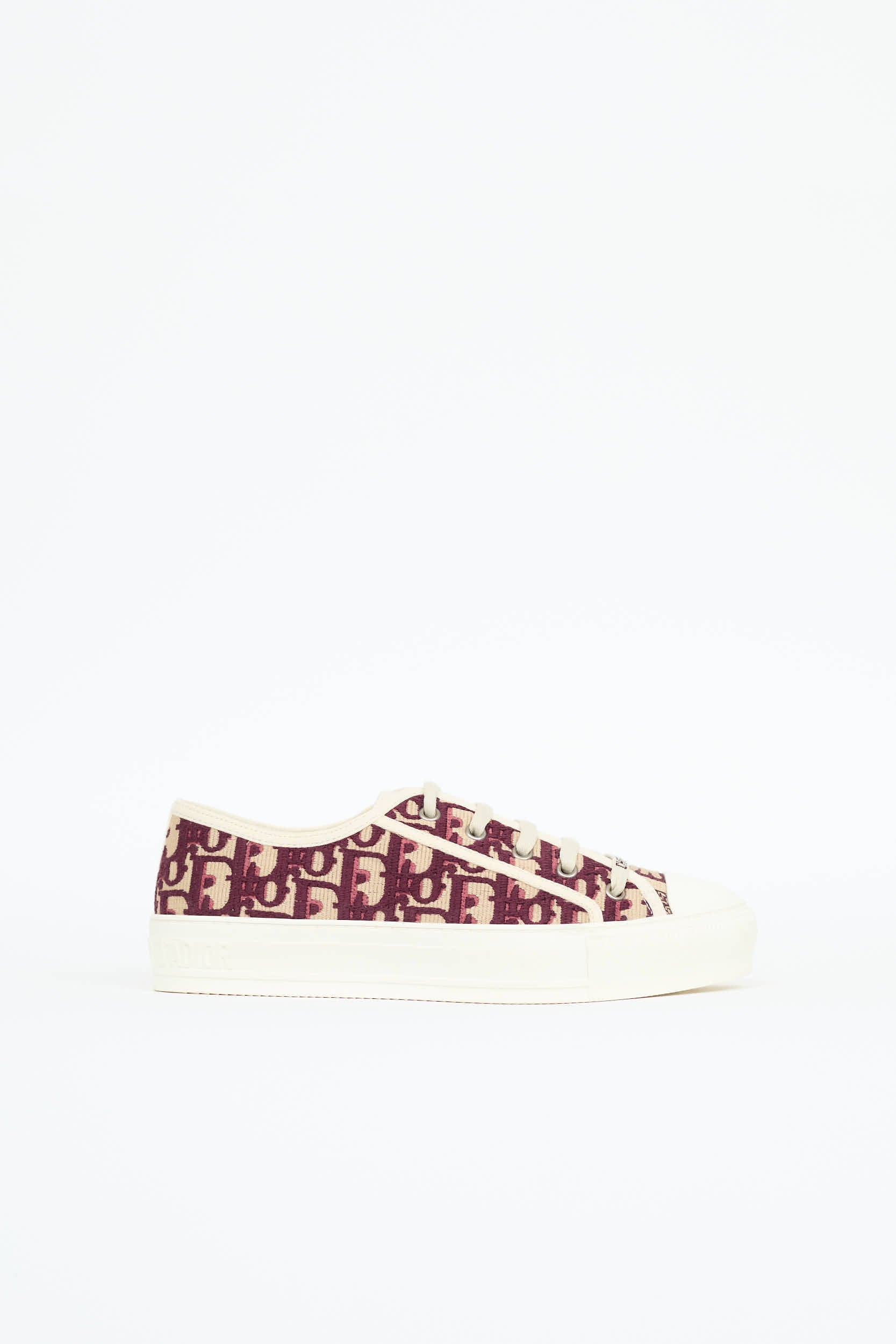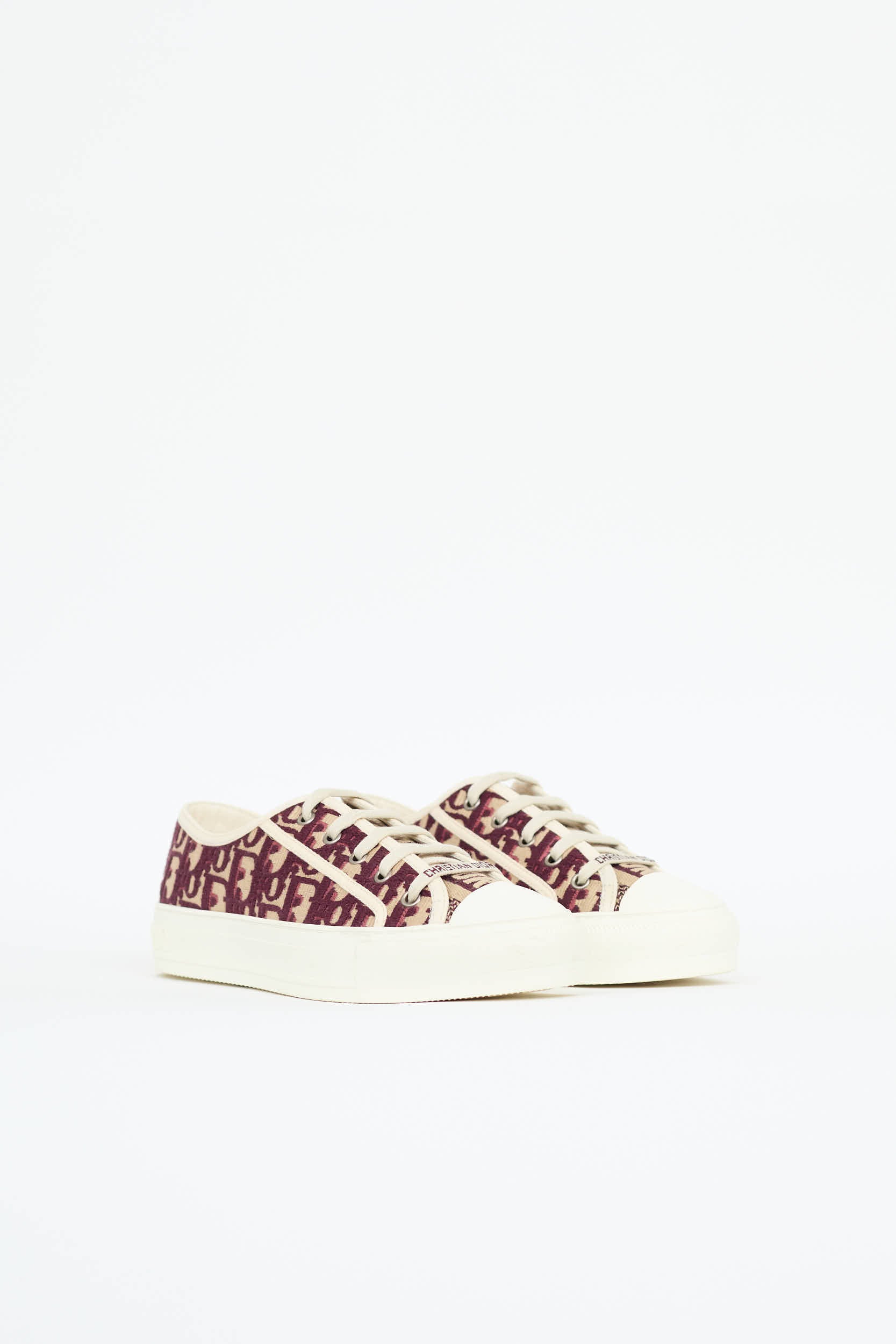 Pre-owned Dior burgundy and cream Walk'N'Dior sneakers featuring oblique Dior monogram canvas, round cap toe, logo at midsole, and lace up vamp.