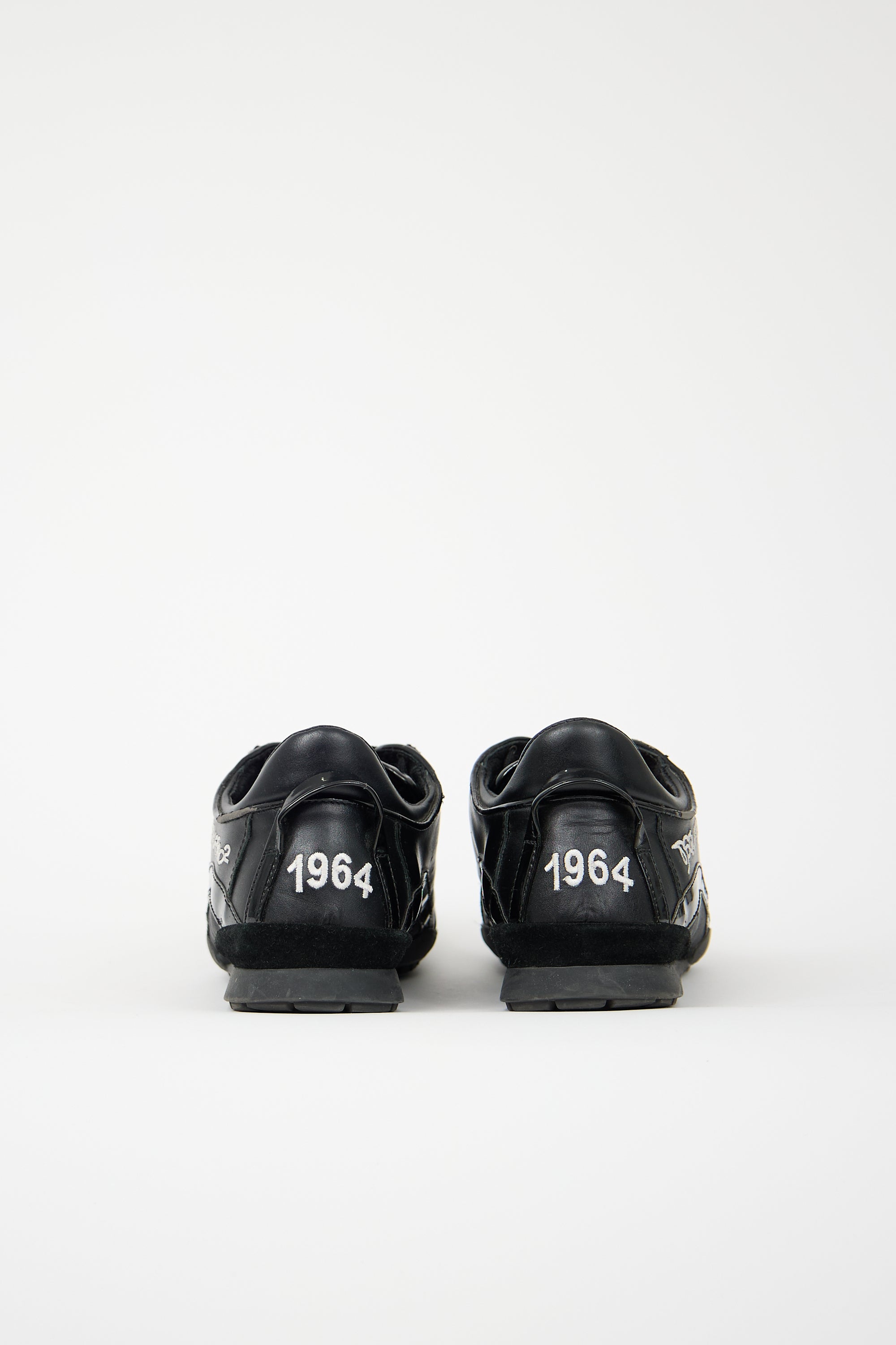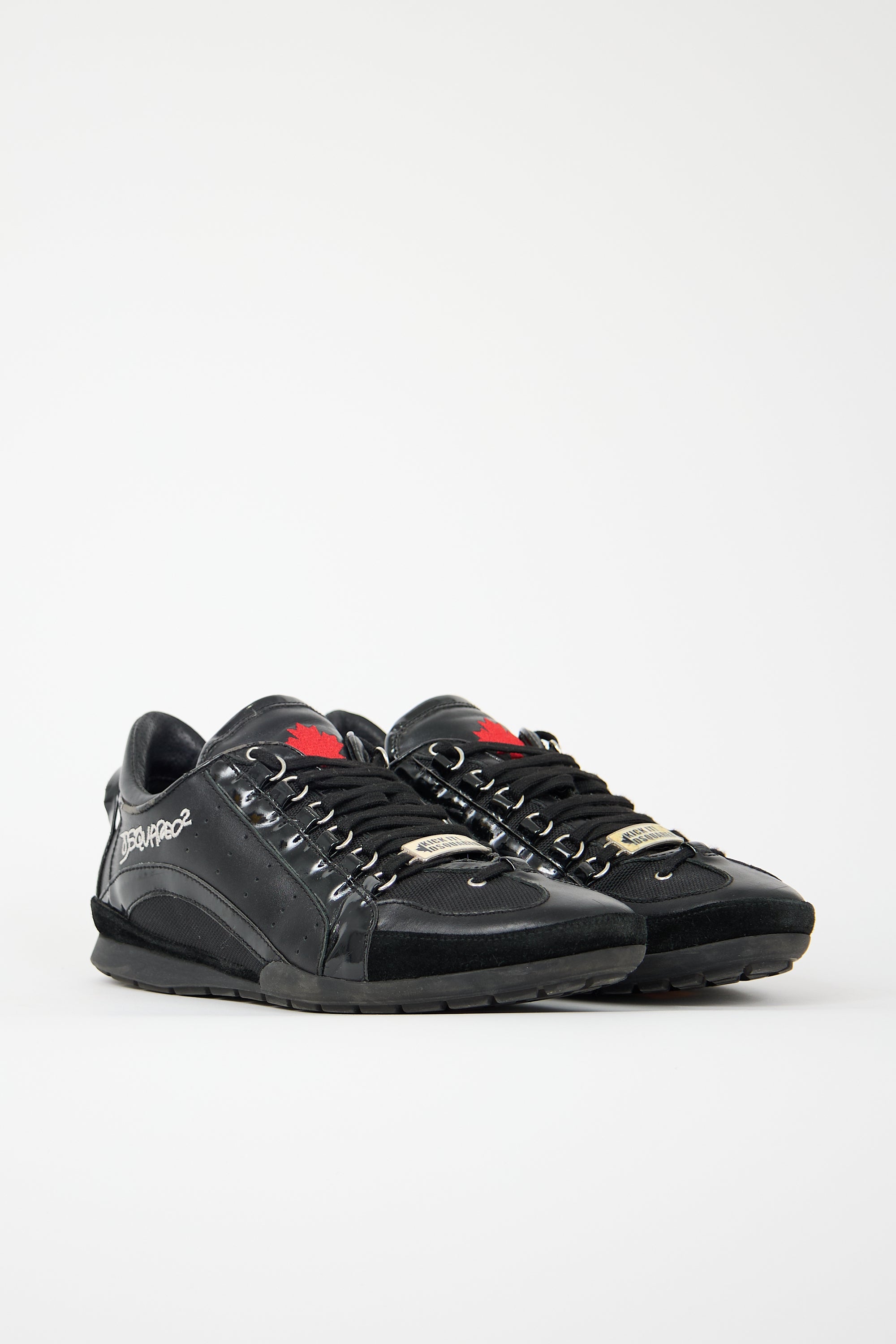 Pre-owned DSquared2 black leather Kick It! 1964 sneakers featuring rounded toe, panelled upper, lace up vamp with logo plaque embellishment, embroidered logo at outer side and heel, and embroidered red maple leaf at tongue. Comes with original dust bags.