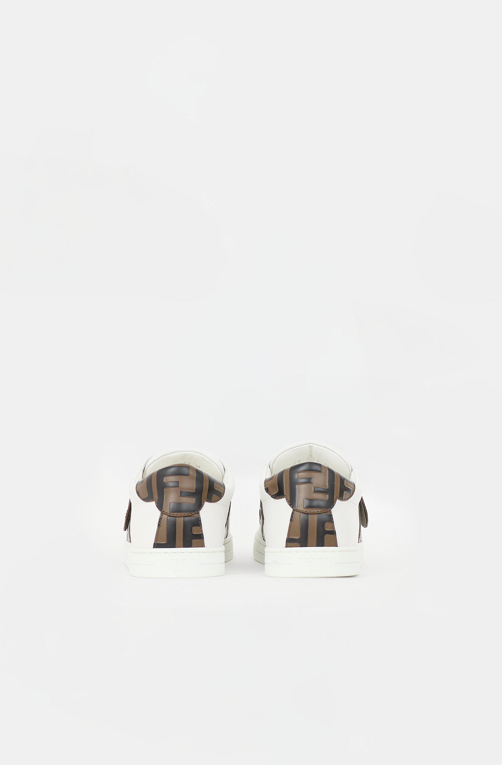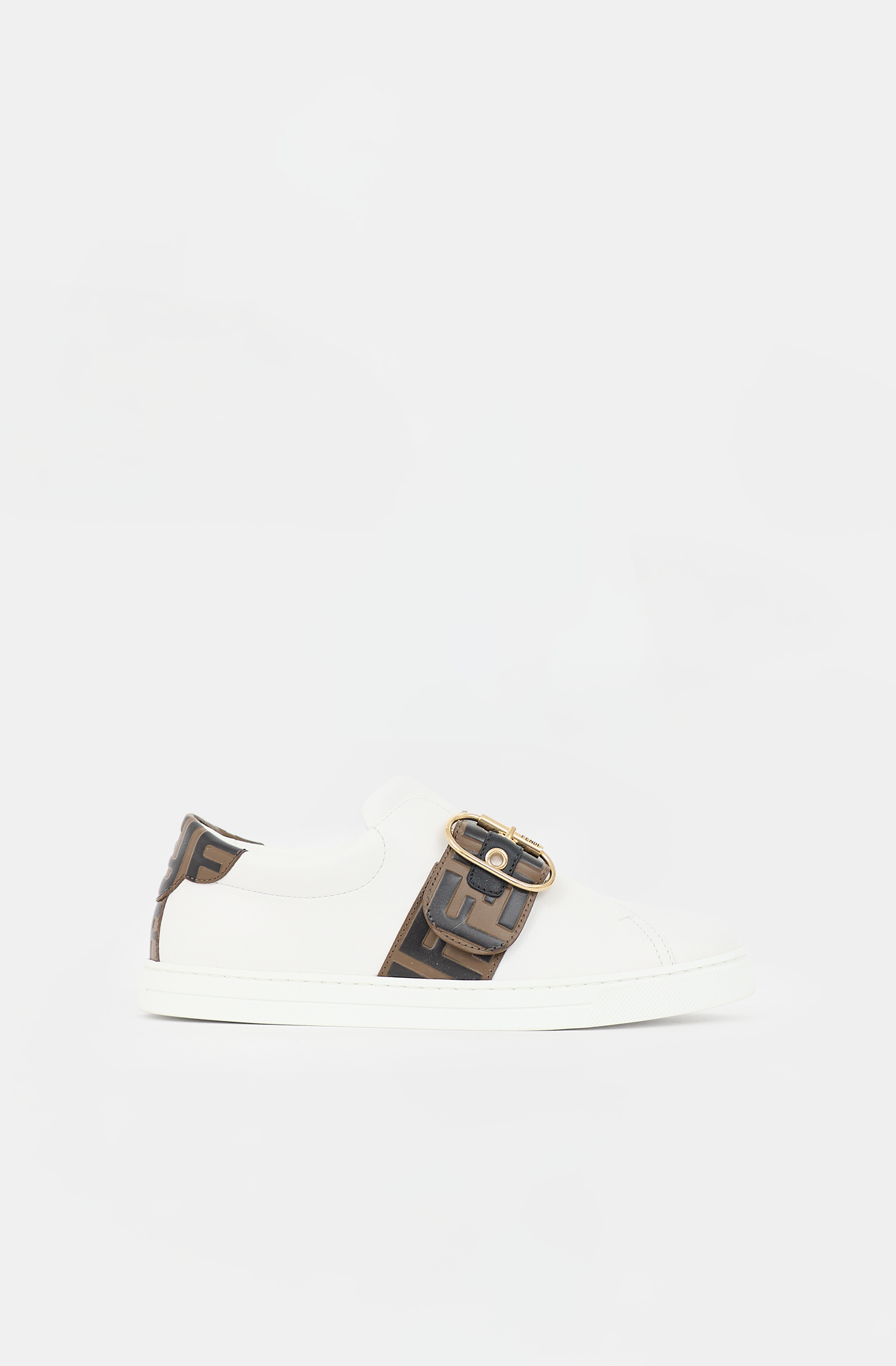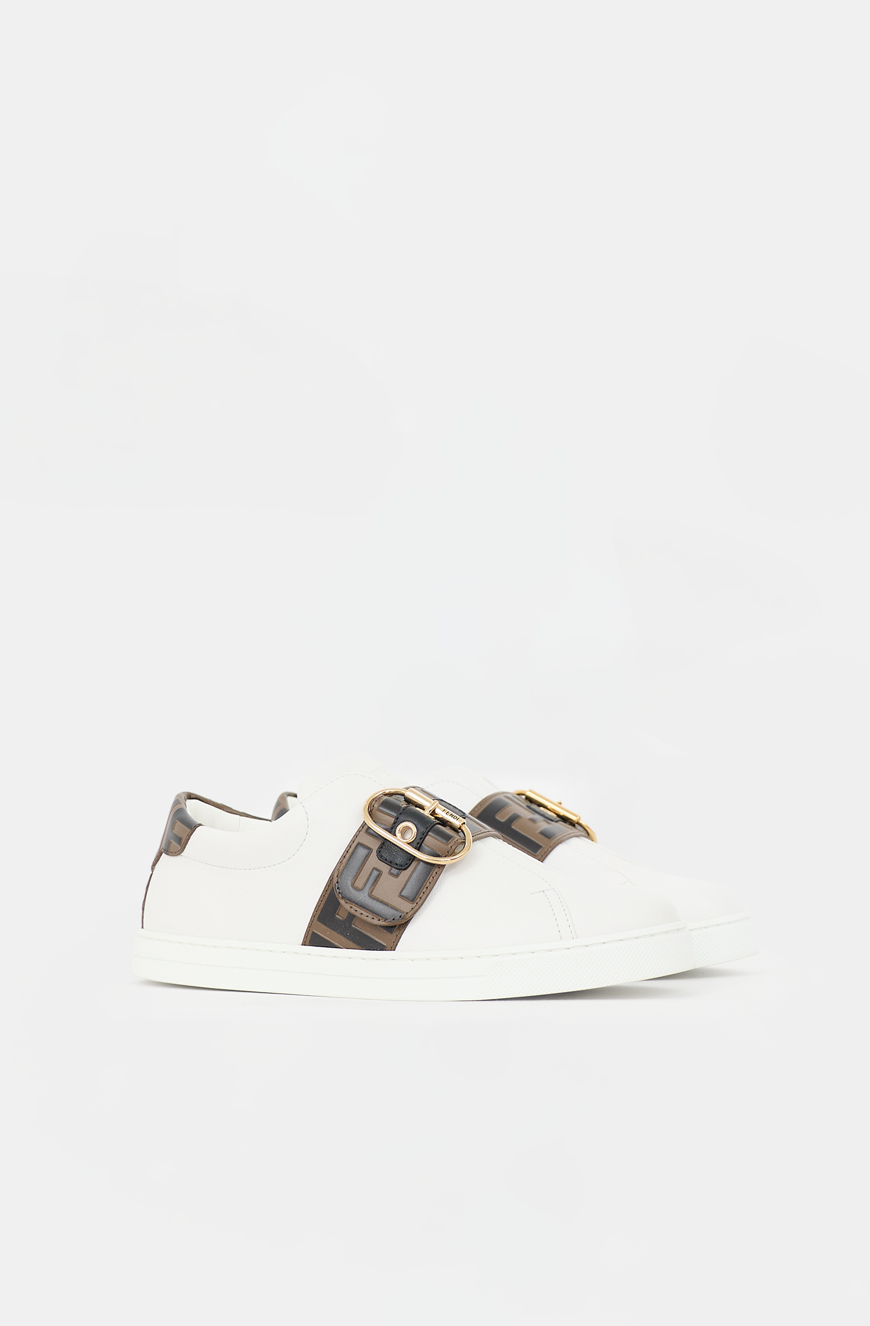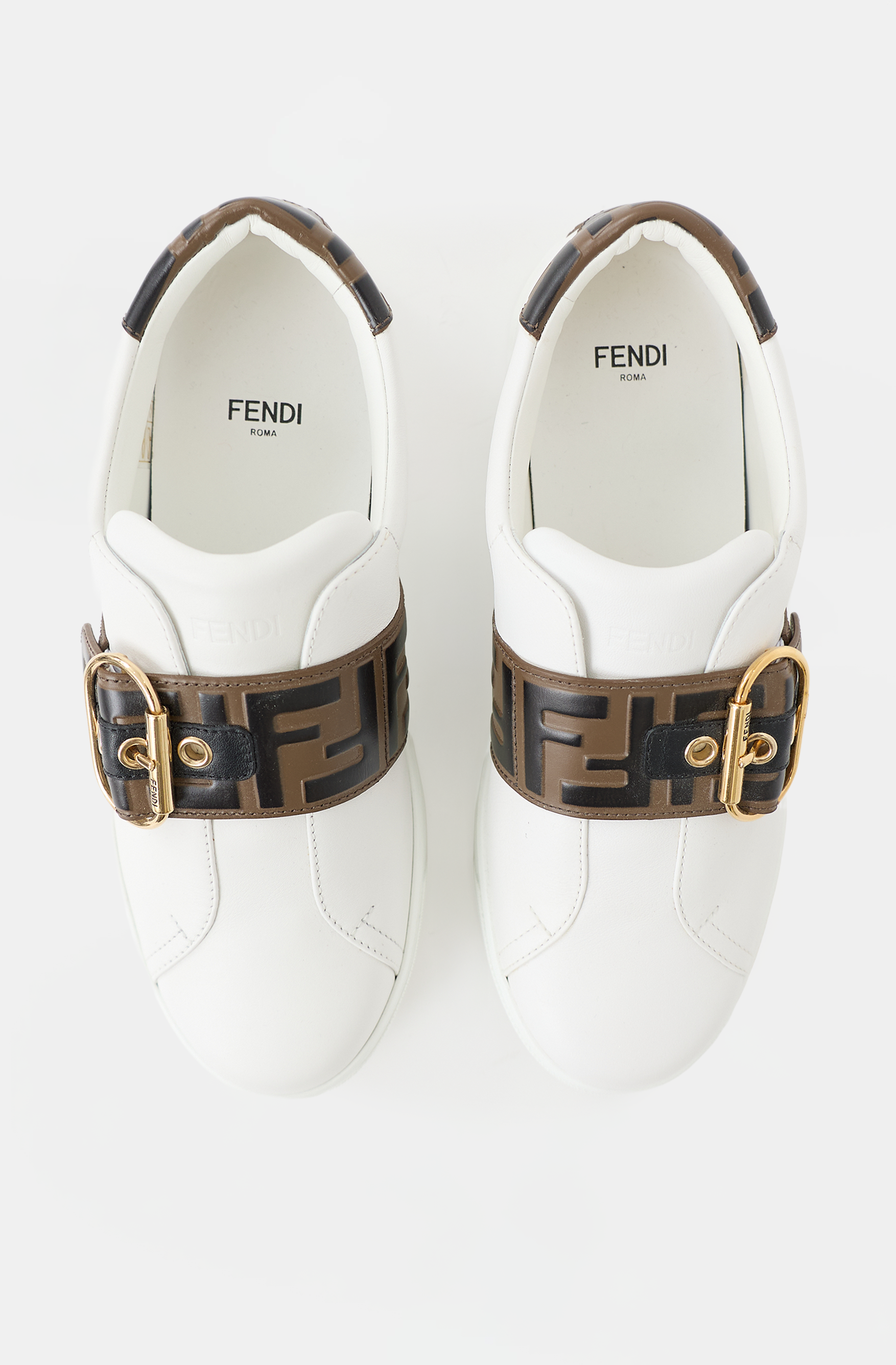 Pre-owned Fendi white leather sneakers featuring rounded toe, brown FF Zucca buckle instep strap, debossed logo at tongue, FF Zucca panel at counter, and rubber sole with debossed logo at heel. Comes with original box.