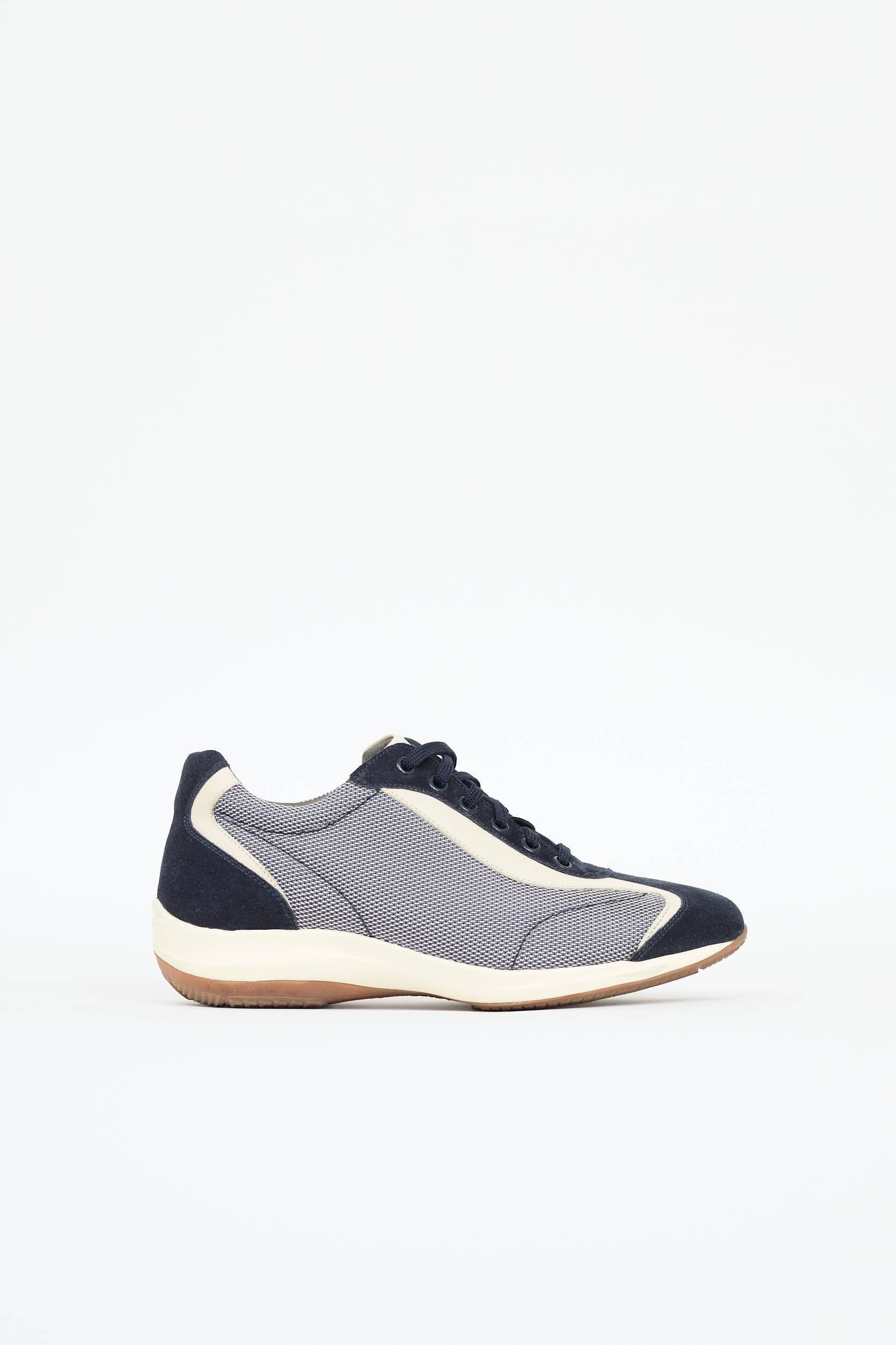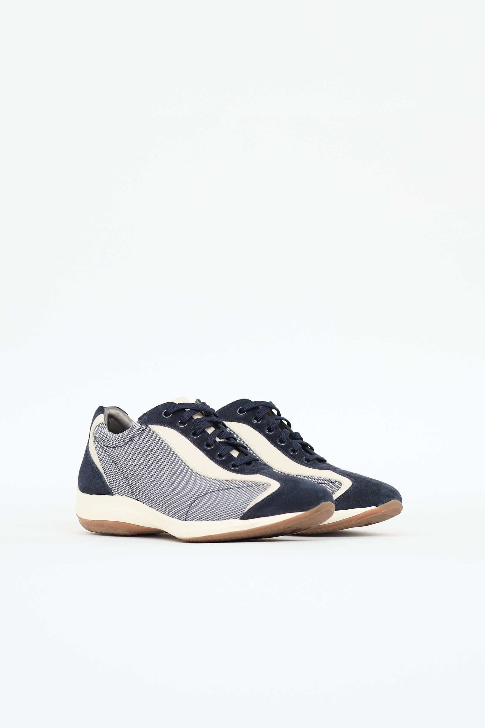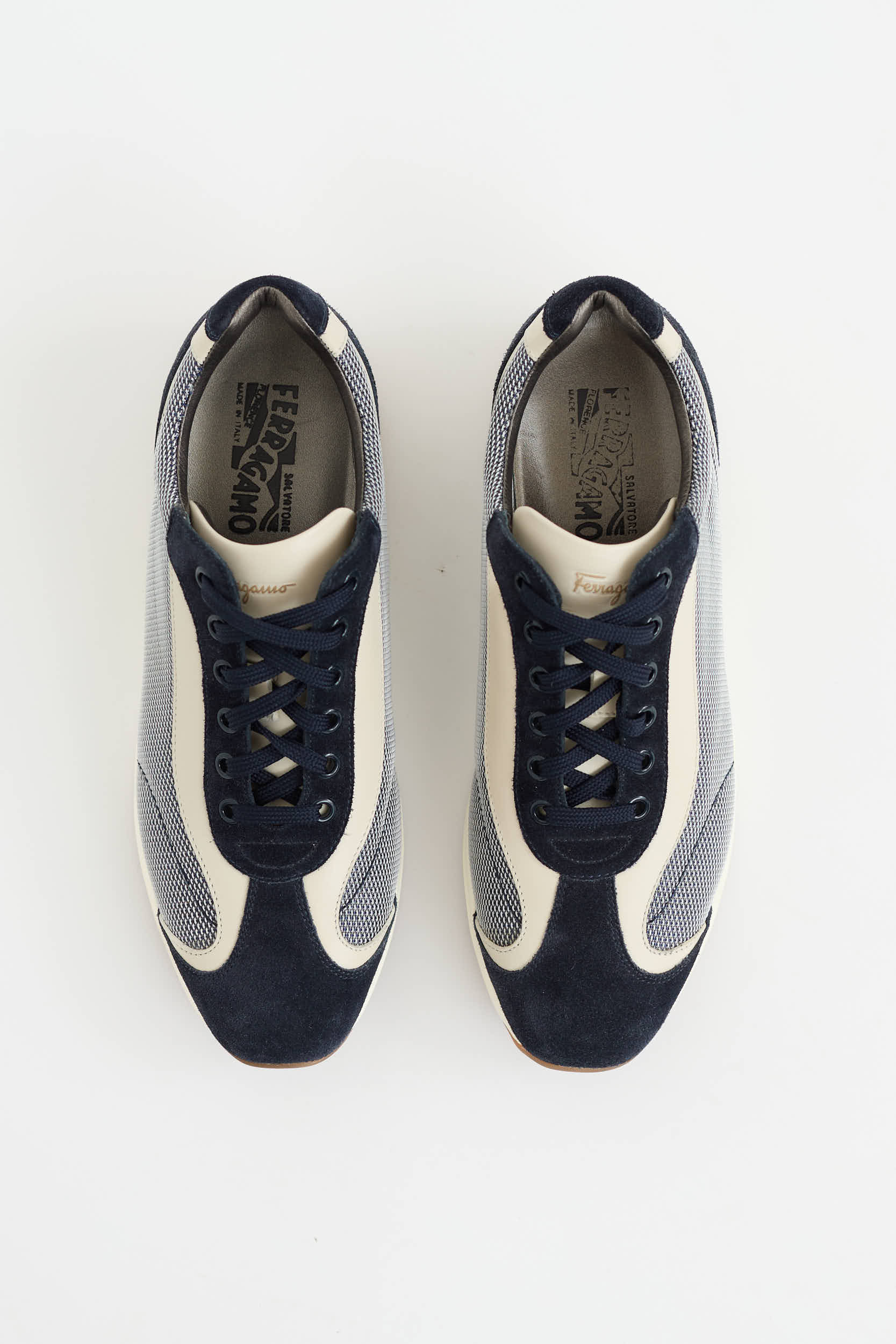 Pre-owned Ferragamo navy and cream Diana sneakers featuring almond toe, suede and textile upper, tonal embossed logo at back, stamped logo at tongue, and lace up vamp. Includes original box.