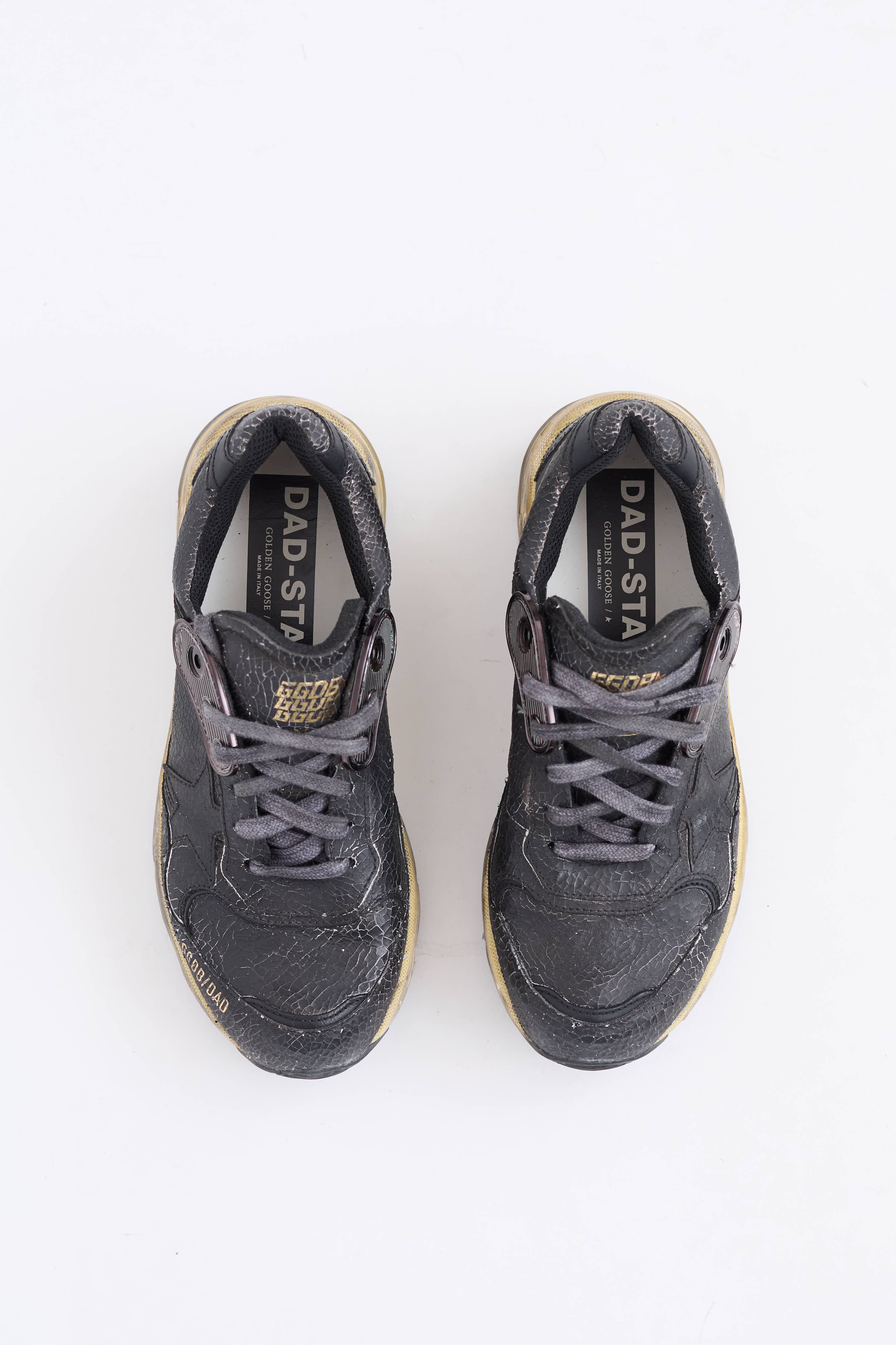 Pre-owned Golden Goose black leather Dad Star sneakers featuring round toe, cracked leather upper, lace up vamp, stamped logo at tounge, and signature star at side.