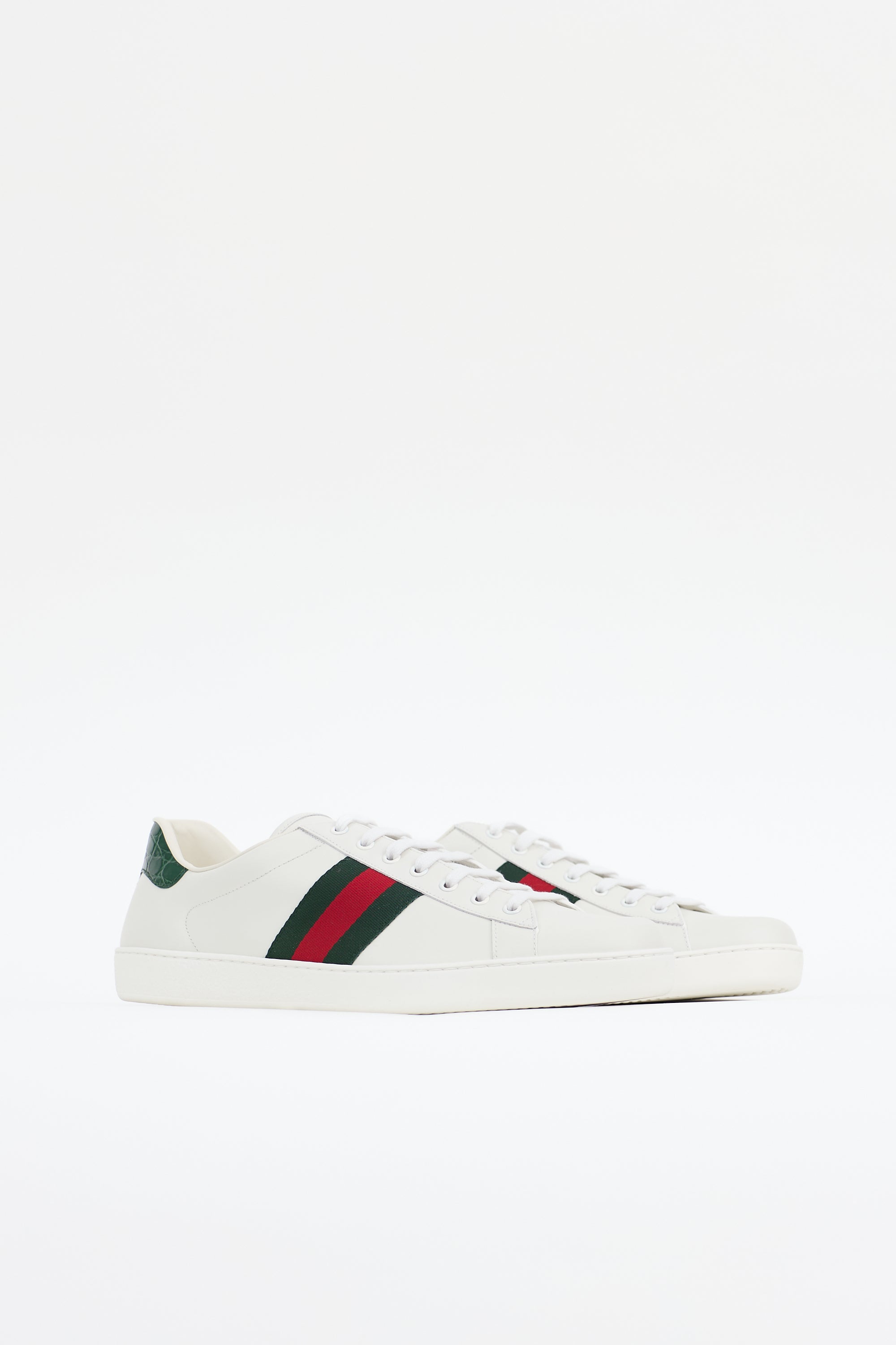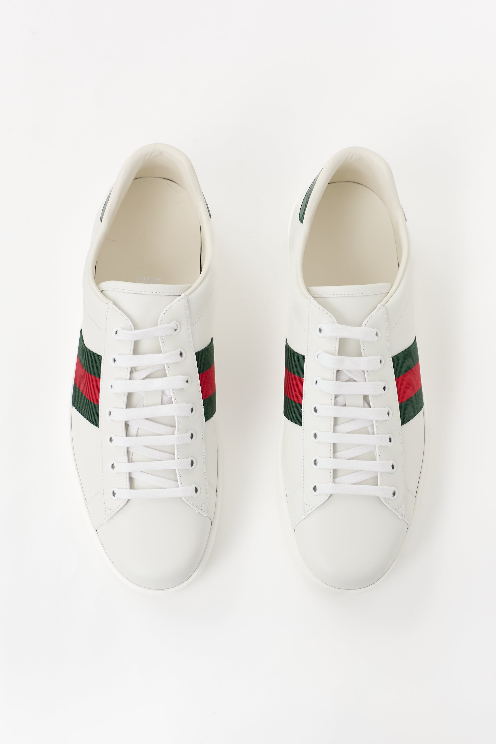 Pre-owned Gucci white leather sneakers featuring a rounded toe, lace up front, green and red striped web at sides, green textured leather counter with debossed logo, and rubber outsole. Comes with original dust bag and box.