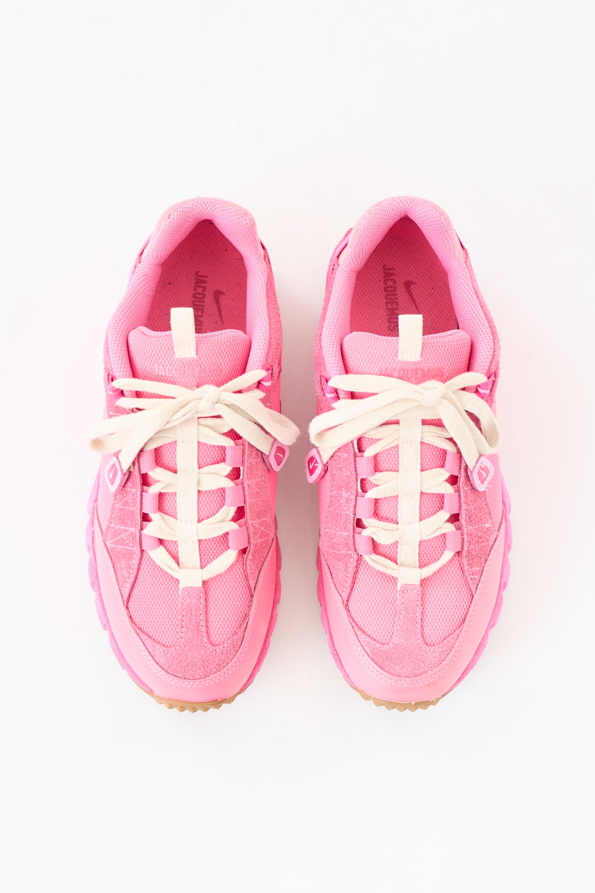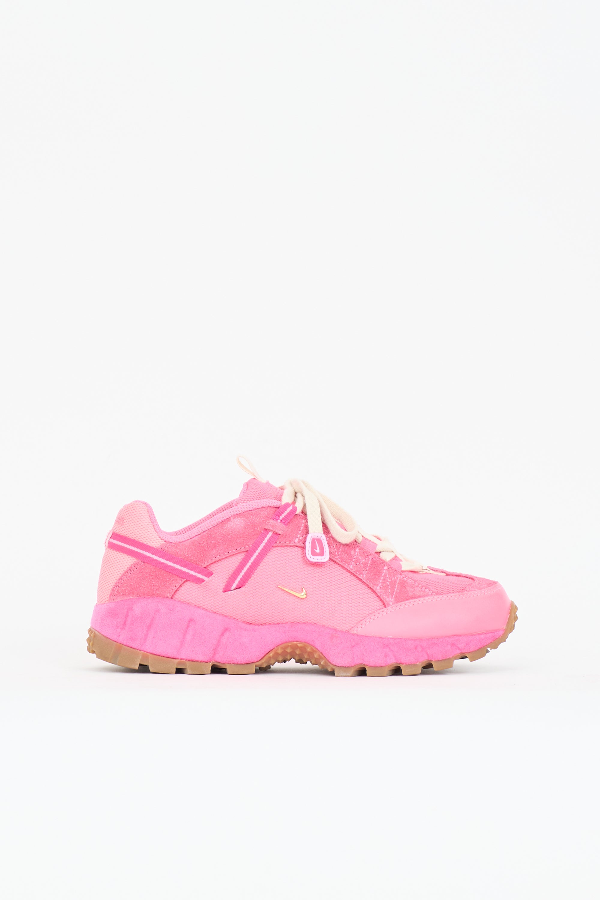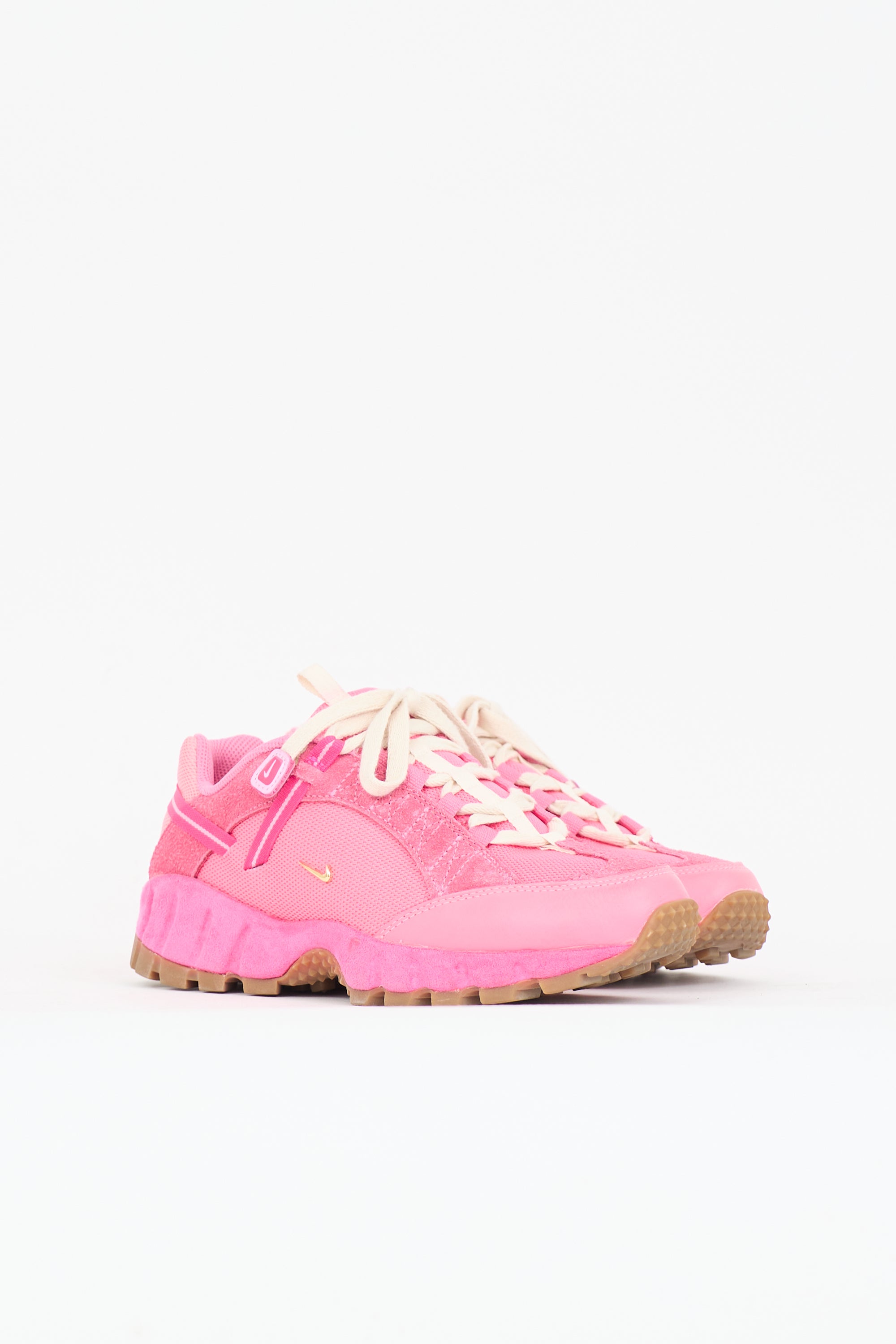 Pre-owned Jacquemus X Nike neon pink Air Humara RX sneakers featuring a rounded toe, lace up front, gold tone signature Swoosh embellishment at sides, rubberized logo at counter, and rubber sole.