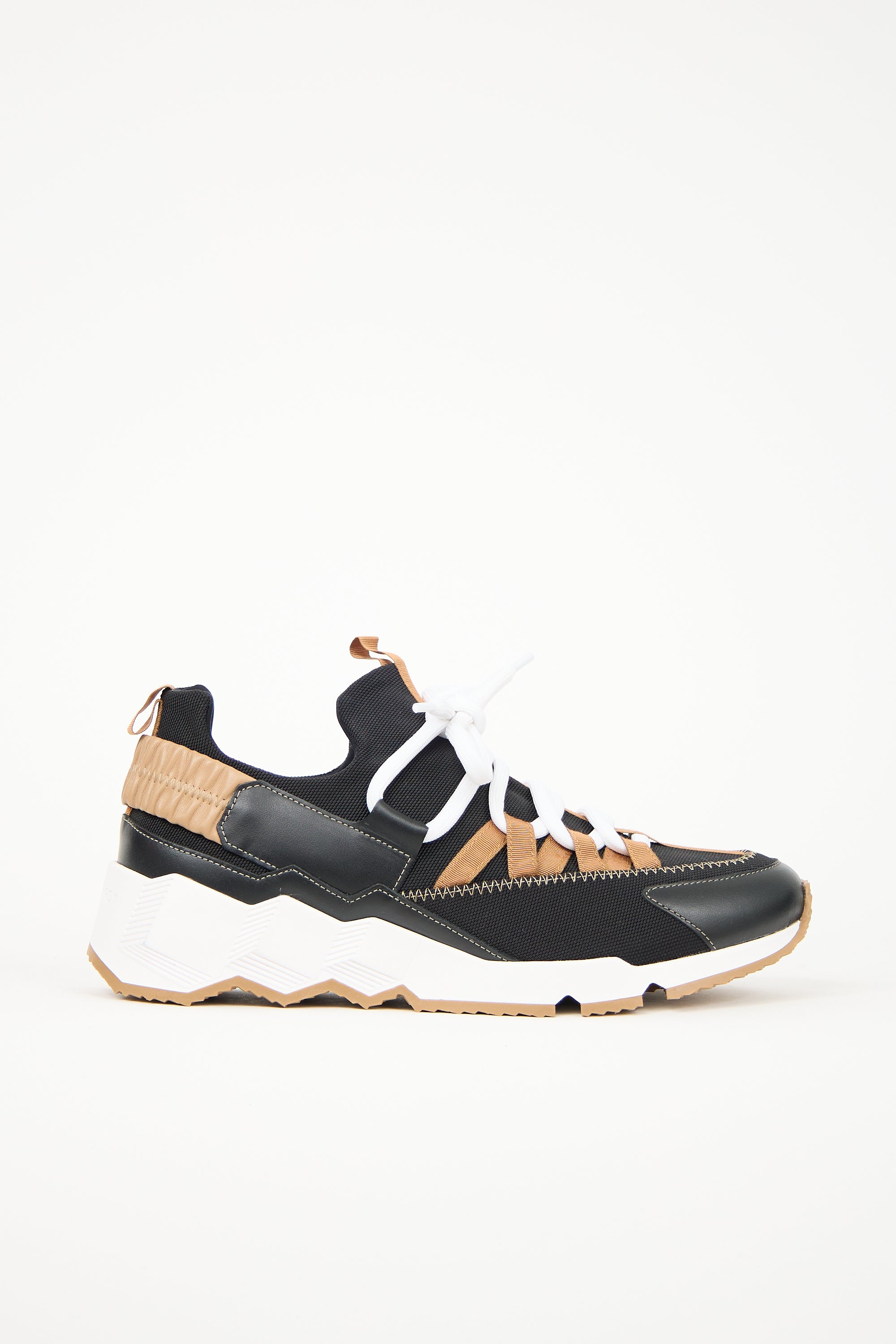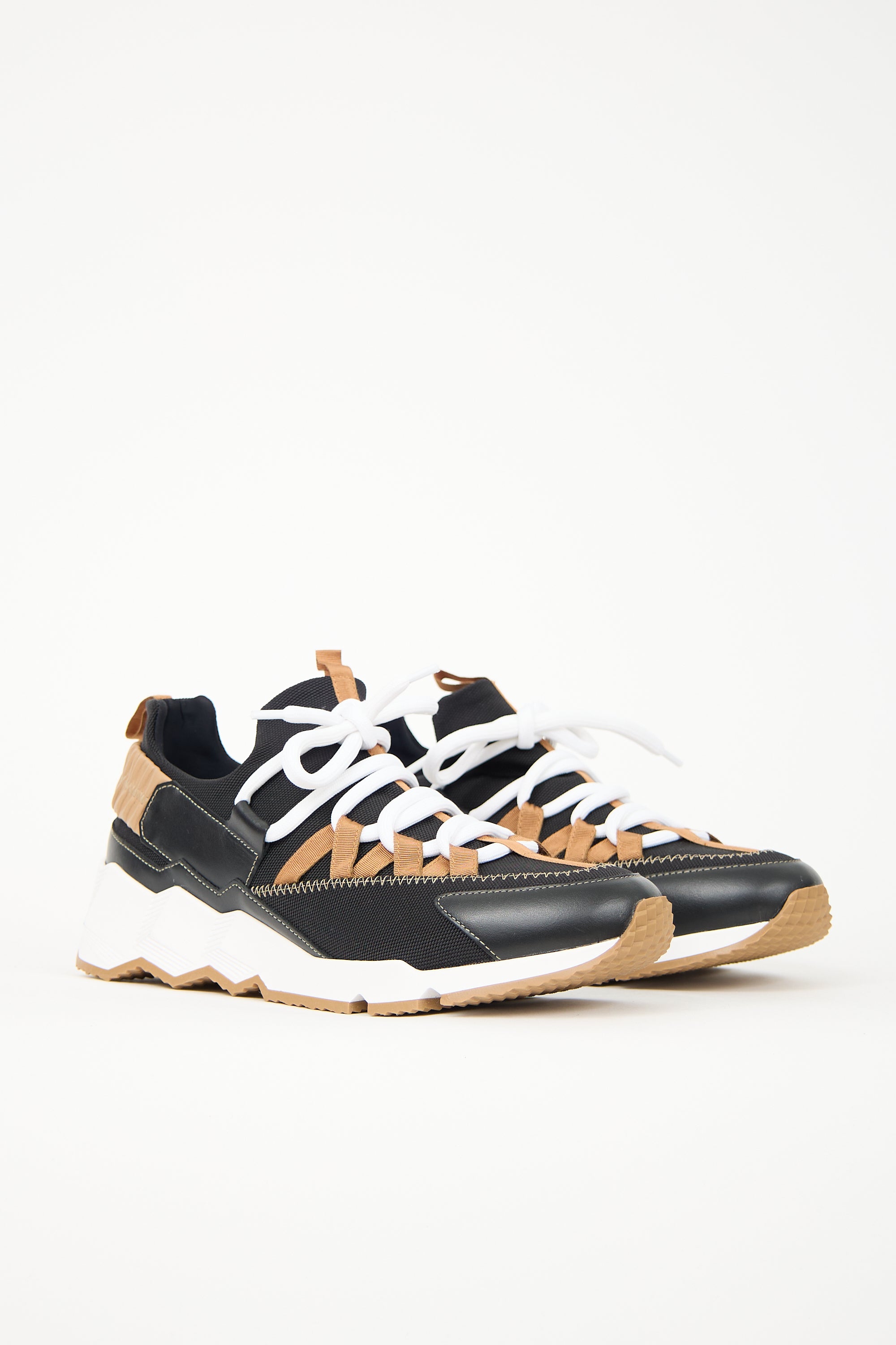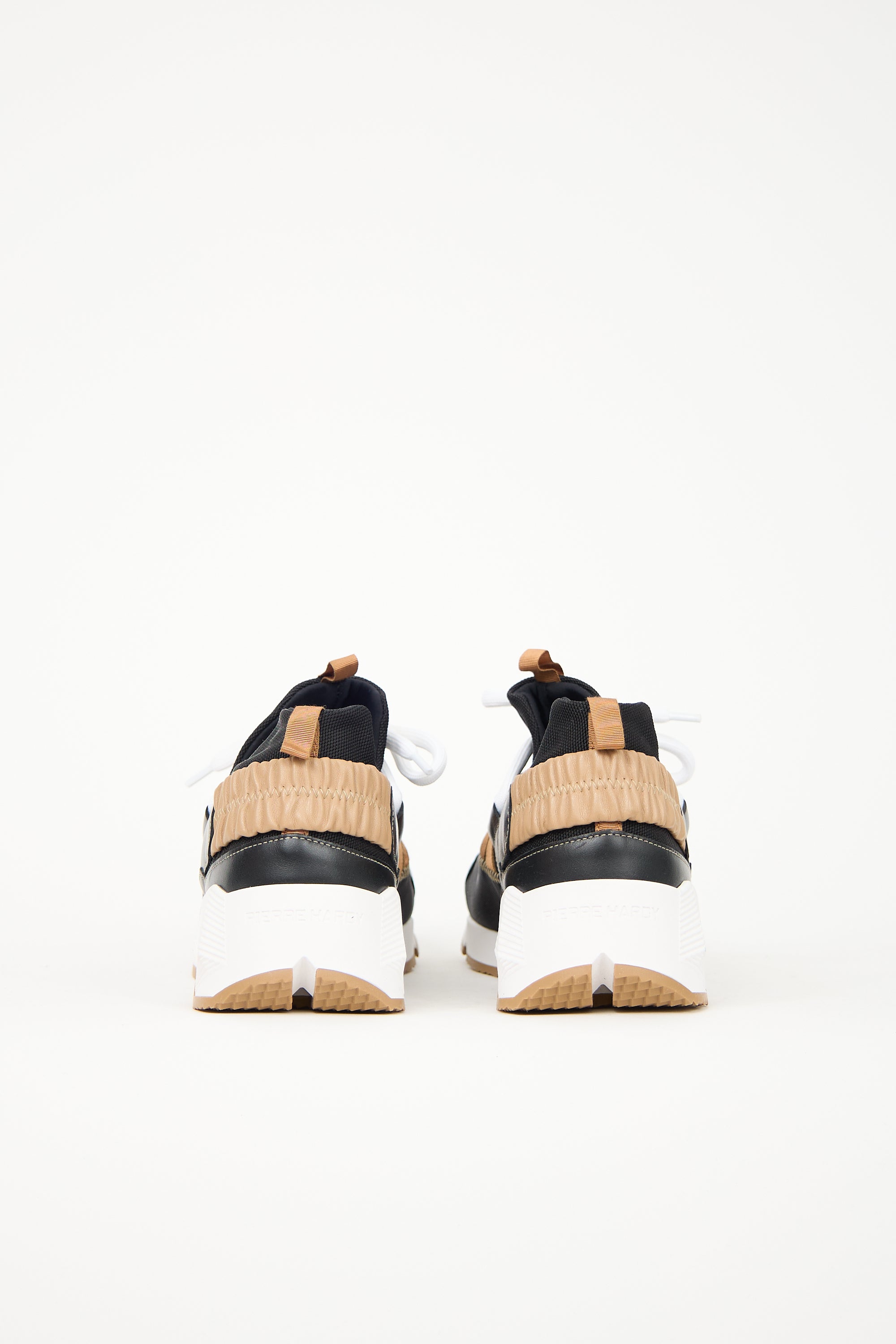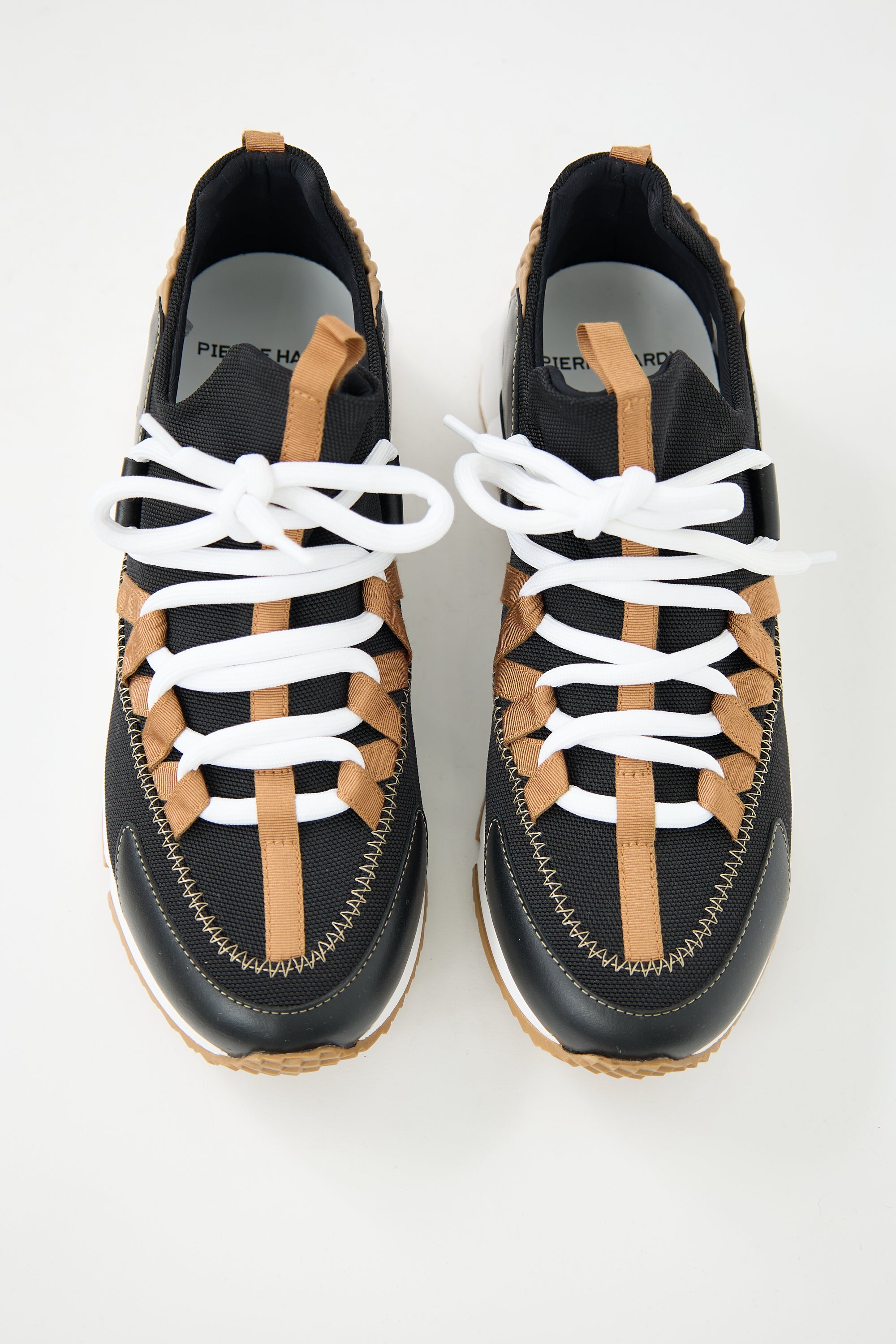 Pre-owned Pierre Hardy black and brown Trek Comet sneakers featuring a rounded leather cap toe, lace up vamp, pull tab at tongue and collar, elasticized leather strap at counter, grosgrain ribbon throughout, and a geometric rubber midsole with debossed logo at heel. Comes with original dust bags and additional black laces.