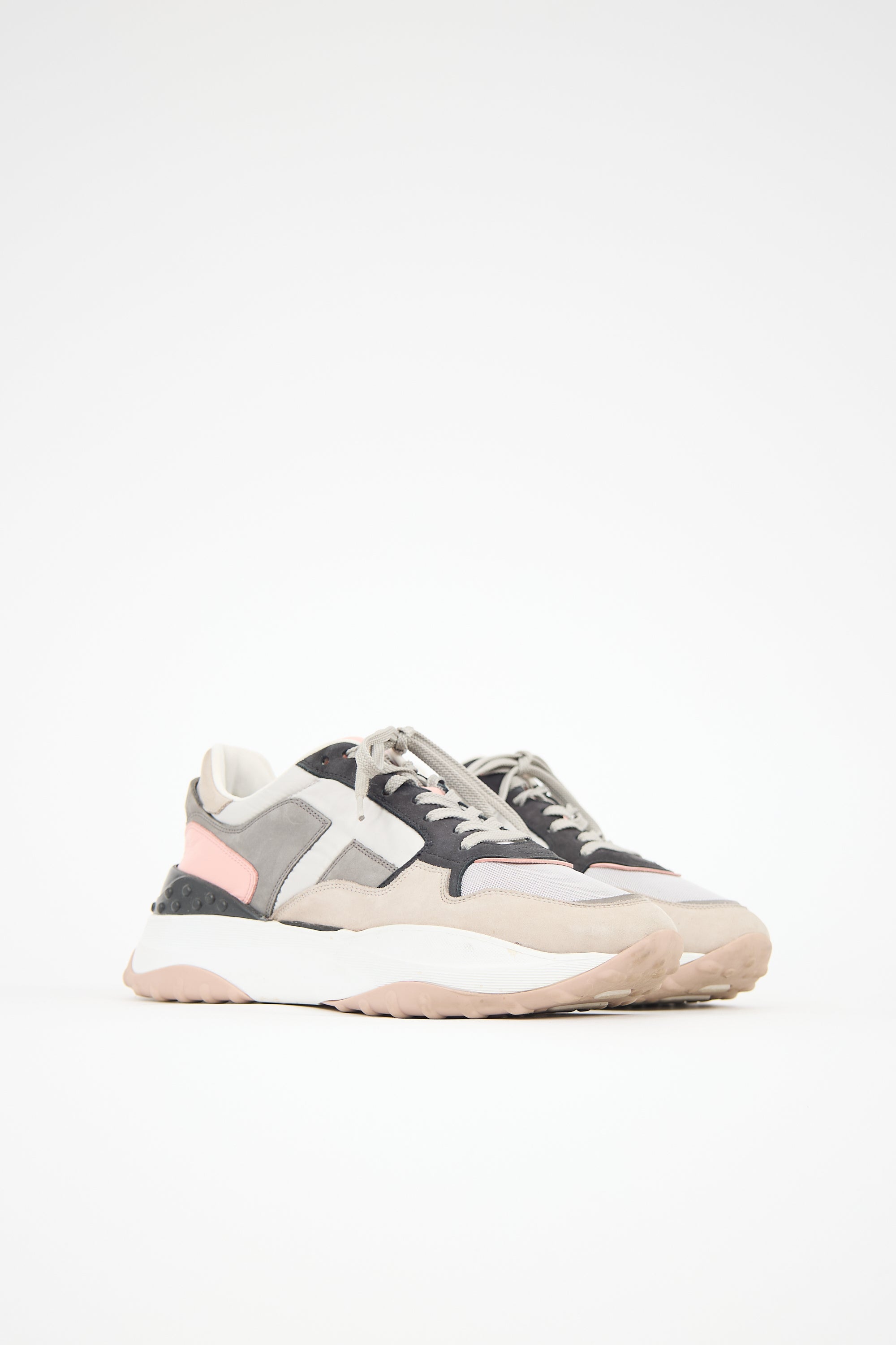 Pre-owned Tod's grey and pink suede Sporty 45 sneakers featuring a rounded mesh toe, lace up front, embroidered logo at tongue, textured platform midsole. and rubber sole.