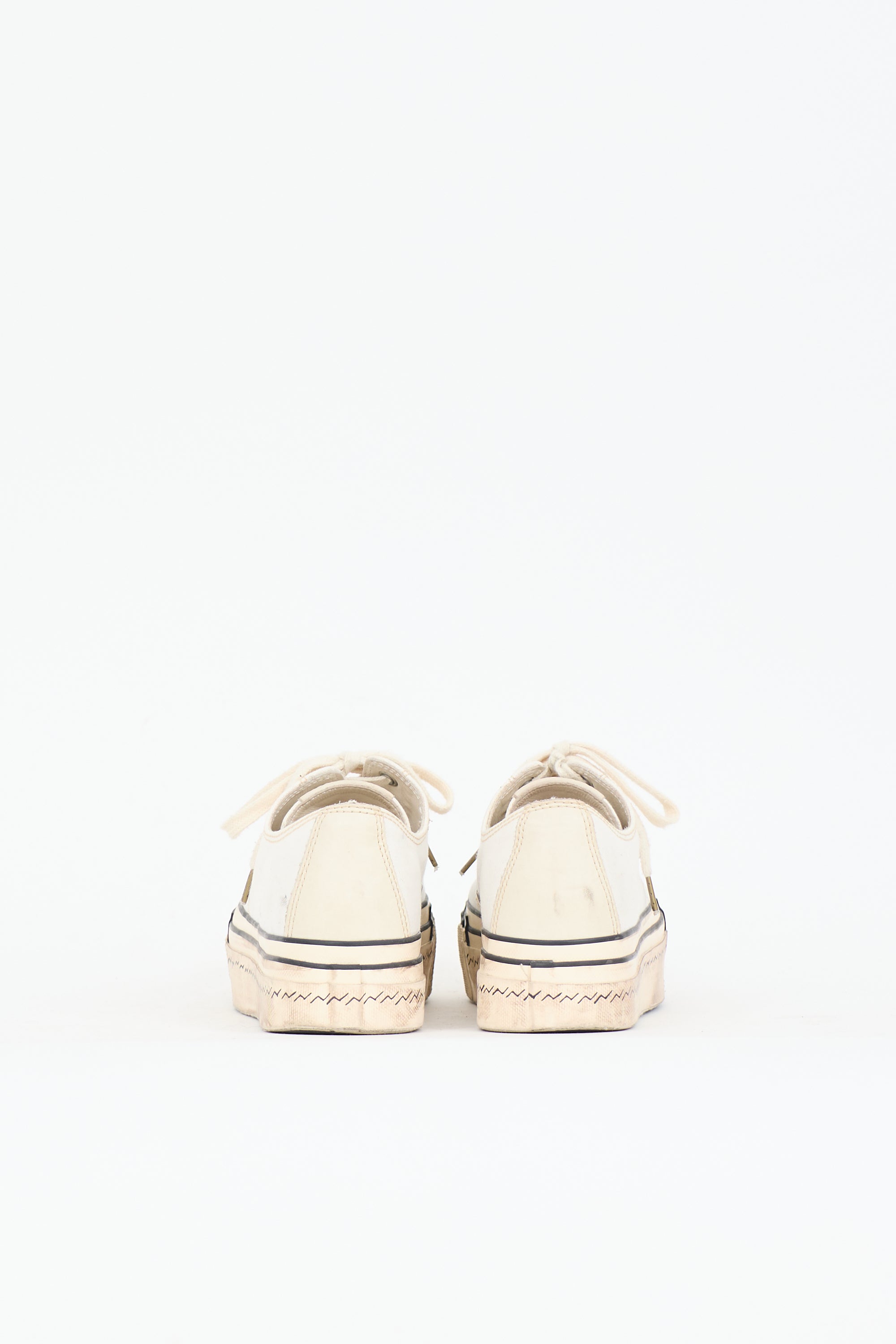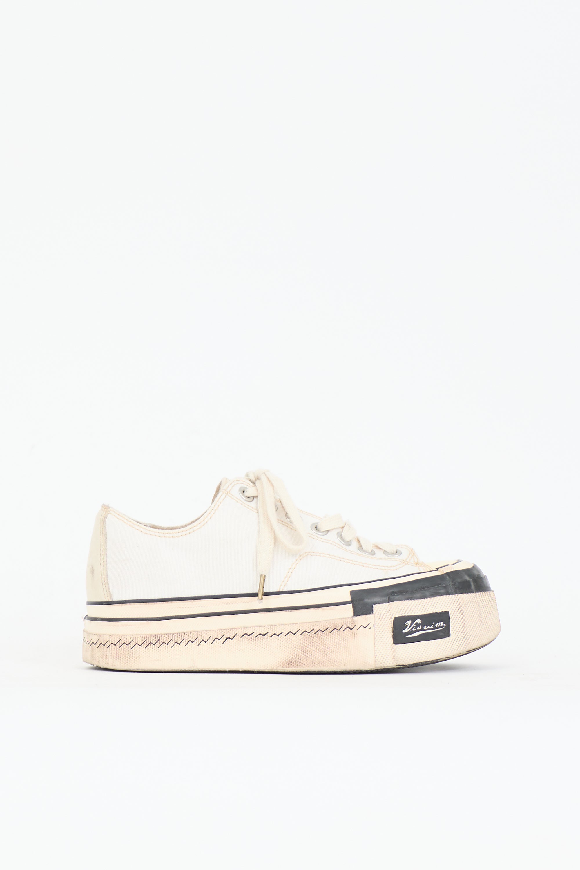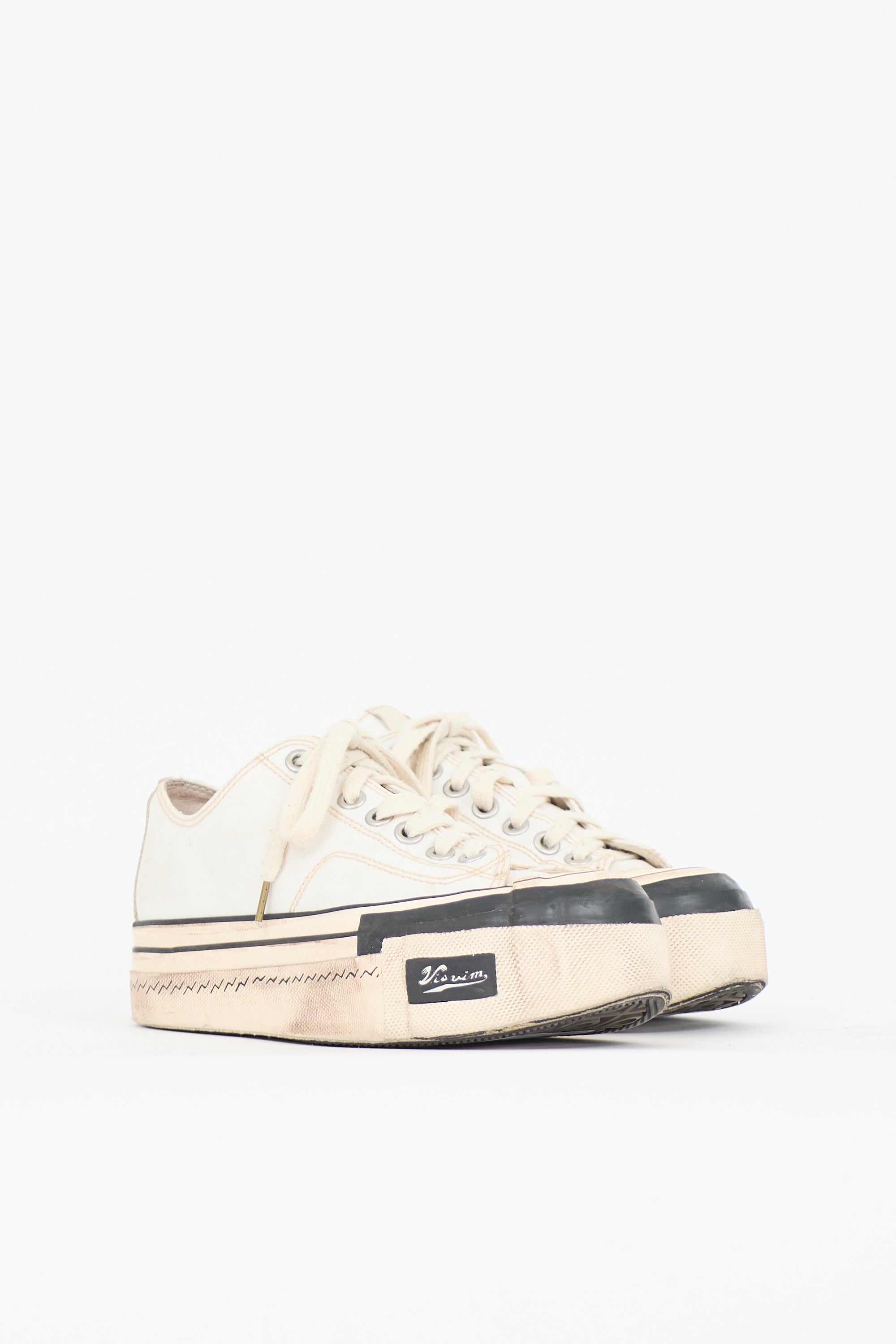 Pre-owned Visvim white canvas Skagway Lo G. Patten sneakers featuring a rounded toe, platform midsole, lace up front, and rubber sole.