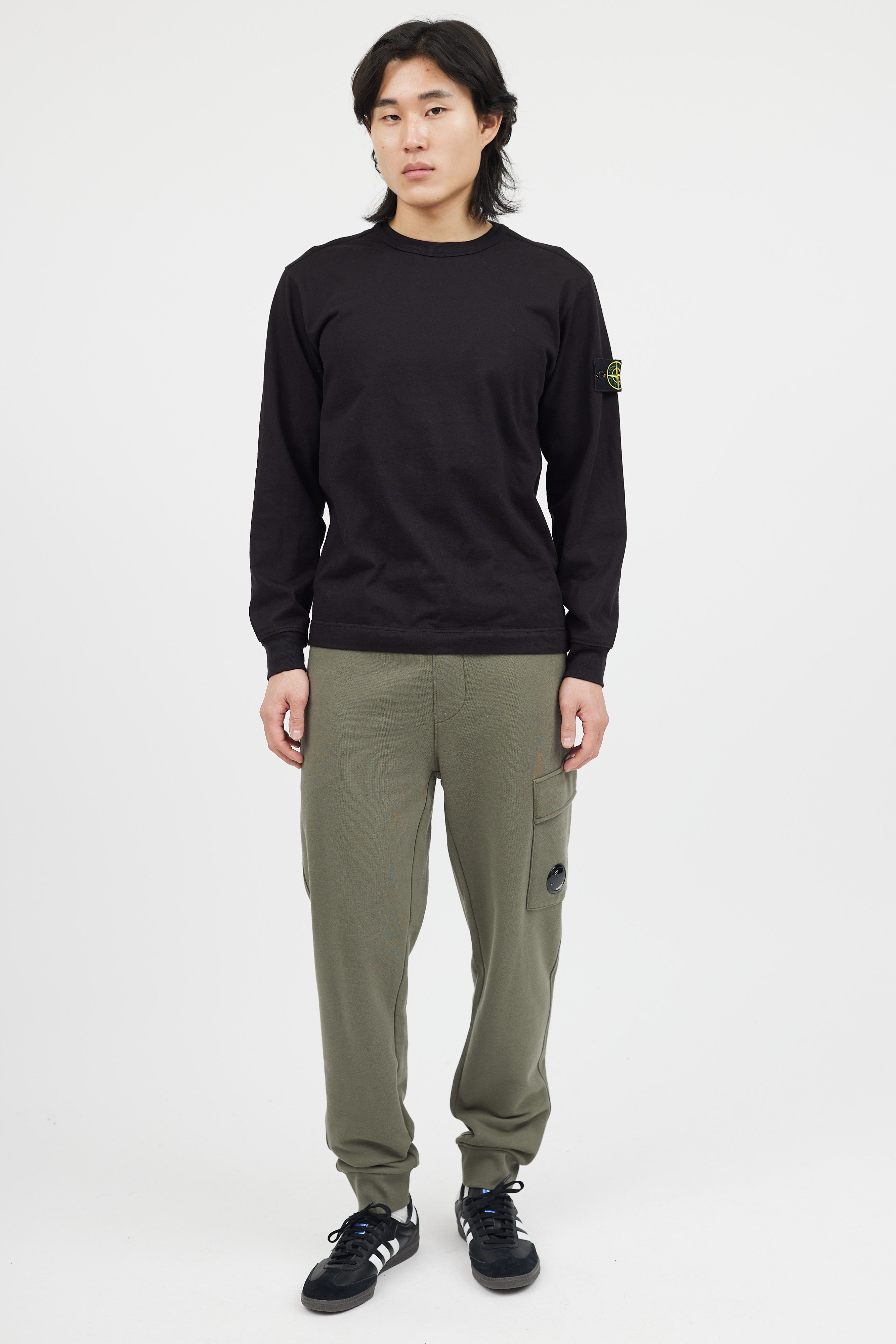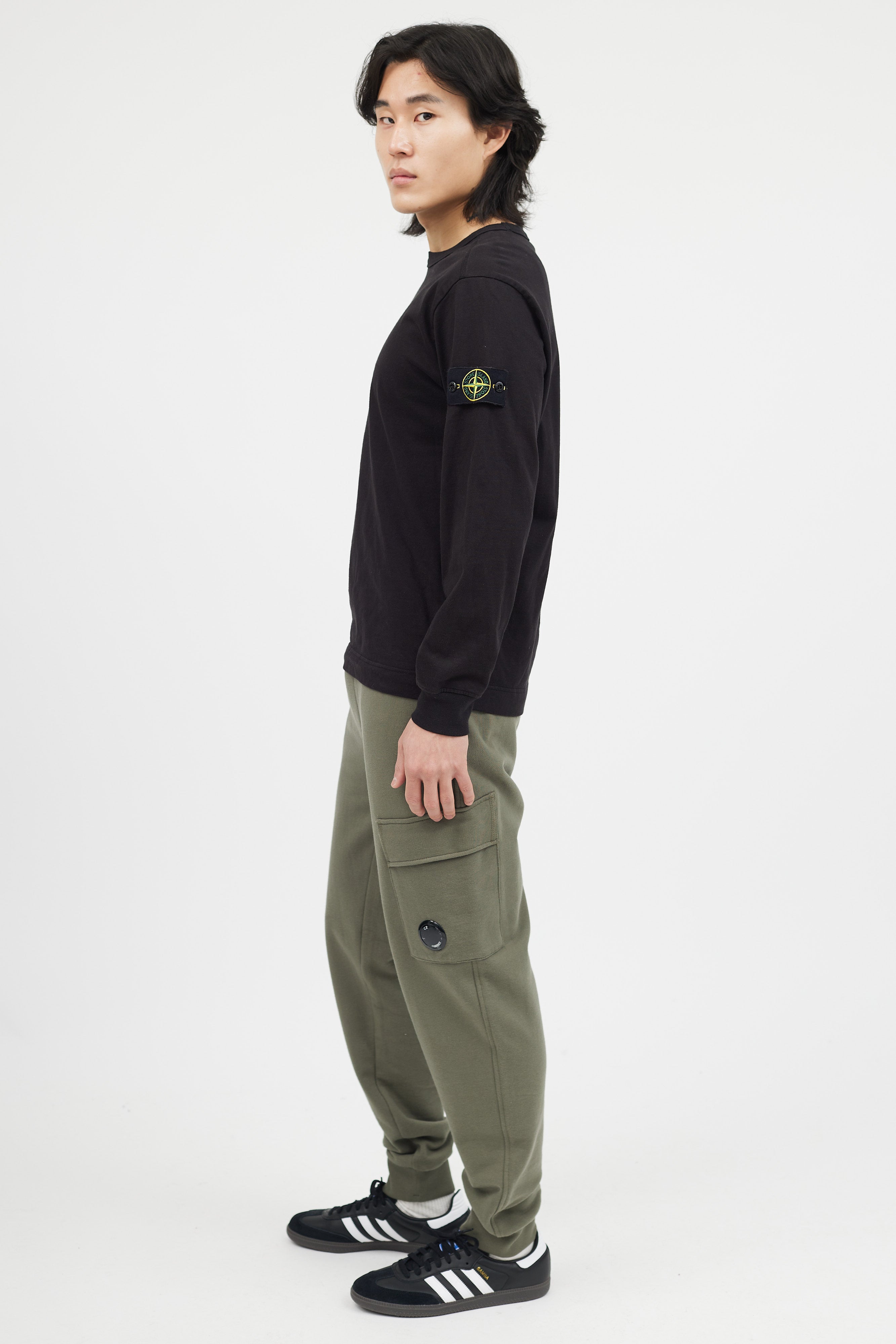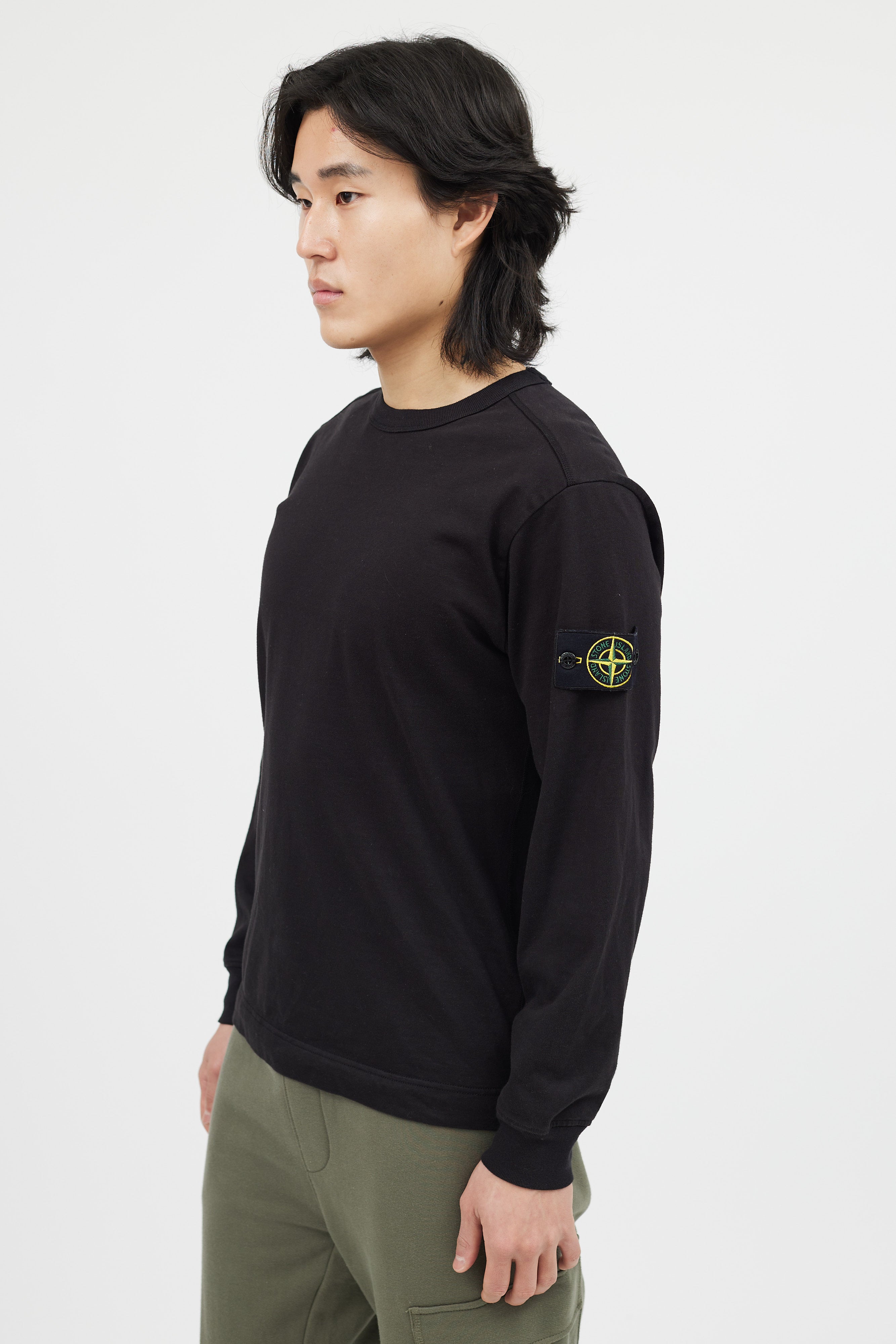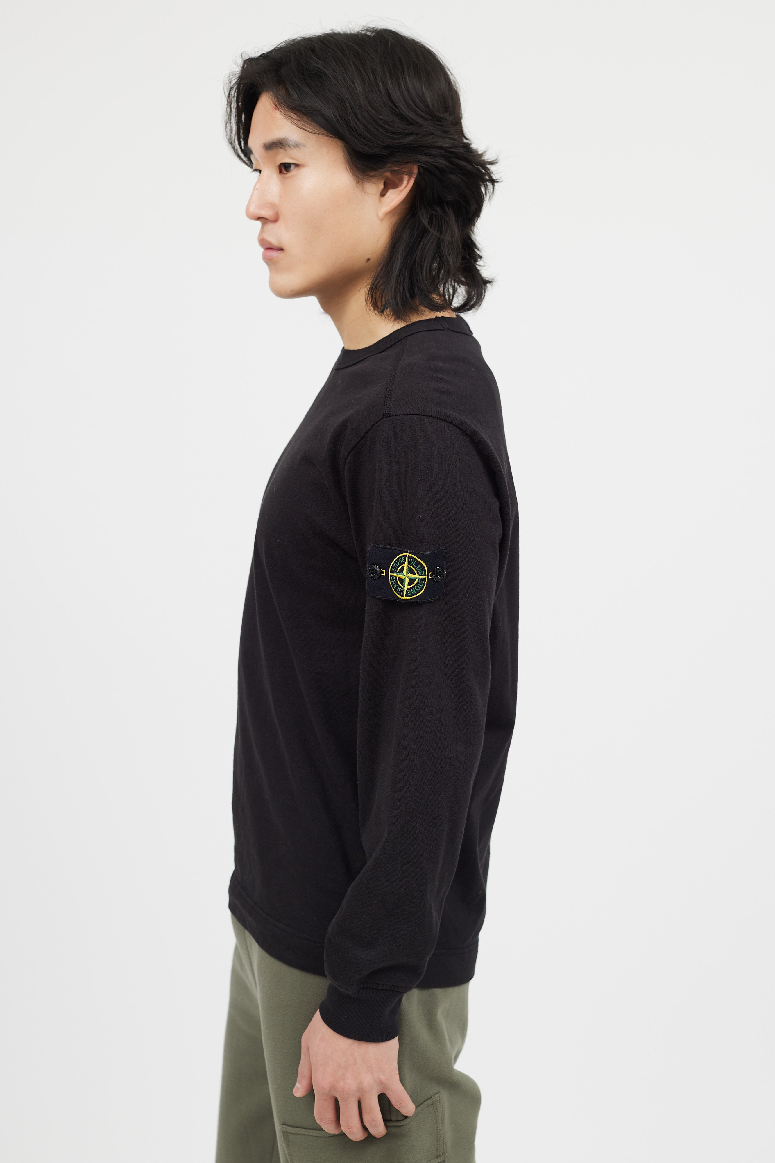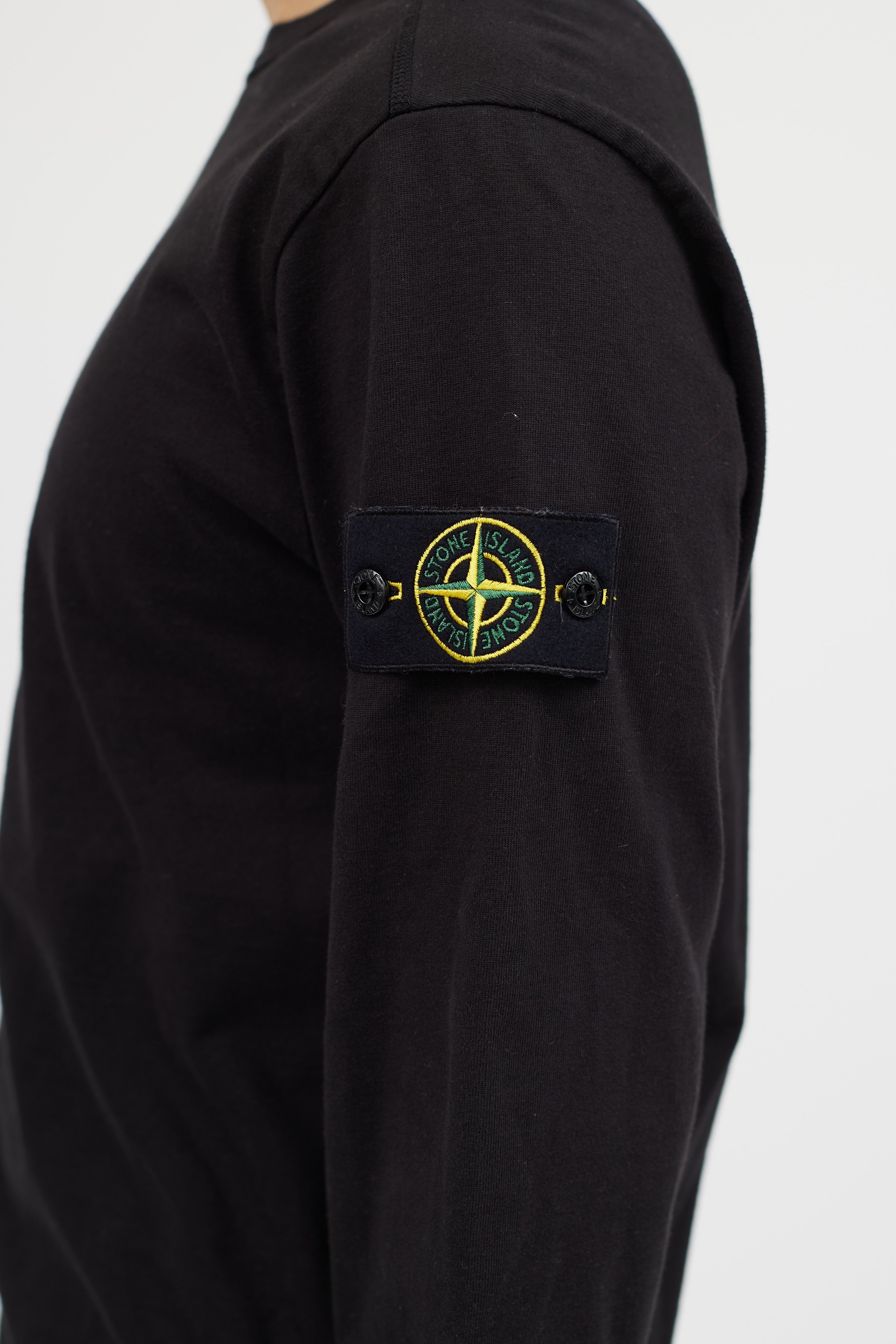 Pre-owned Stone Island black cotton sweater featuring mock neck, stone island badge on left sleeve, and ribbed cuffs and collar.