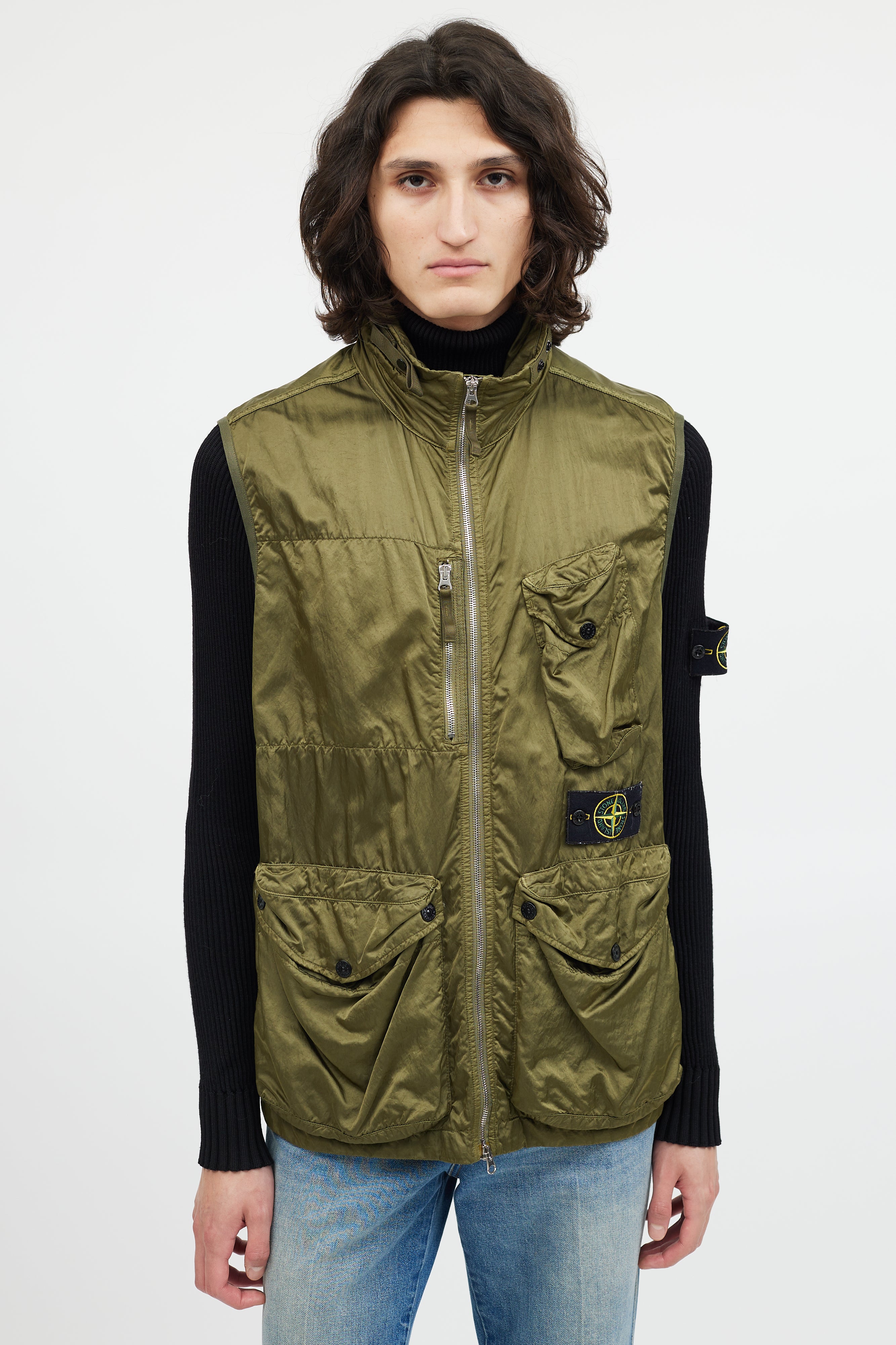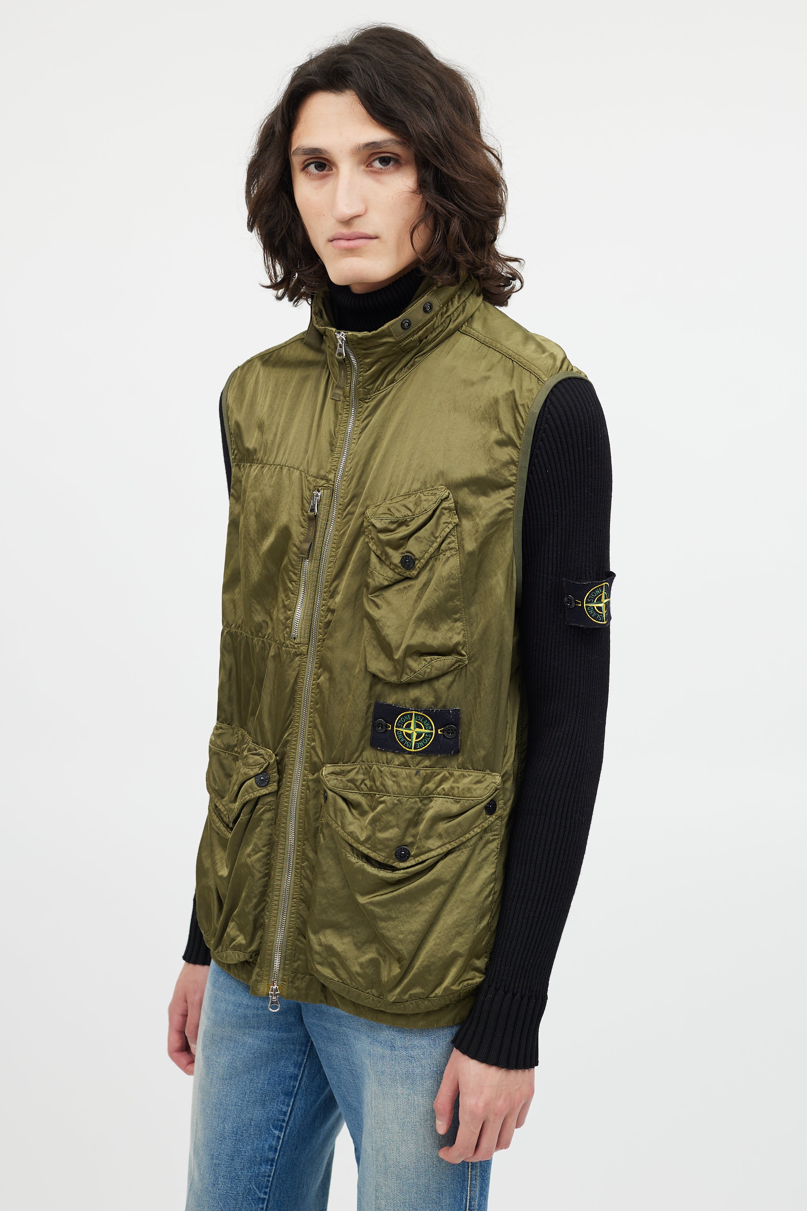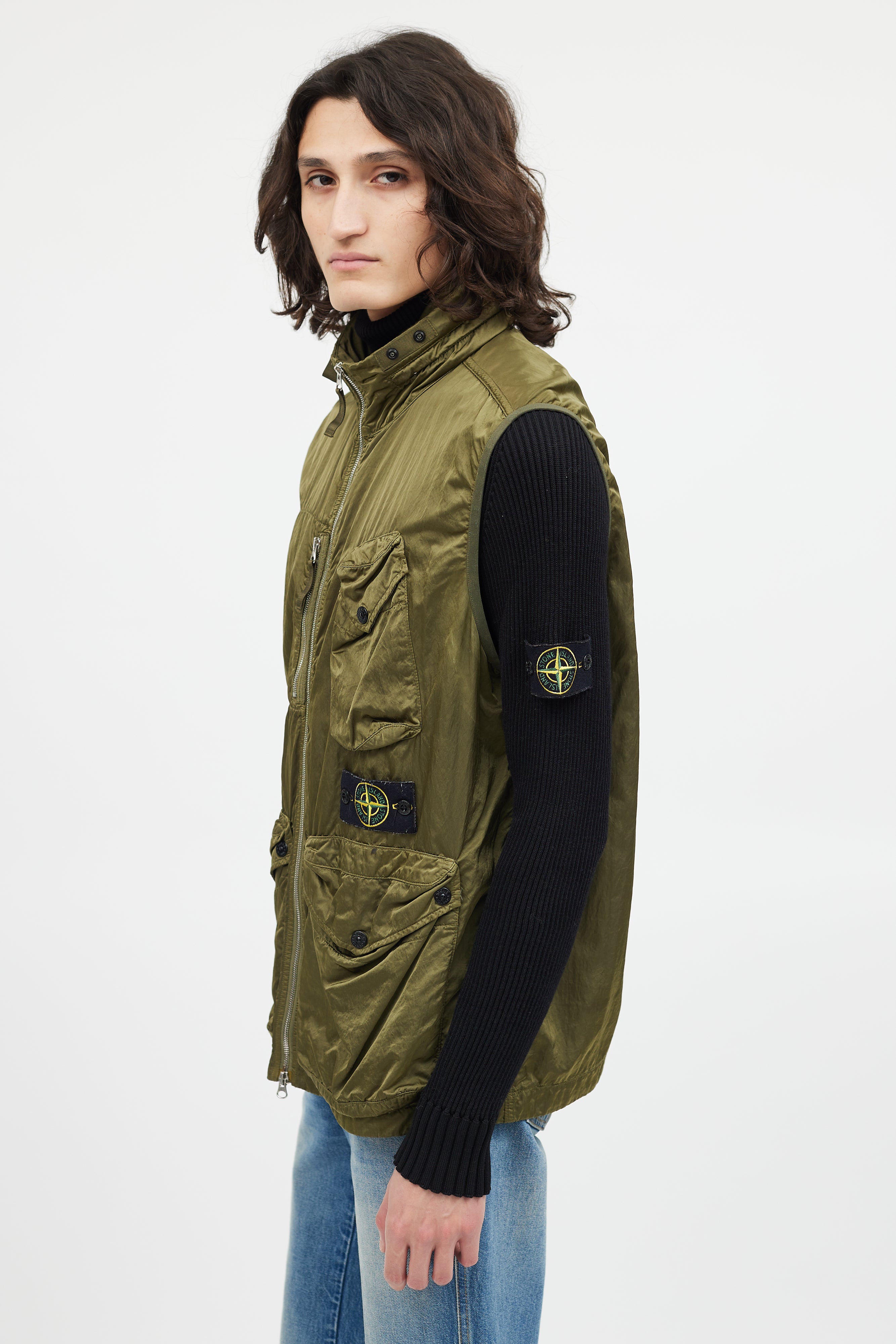 Pre-owned Stone Island green vest featuring two way zip closure, high neck, Stone Island patch at front left, three box pockets with one zip pocket at front and concealed zip out hood at collar. Lined.