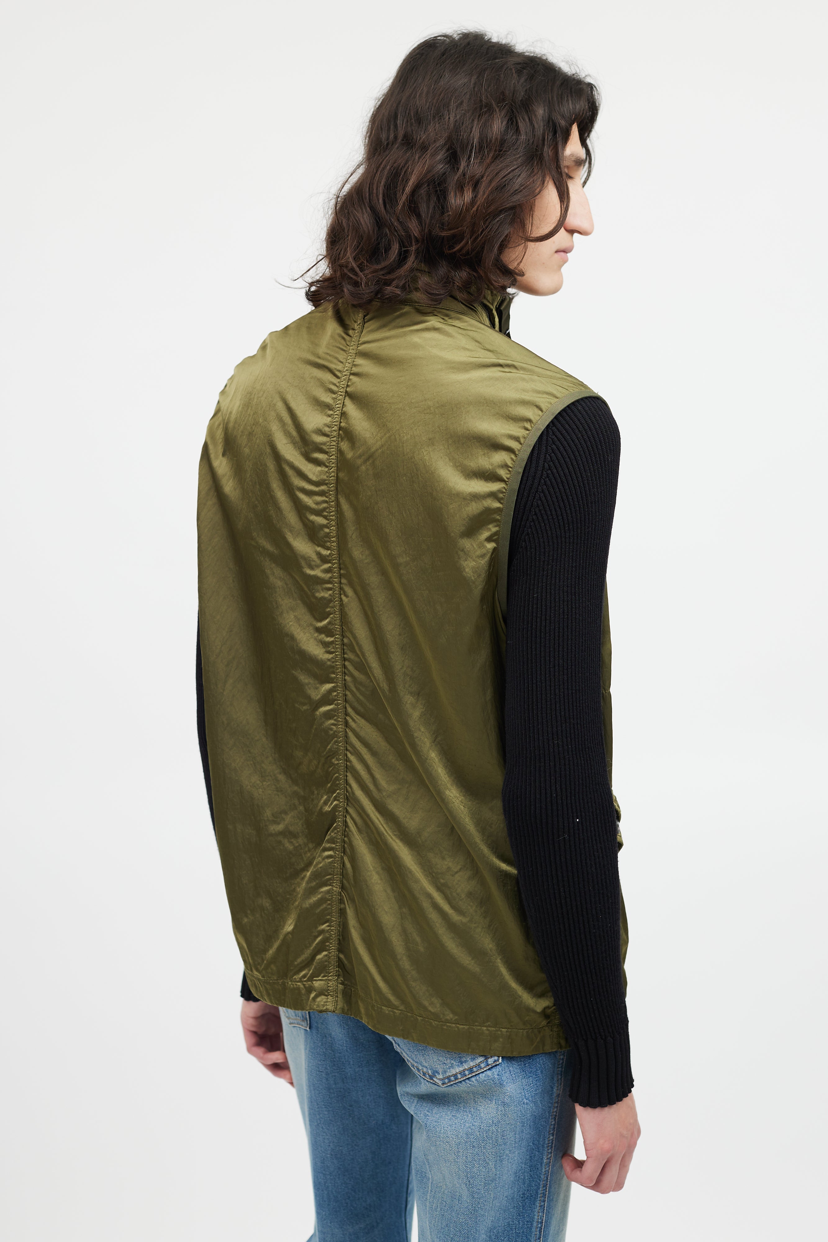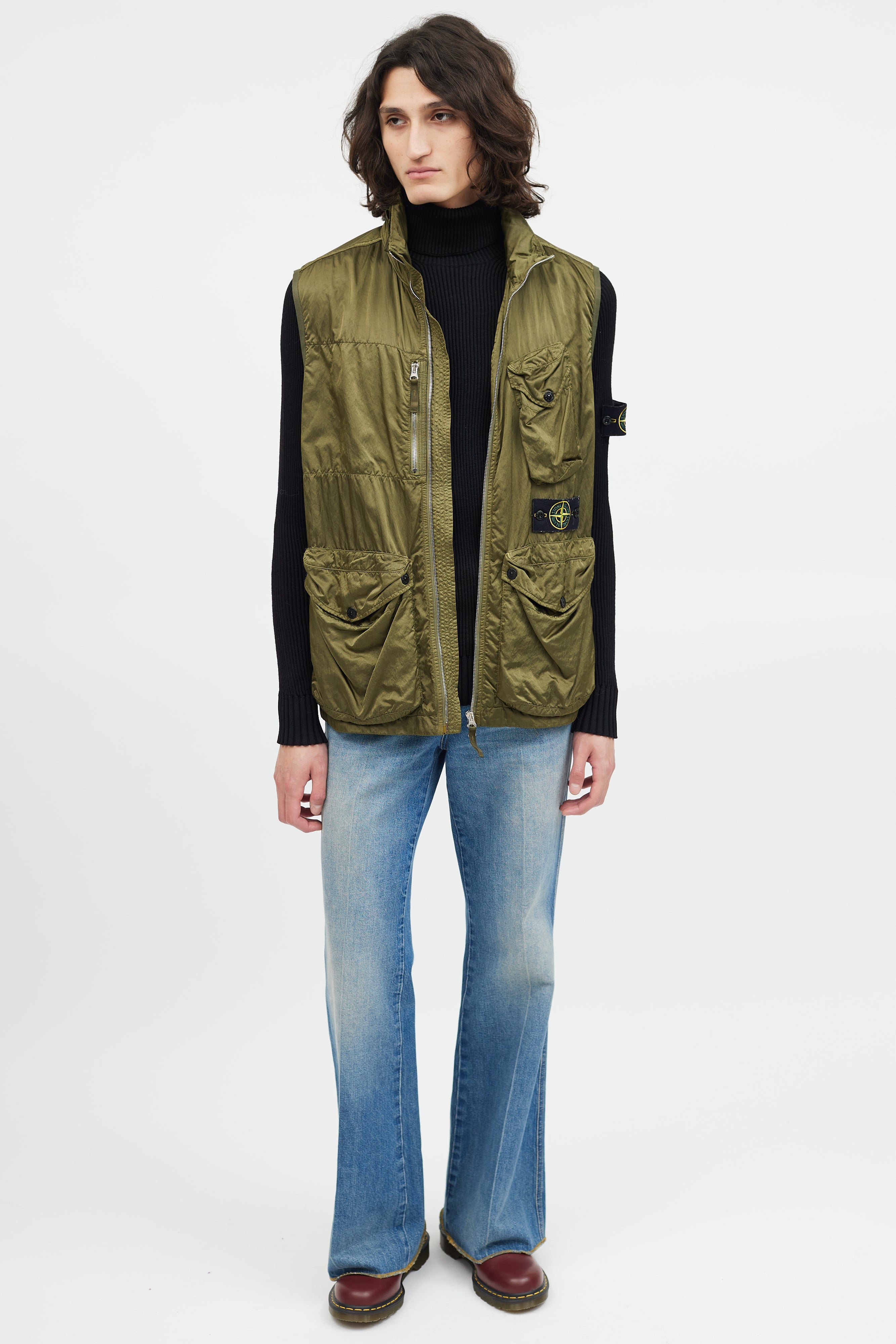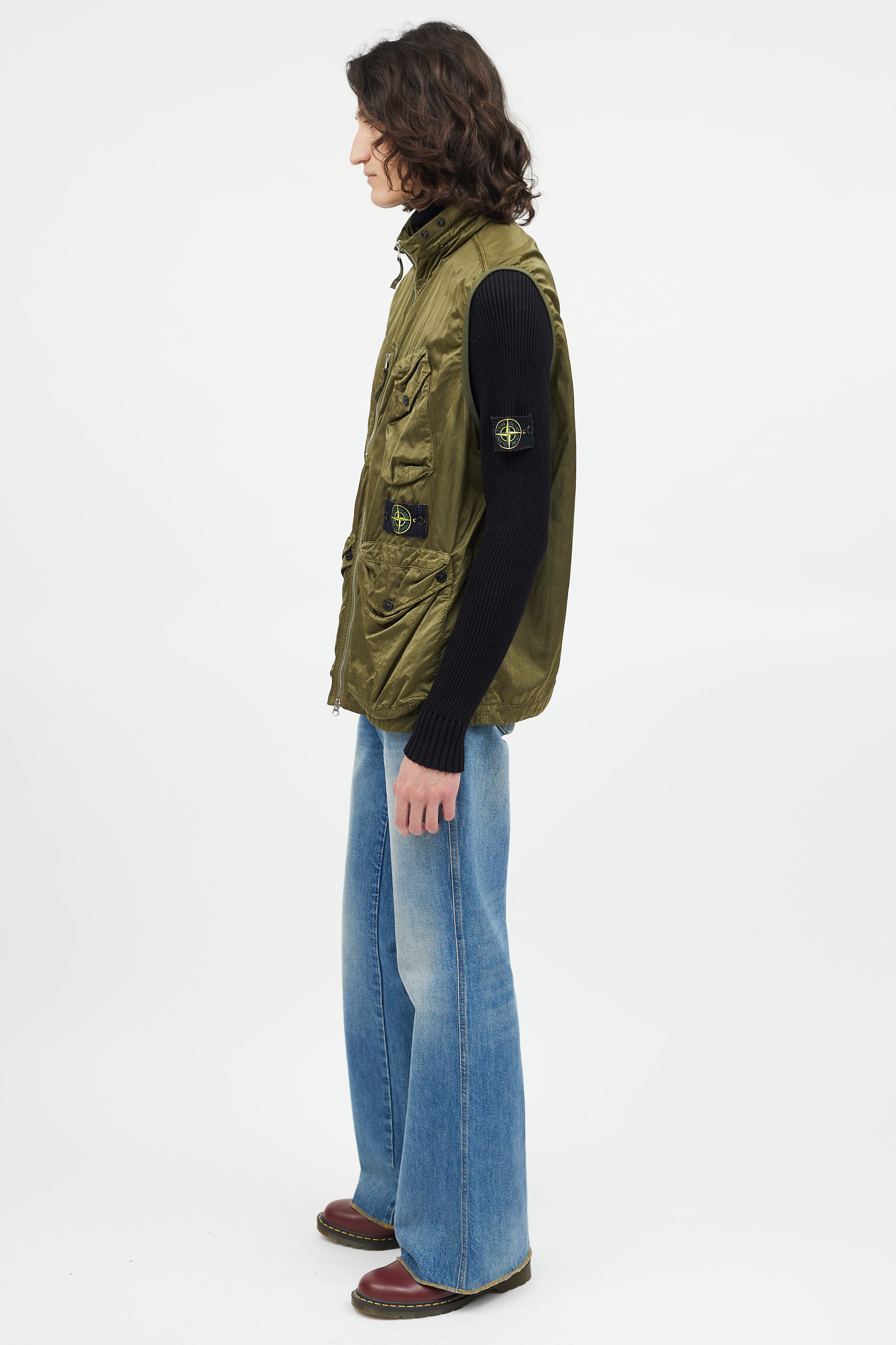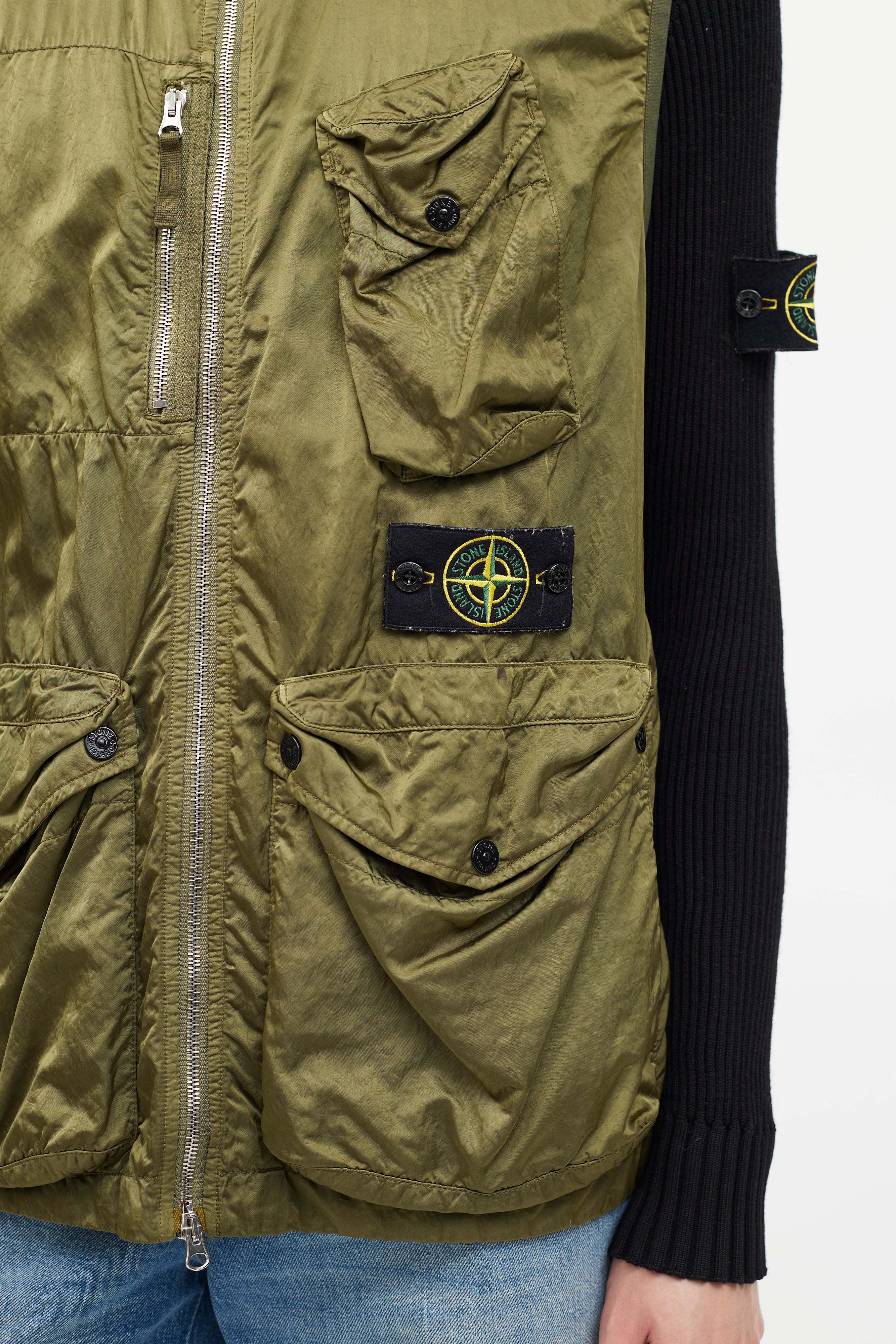 Pre-owned Stone Island green vest featuring two way zip closure, high neck, Stone Island patch at front left, three box pockets with one zip pocket at front and concealed zip out hood at collar. Lined.