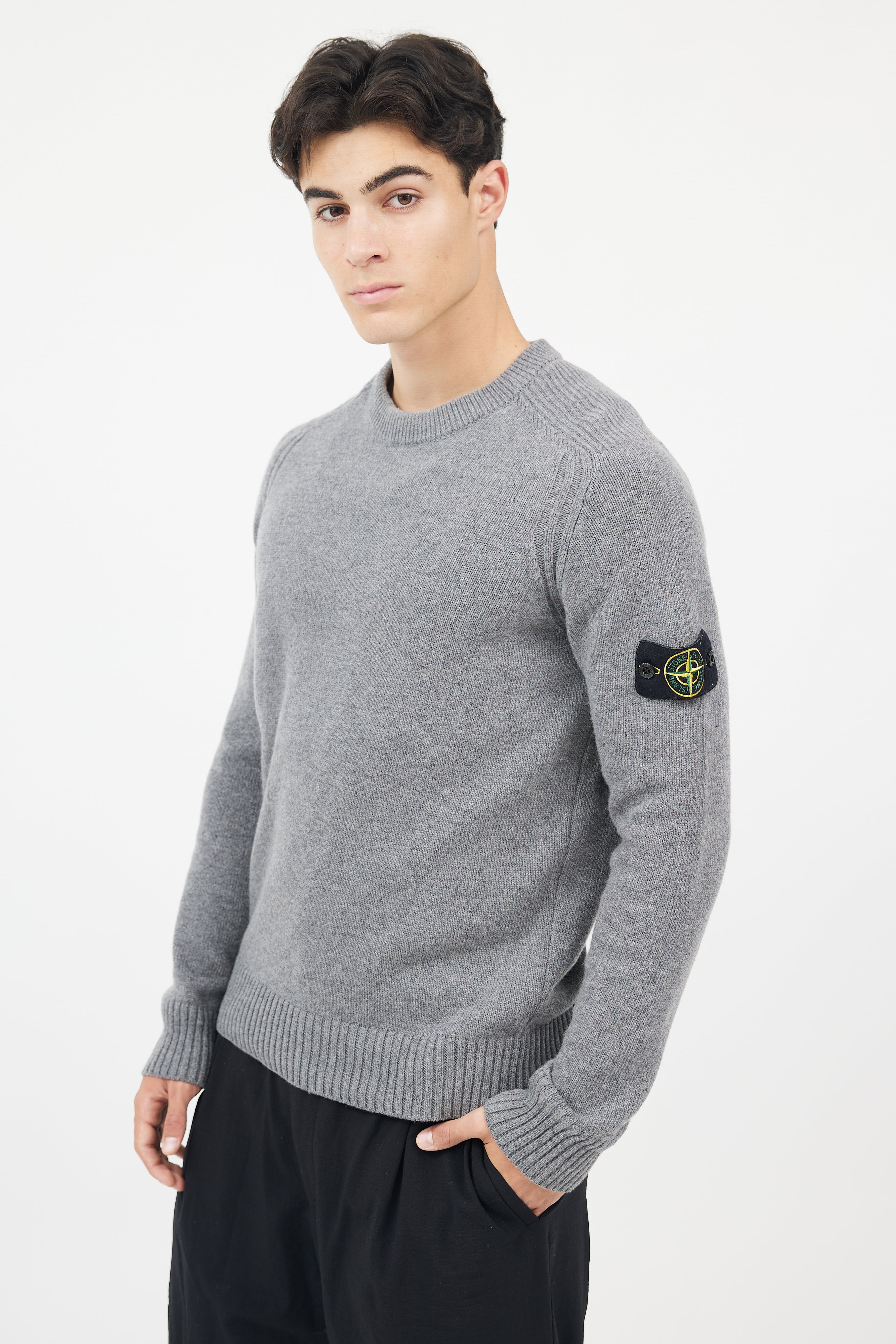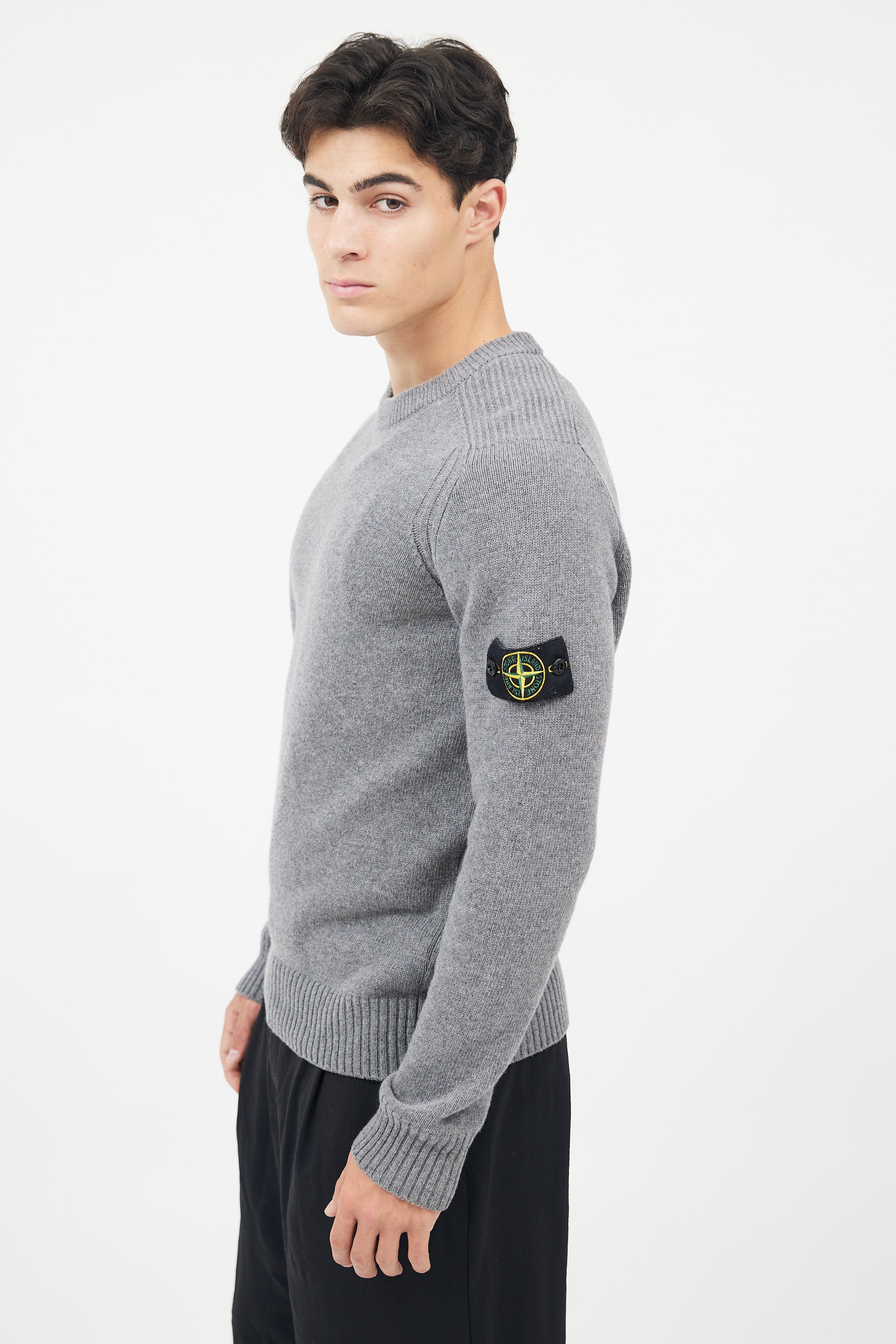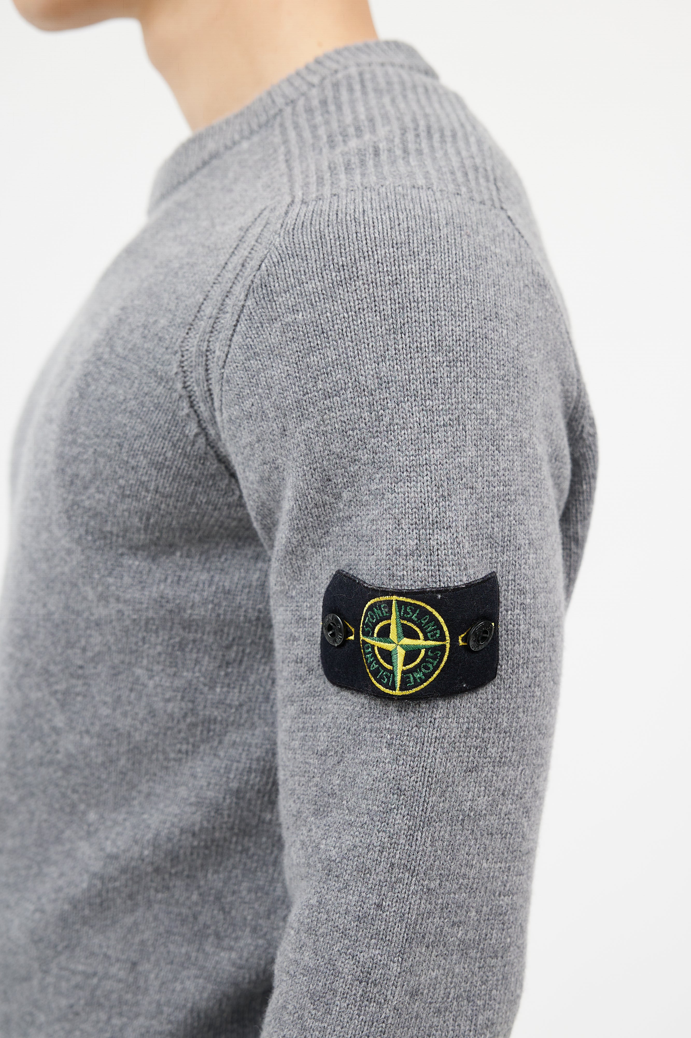 Pre-owned Stone Island sweater featuring grey wool knit throughout, ribbed bottom hem, wrist cuffs, shoulders and collar and logo patch buttoned to left outer sleeve.