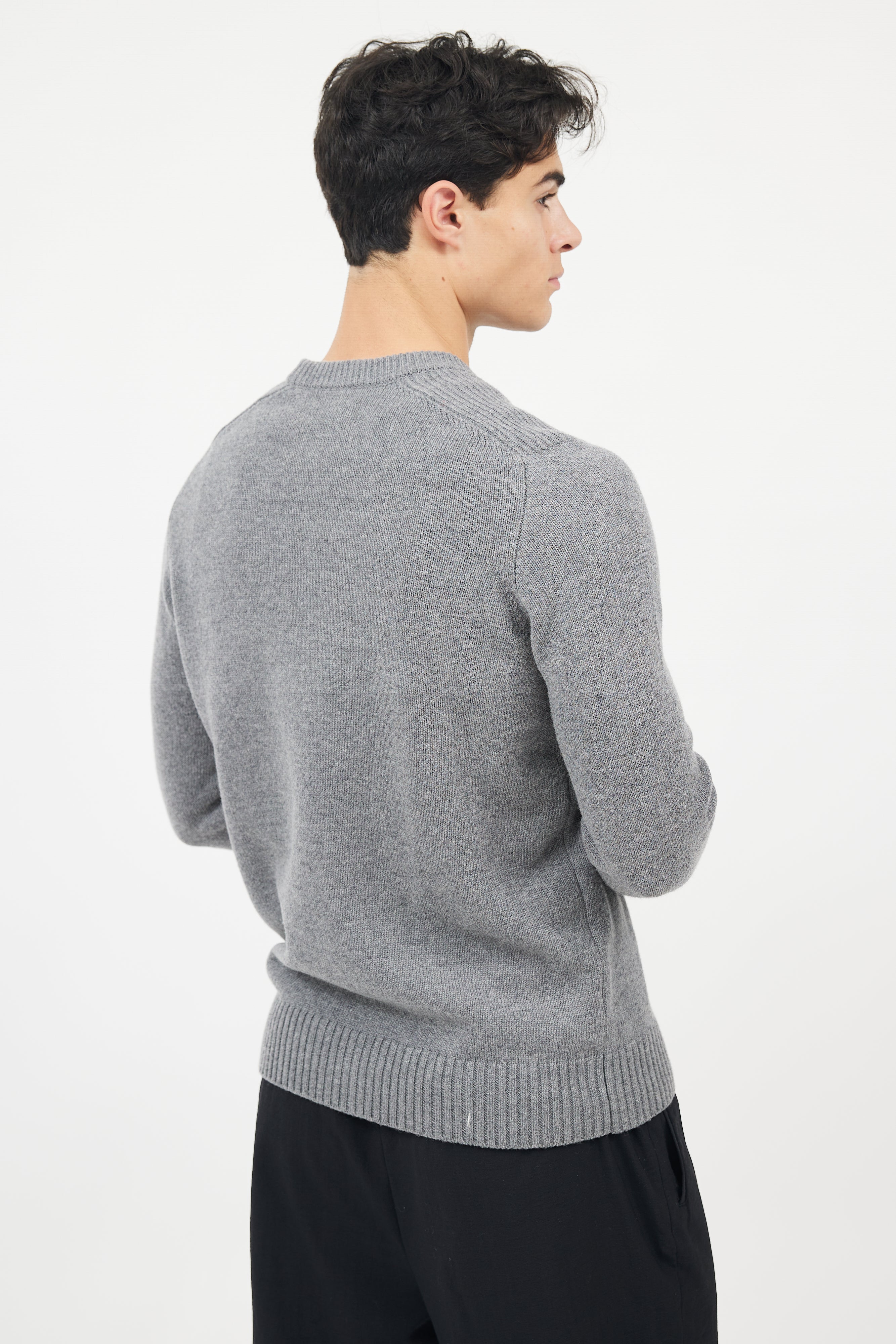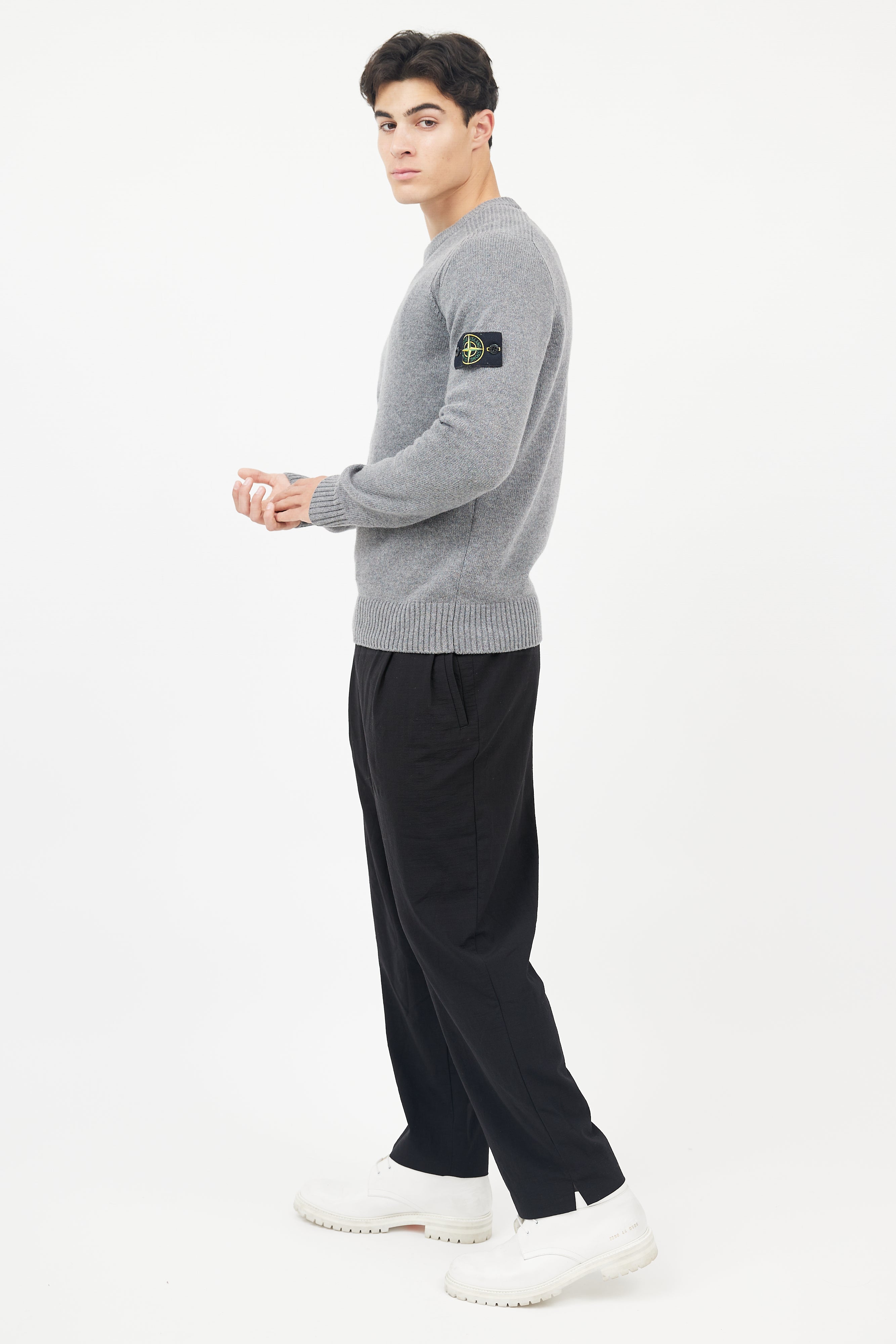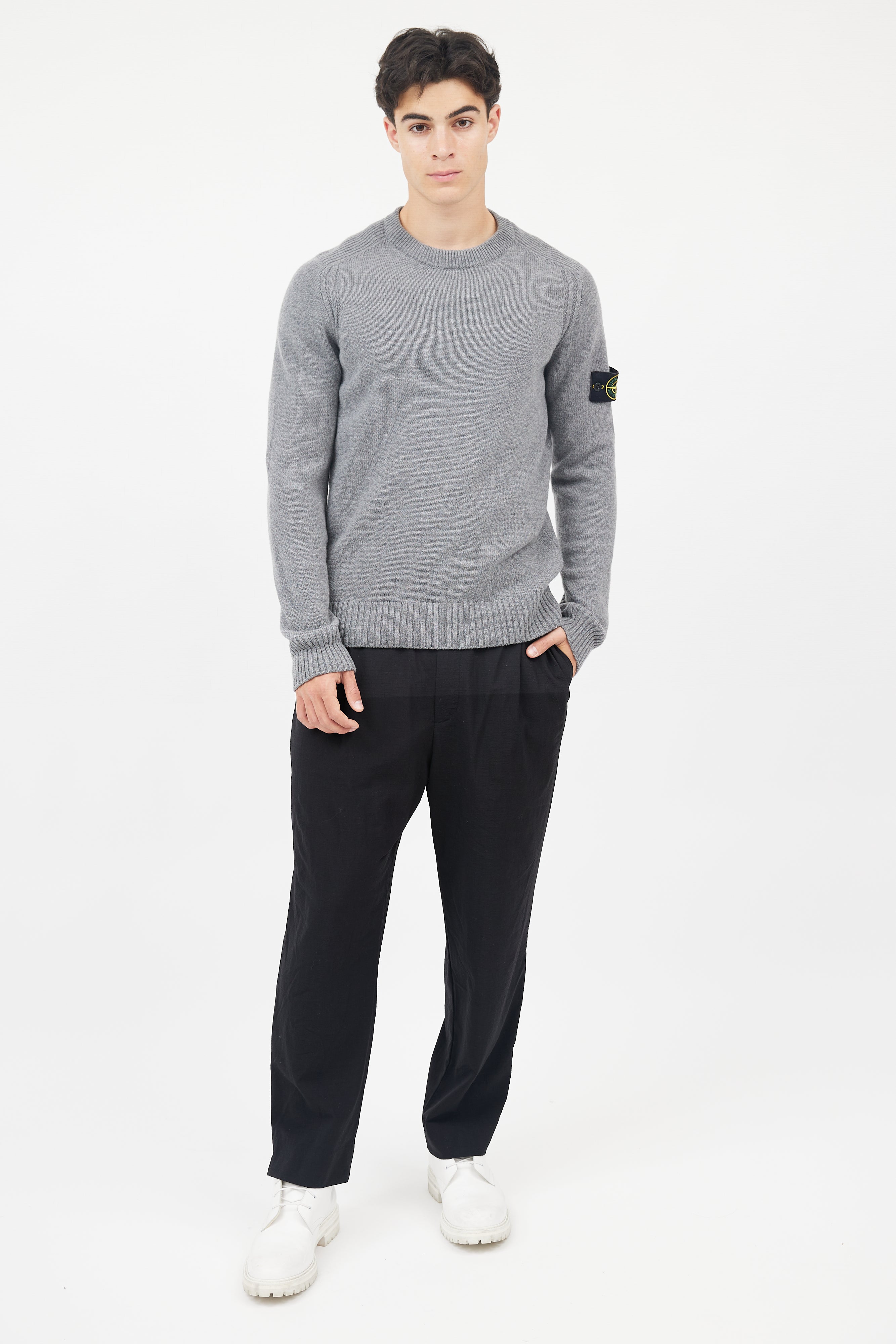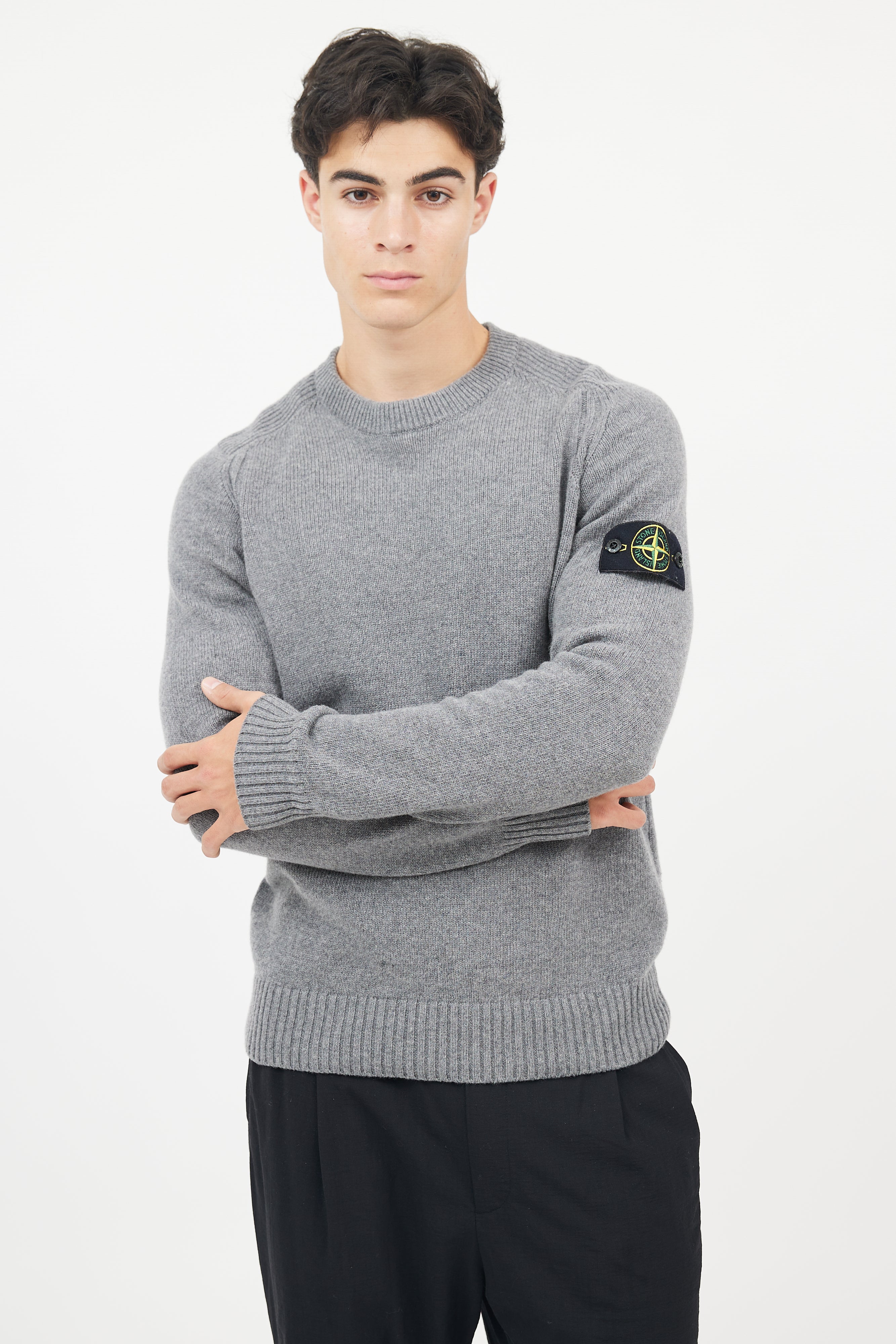 Pre-owned Stone Island sweater featuring grey wool knit throughout, ribbed bottom hem, wrist cuffs, shoulders and collar and logo patch buttoned to left outer sleeve.