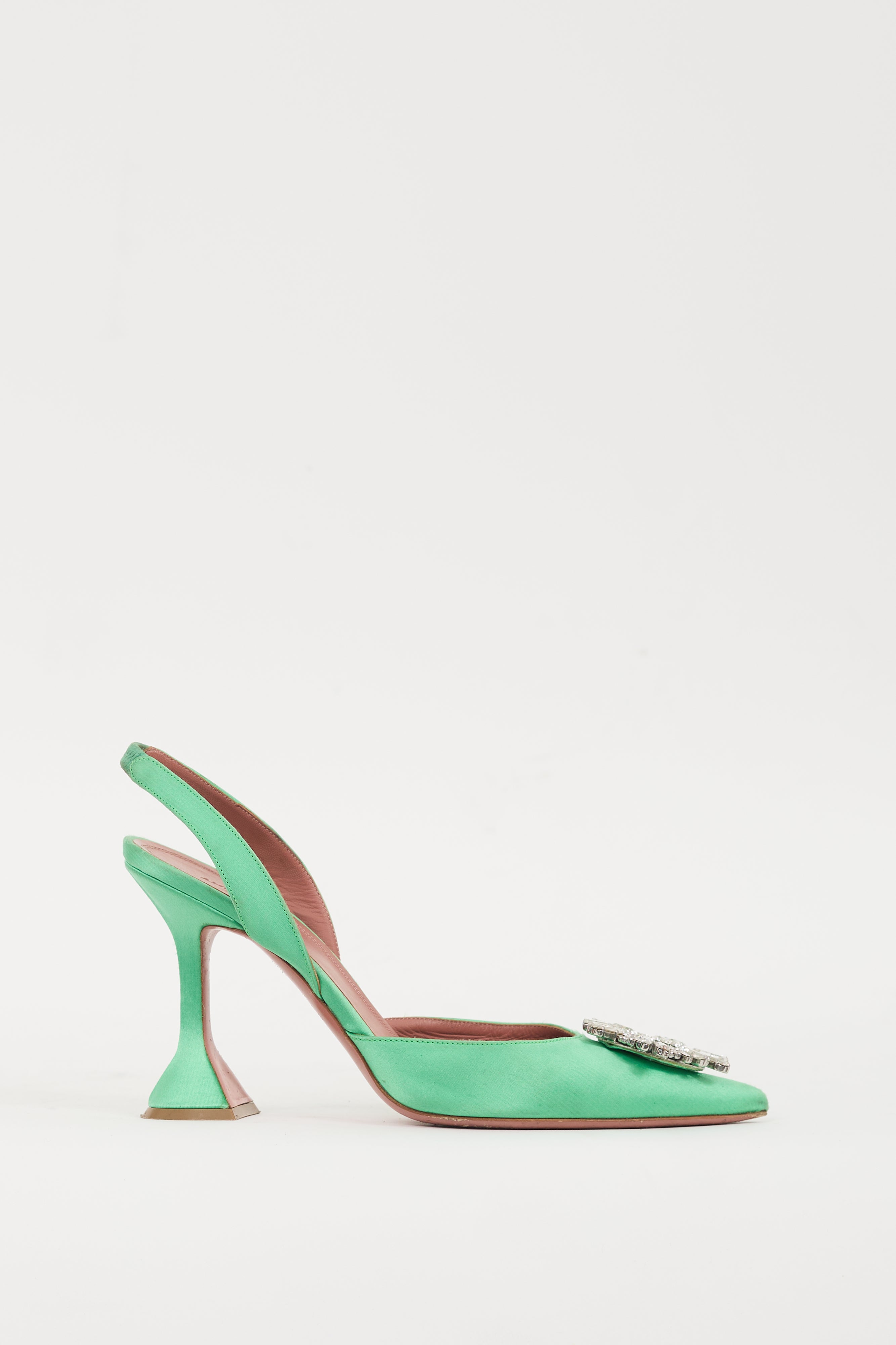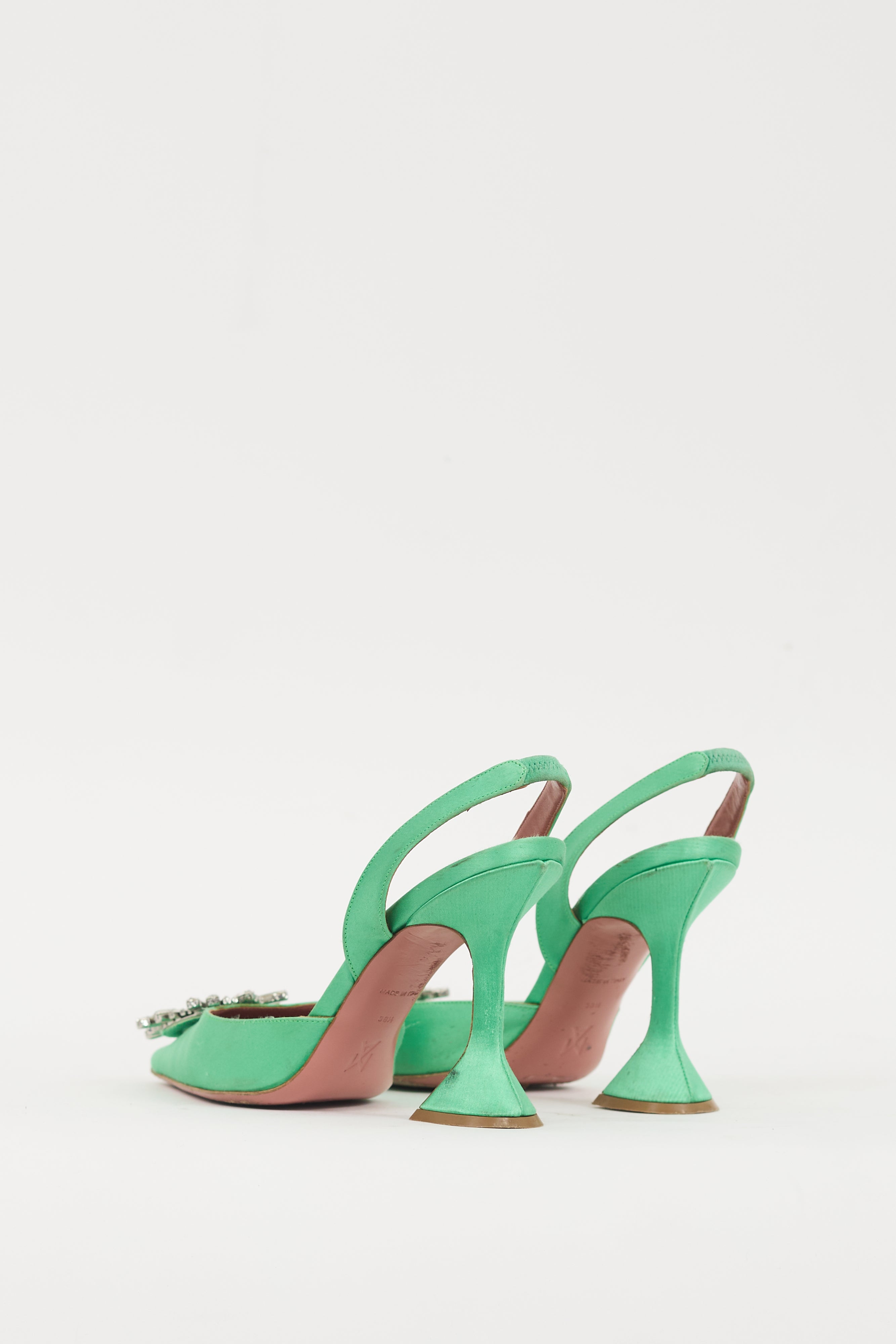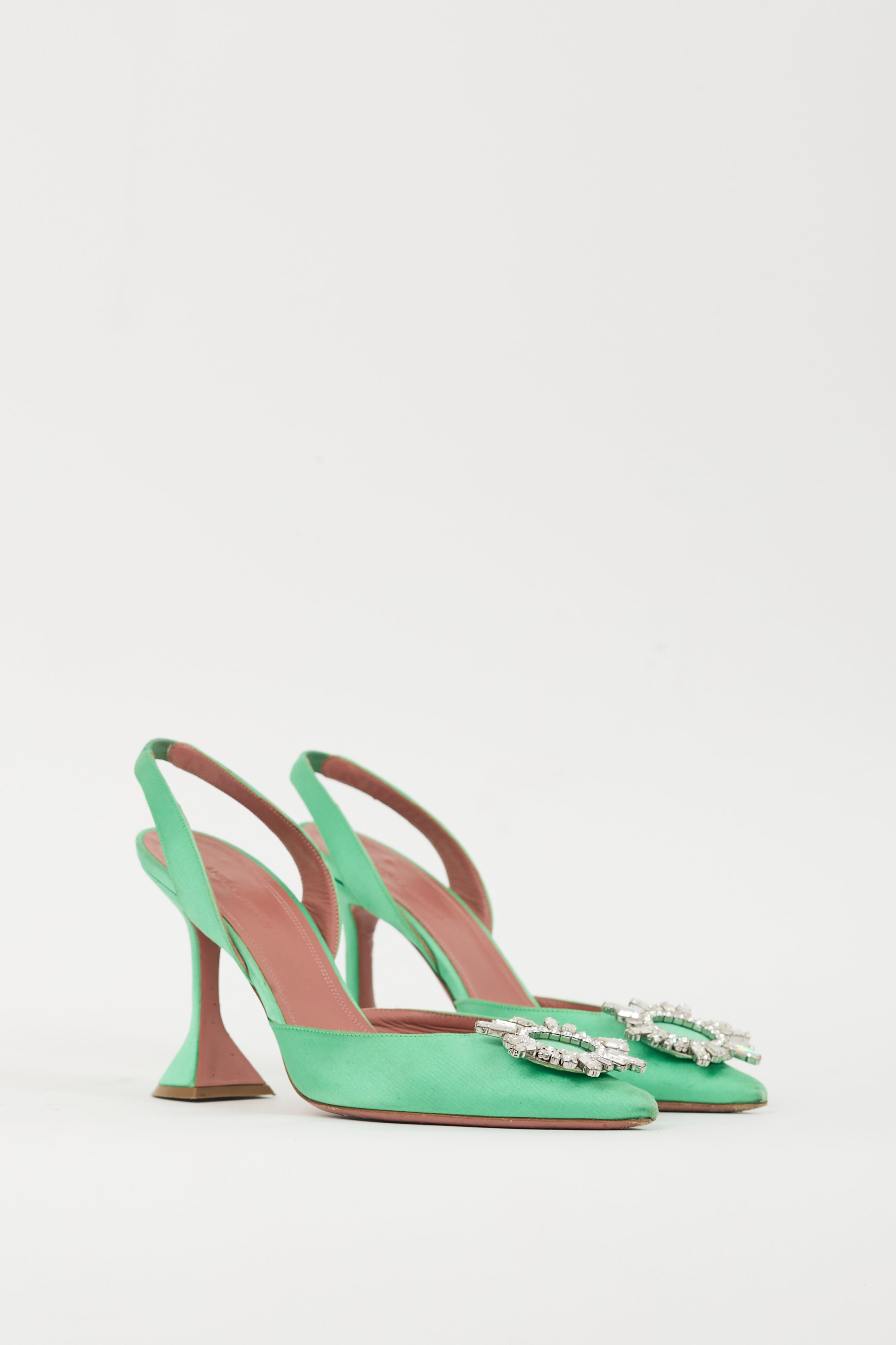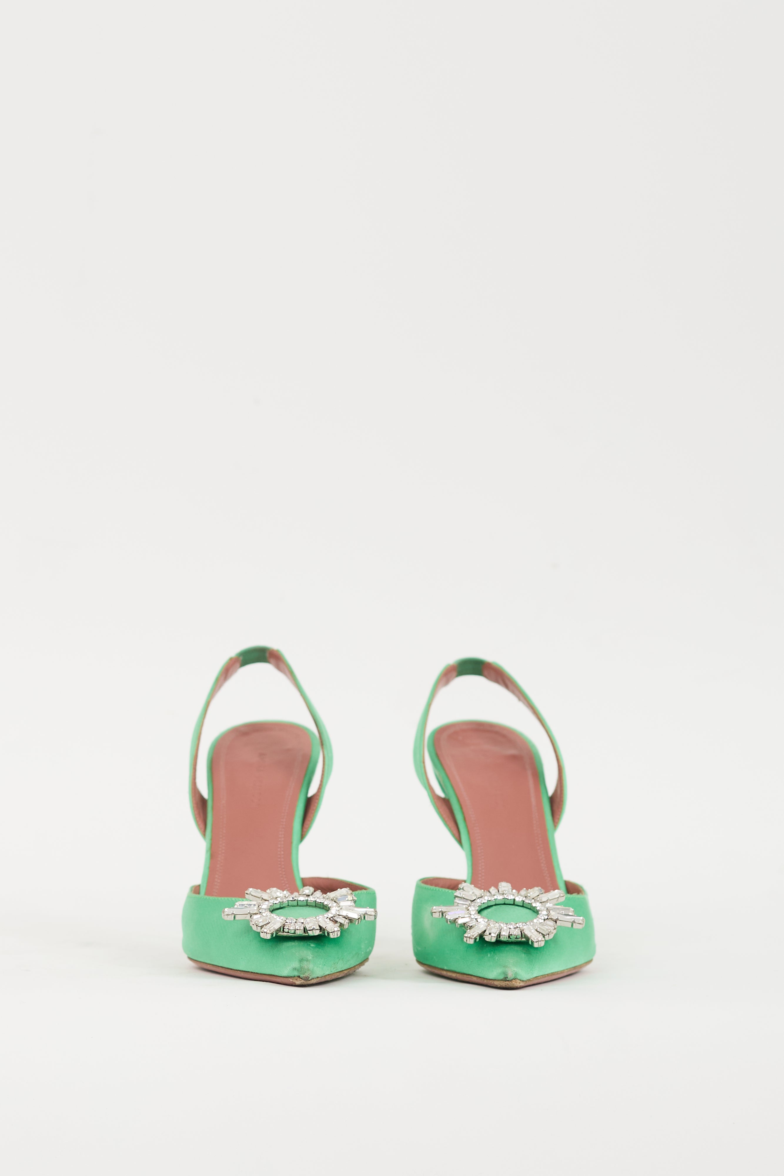 Pre-owned Amina Muaddi green Begum satin heels featuring a pointed toe, silver tone crystal embellishment at vamp, wrapped spool heel, and slingback strap at heel.