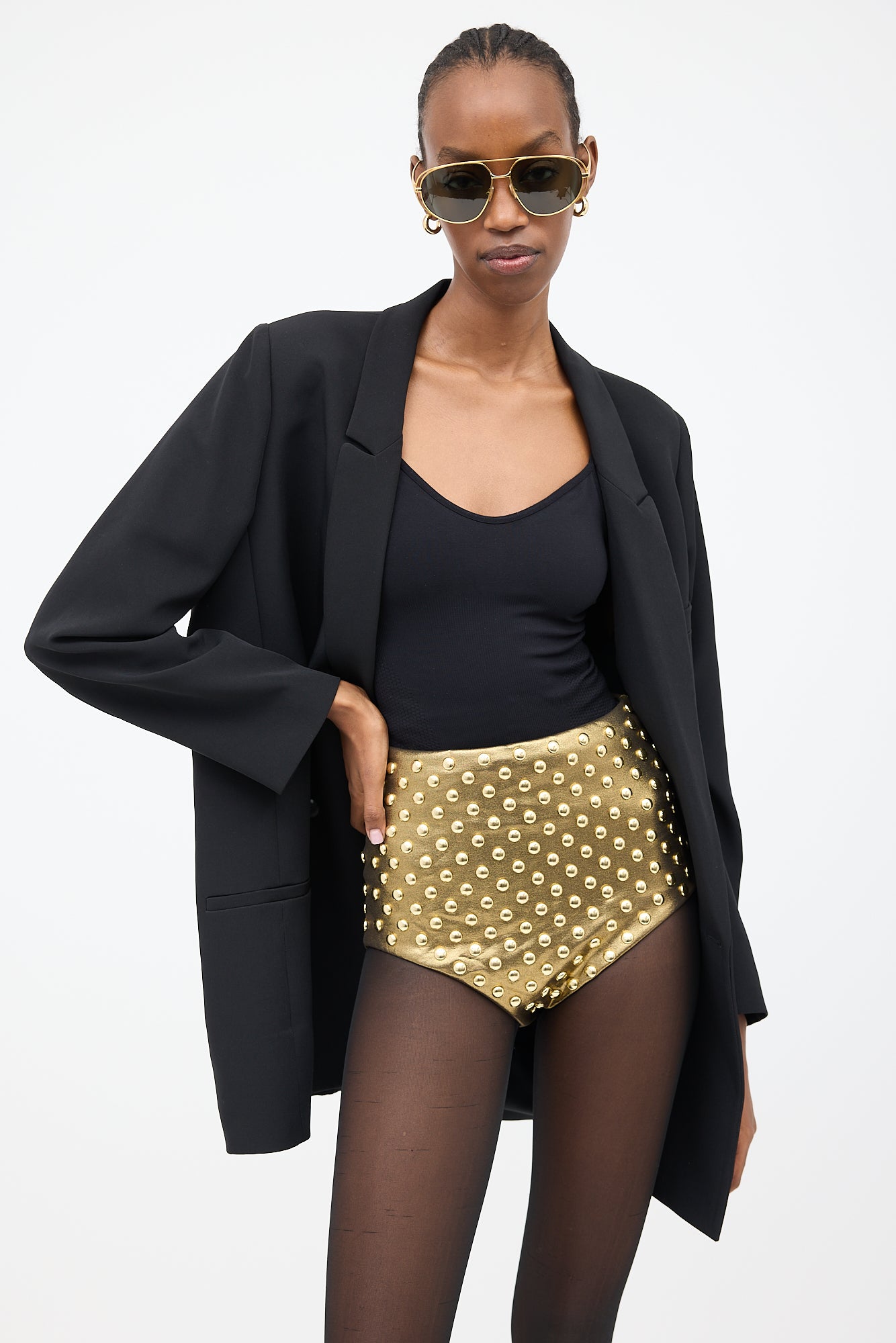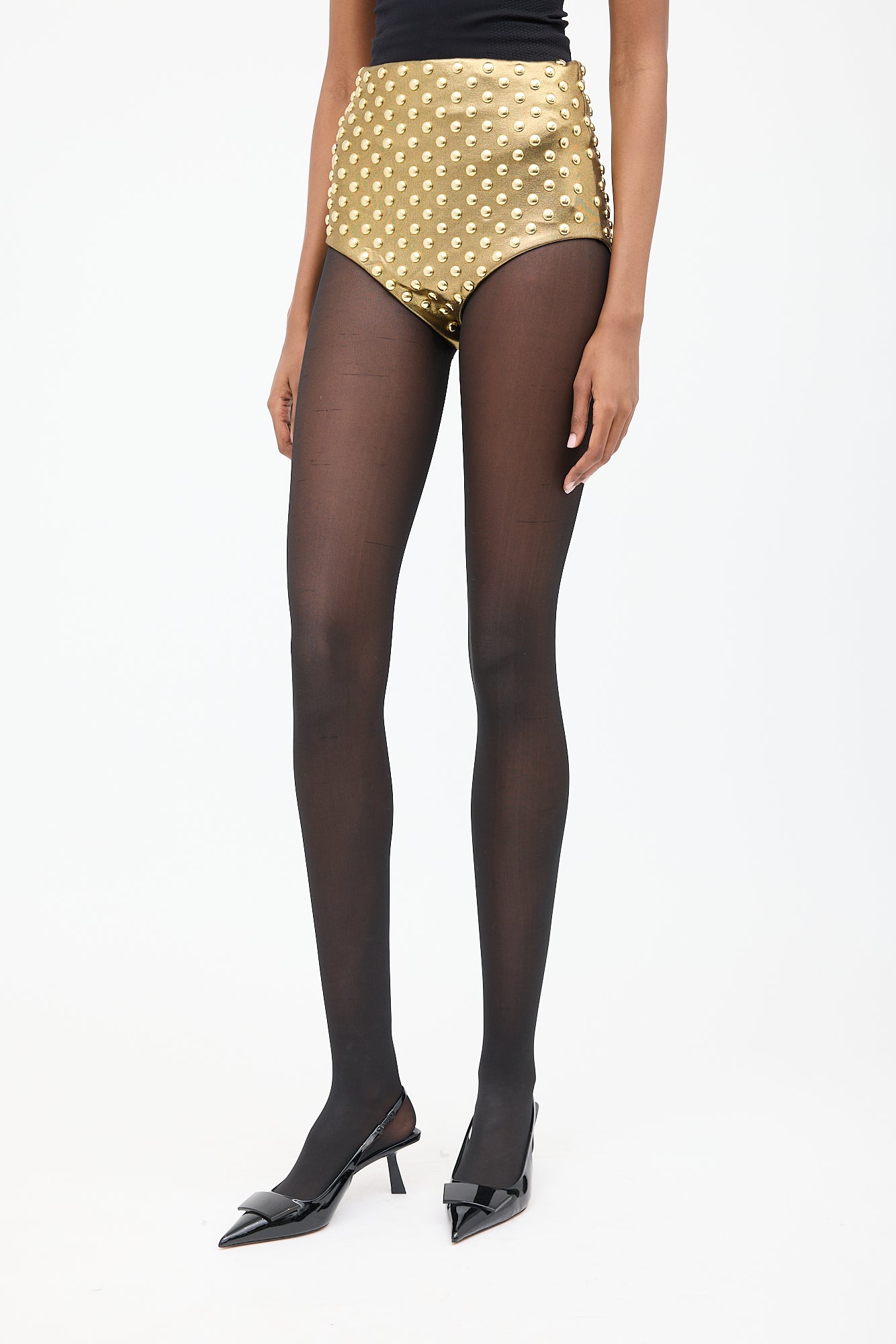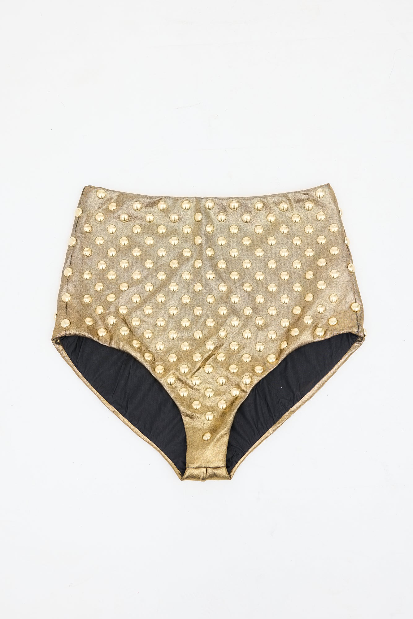 Pre-owned Phoebe Philo 2023 A1 gold tone lame swim bottoms featuring gold tone studs, high rise, and brief cut. Lined.