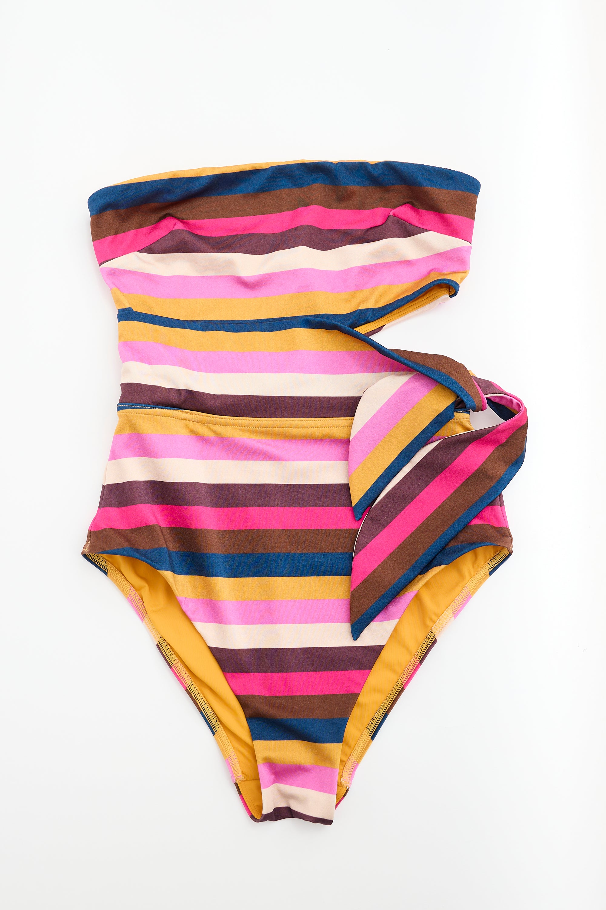 Pre-owned Zimmermann pink, orange, and multicolour swimsuit featuring stripe print, side boning, waist cut out with tie detail, and brief cut. Lined. Does not come with straps.