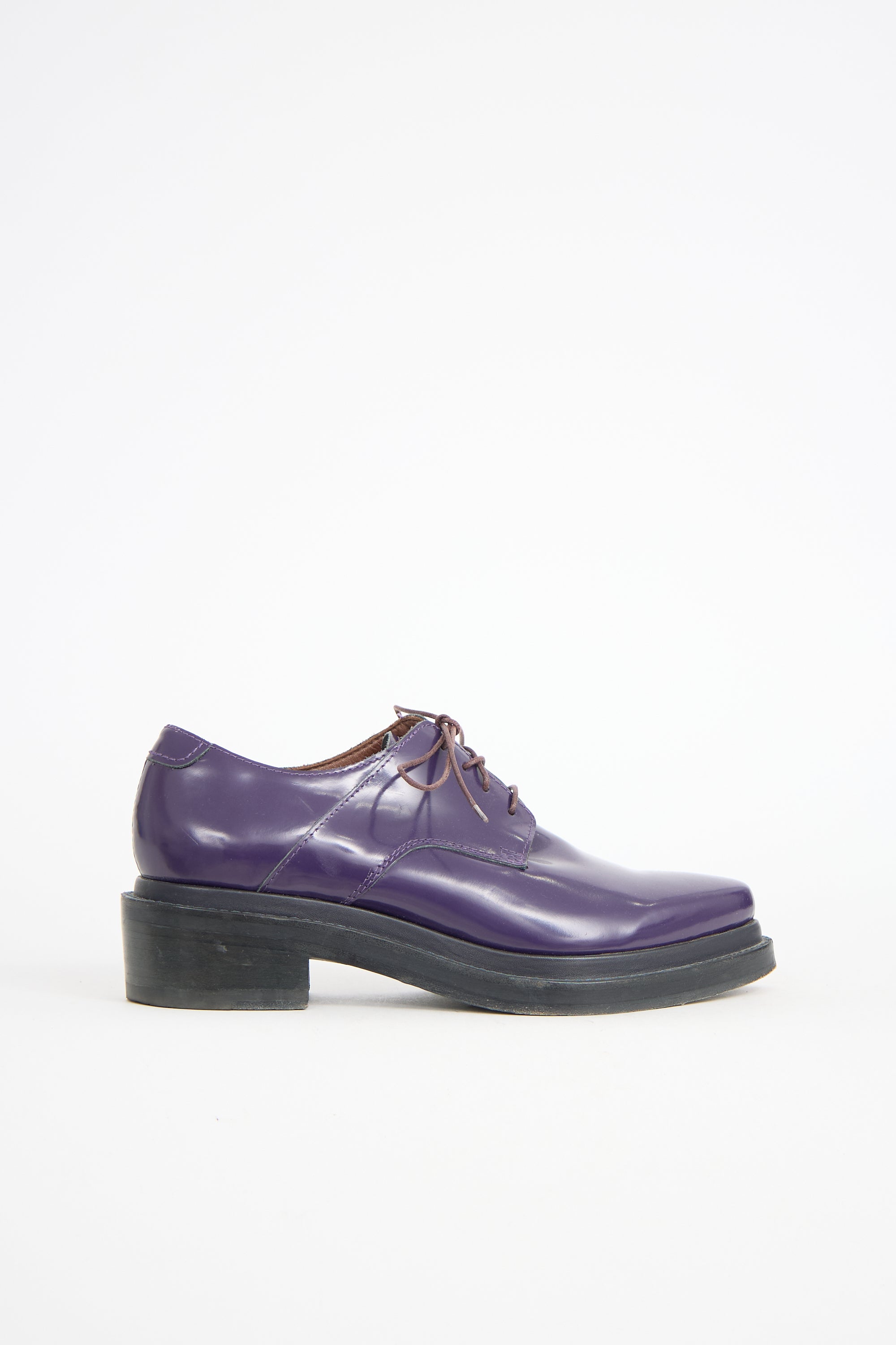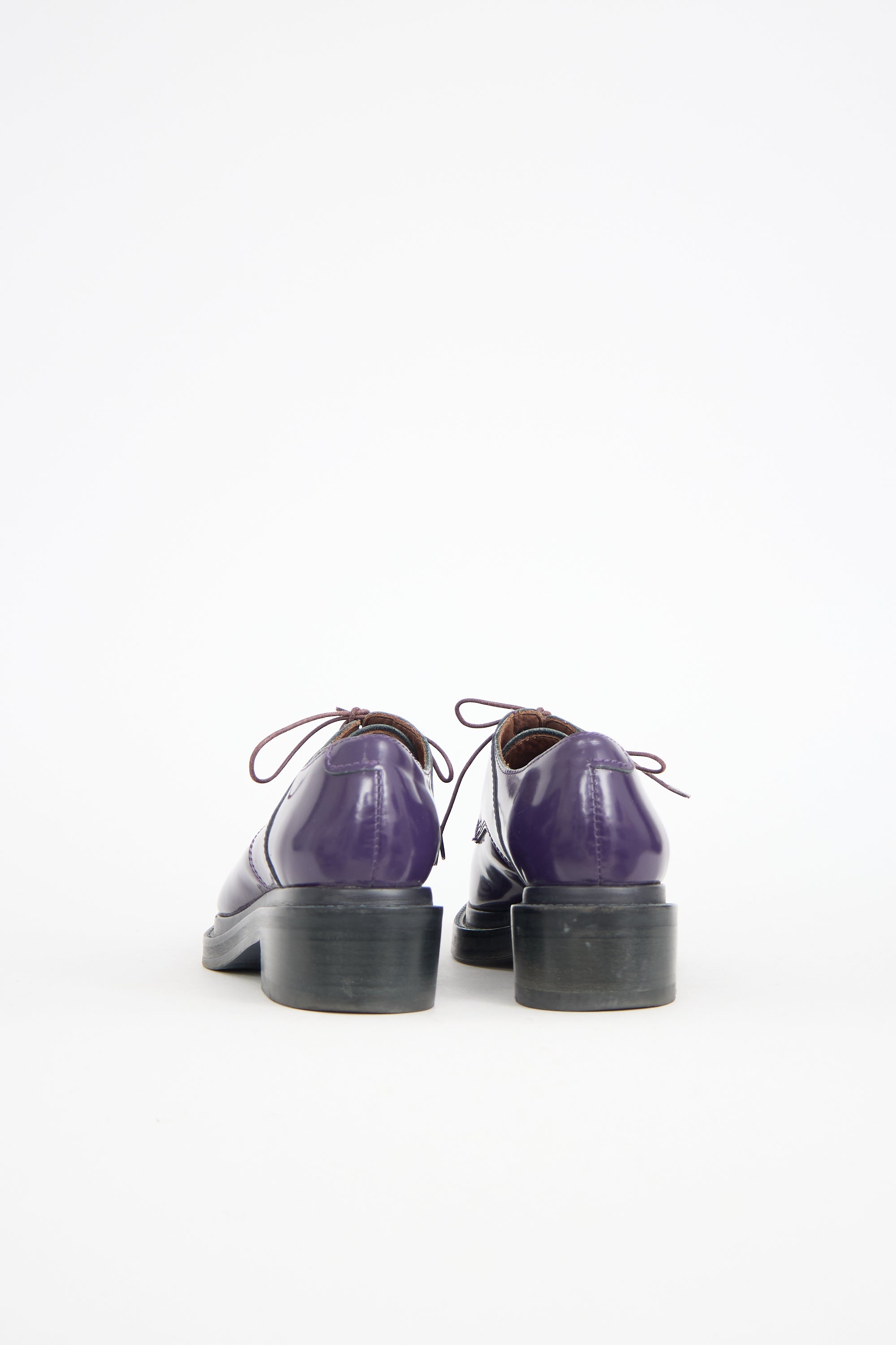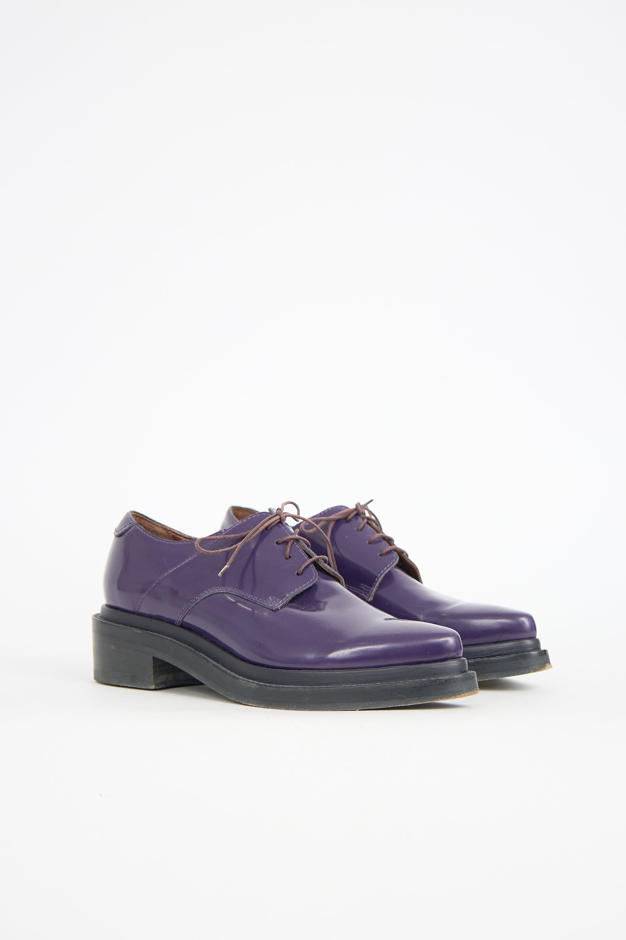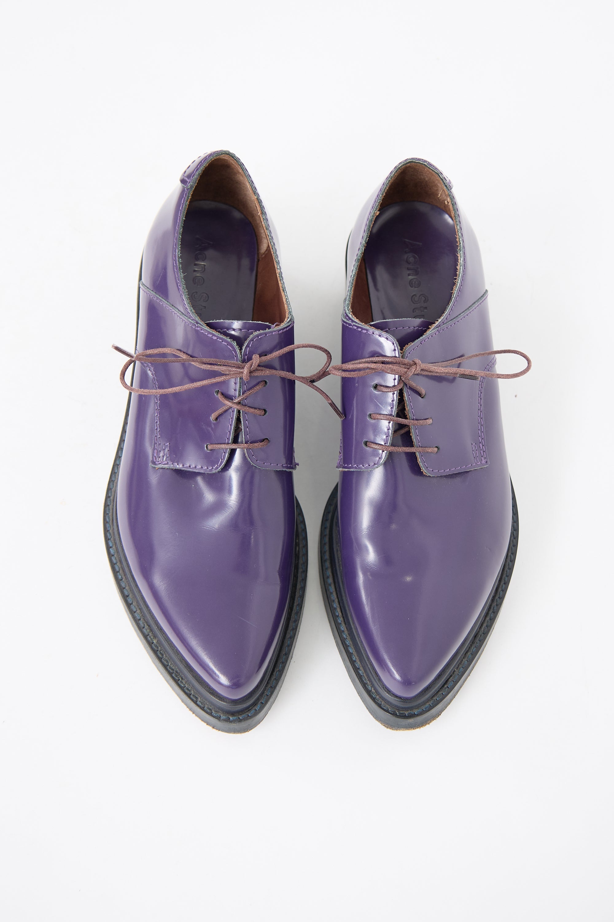 Pre-owned Acne Studios purple patent leather Lark oxfords featuring pointed toe, lace up instep, and block heel.