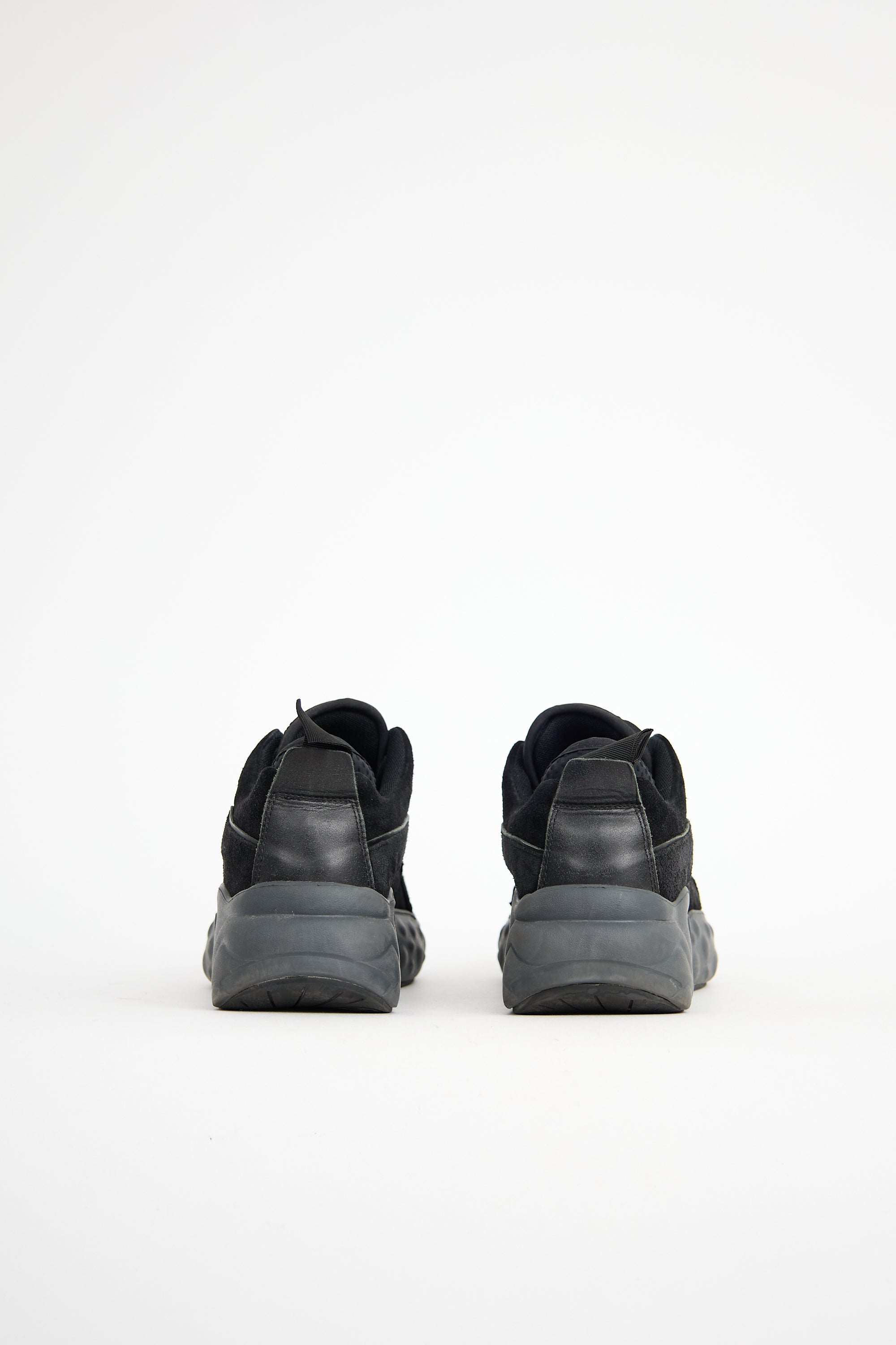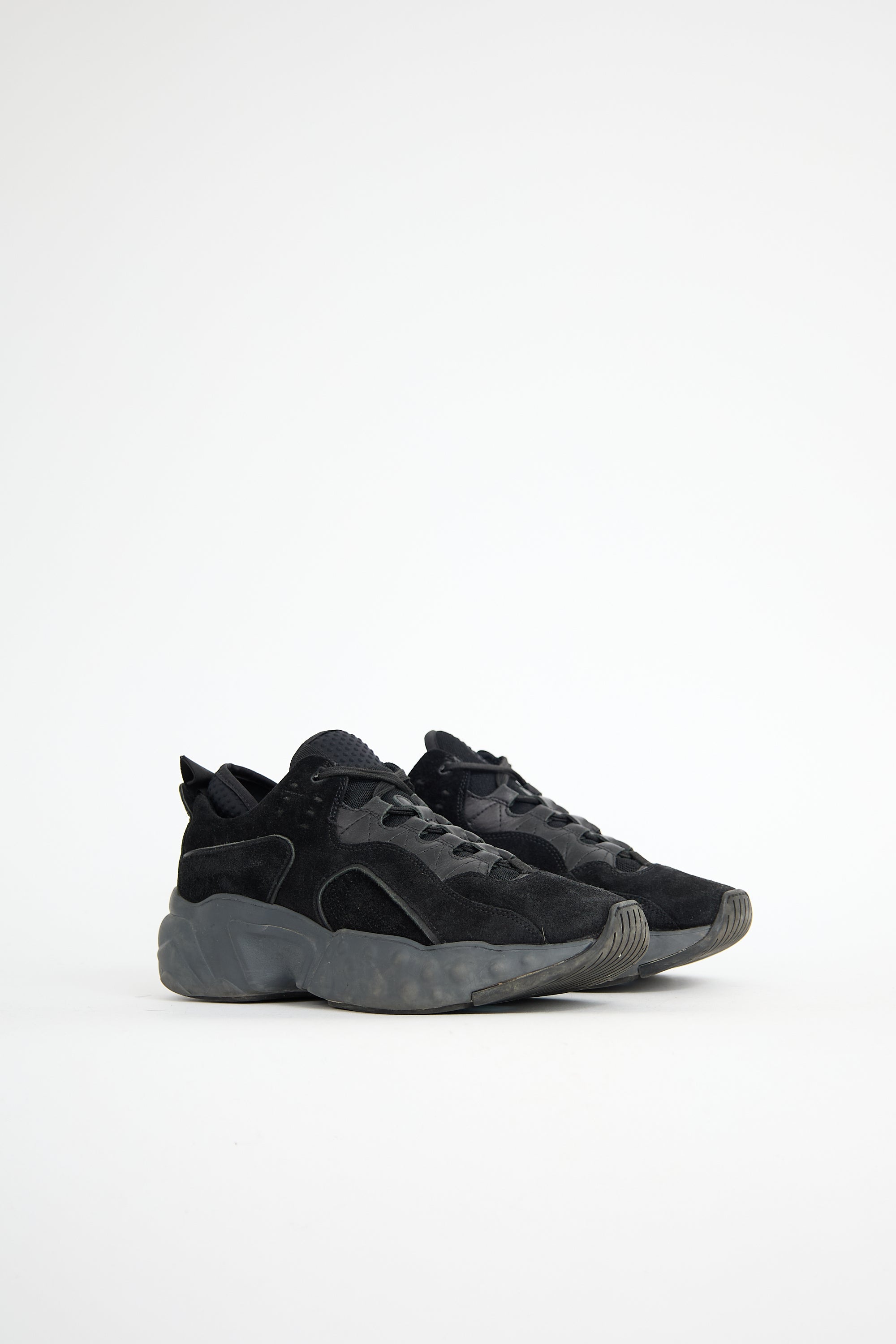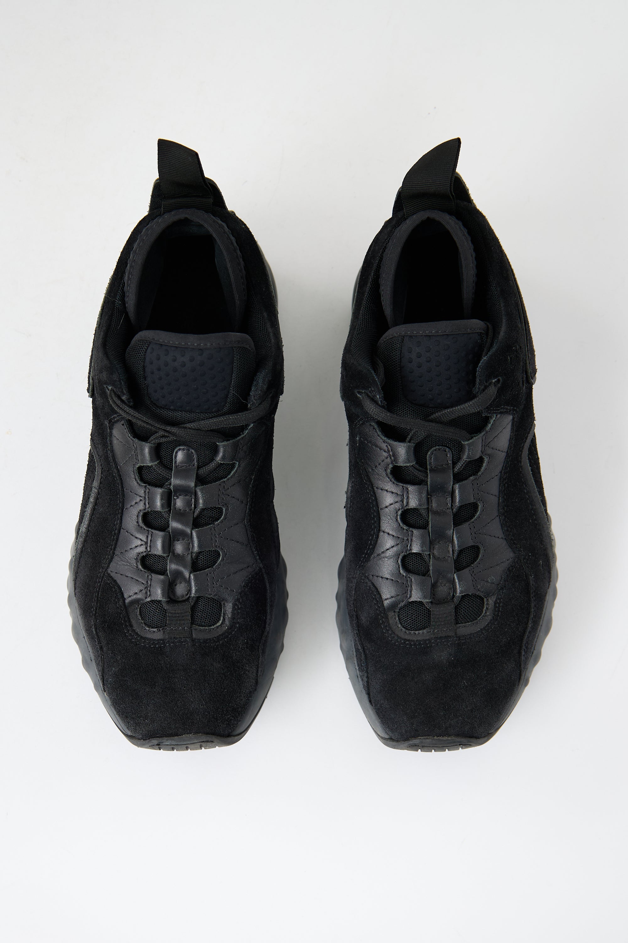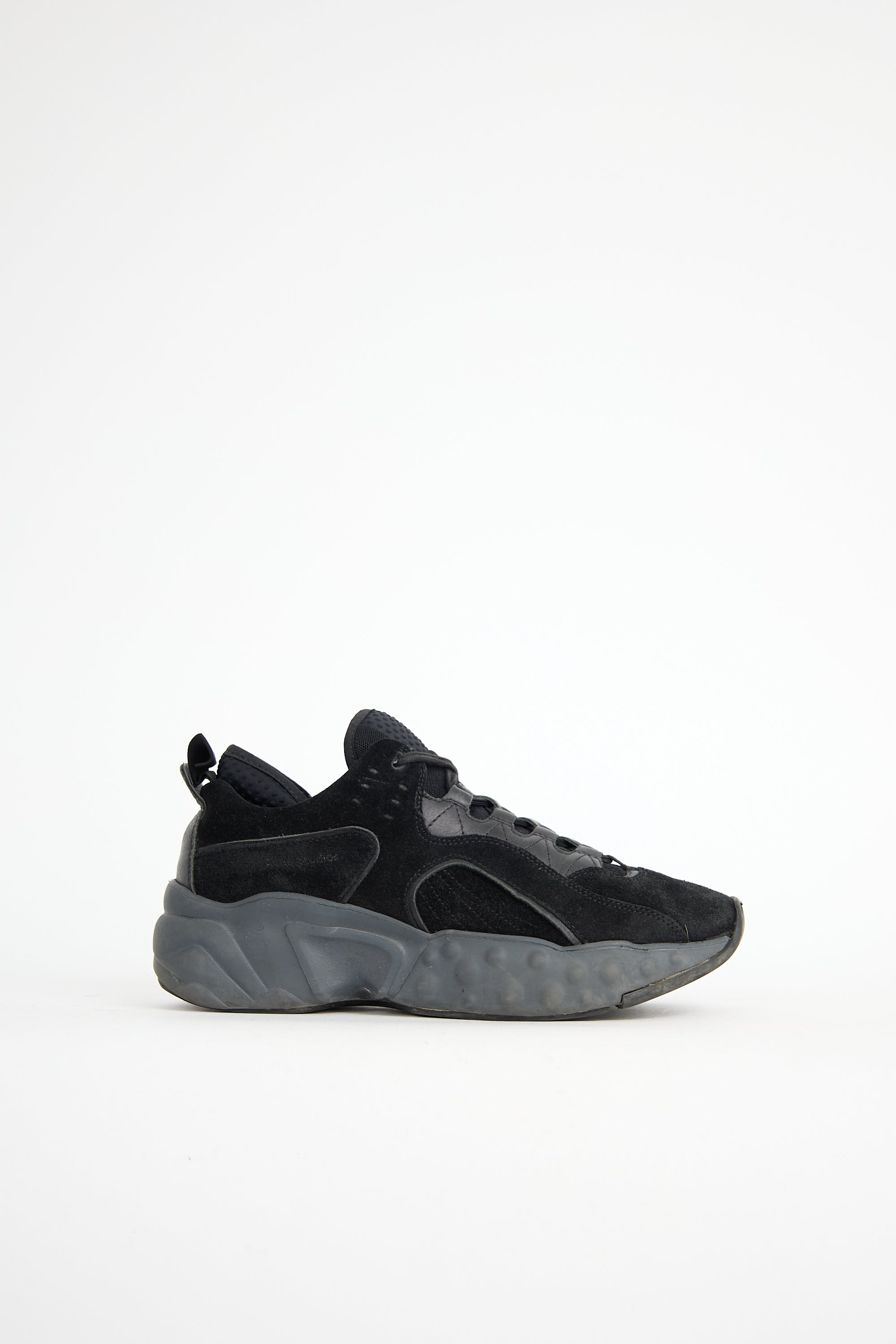 Pre-owned Acne Studios black suede Rockaway sneakers featuring square toe, lace up instep, padded mesh tongue, embossed dot insert at tongue and interior counter, pull tab at counter, and chunky rubber sole.