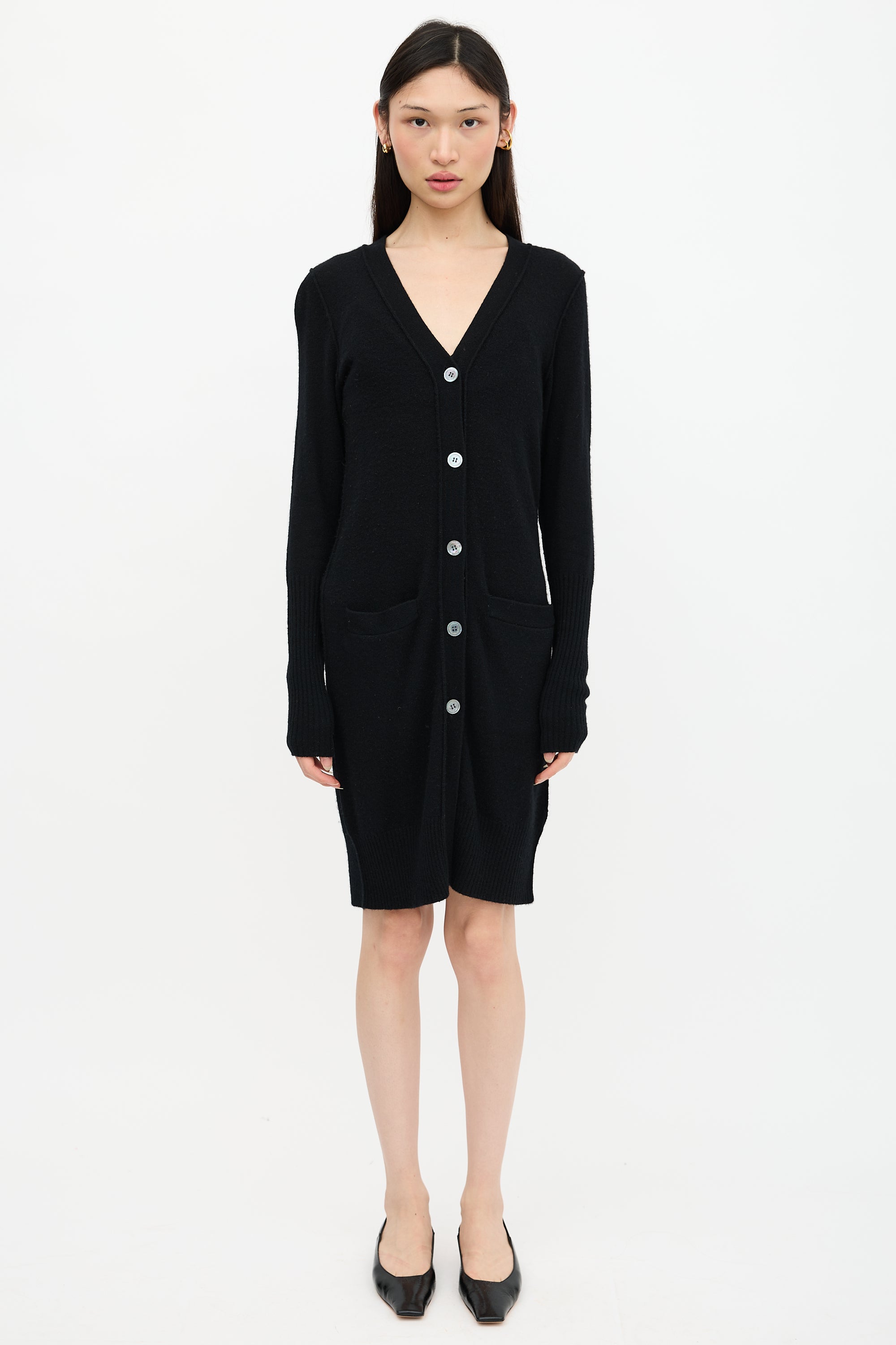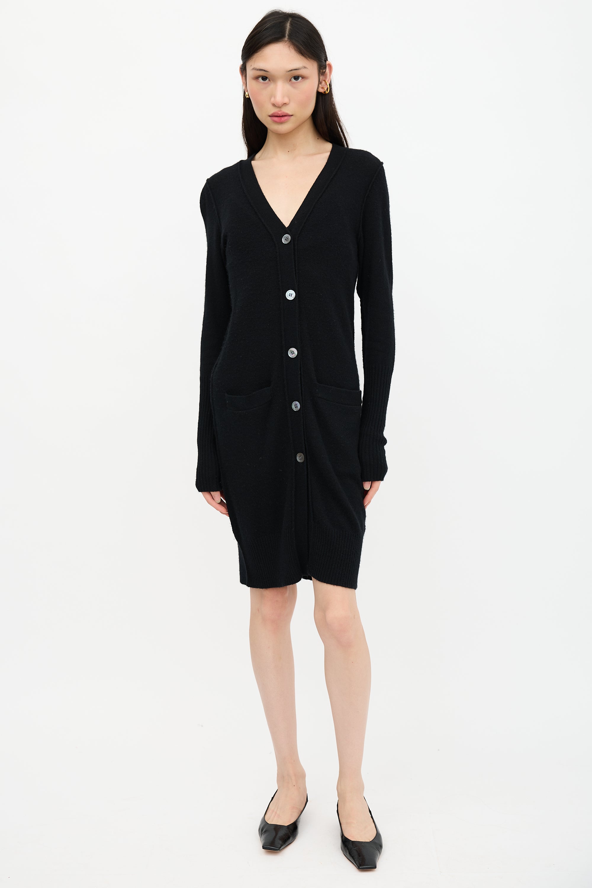 Pre-owned Nili black cashmere long cardigan featuring button front, patch pockets, and ribbed trim.