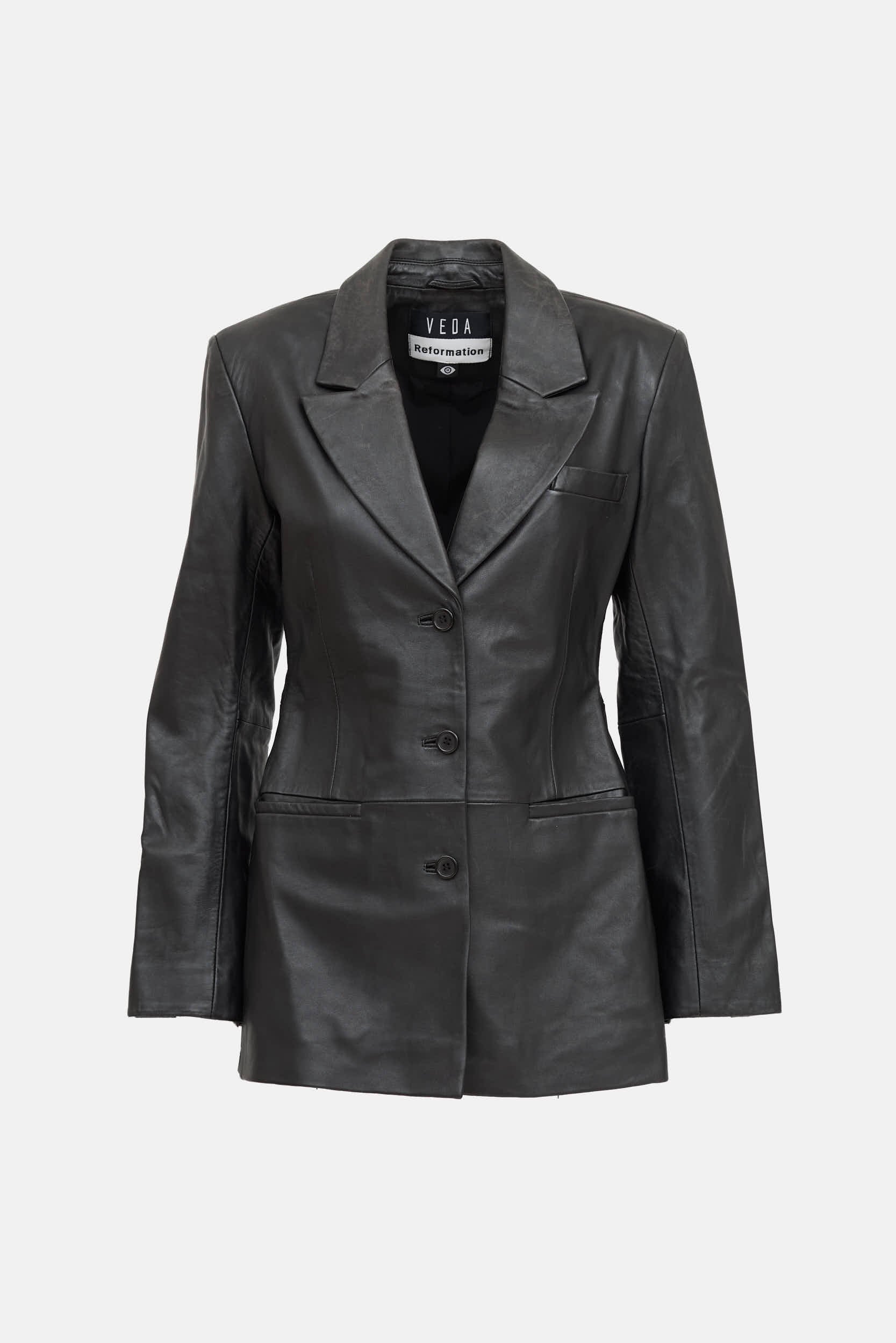 Pre-owned Reformation X Veda leather blazer jacket featuring notched lapel collar, shoulder pads, button front, welt pocket at chest and front, and slit at back hemline. Lined.