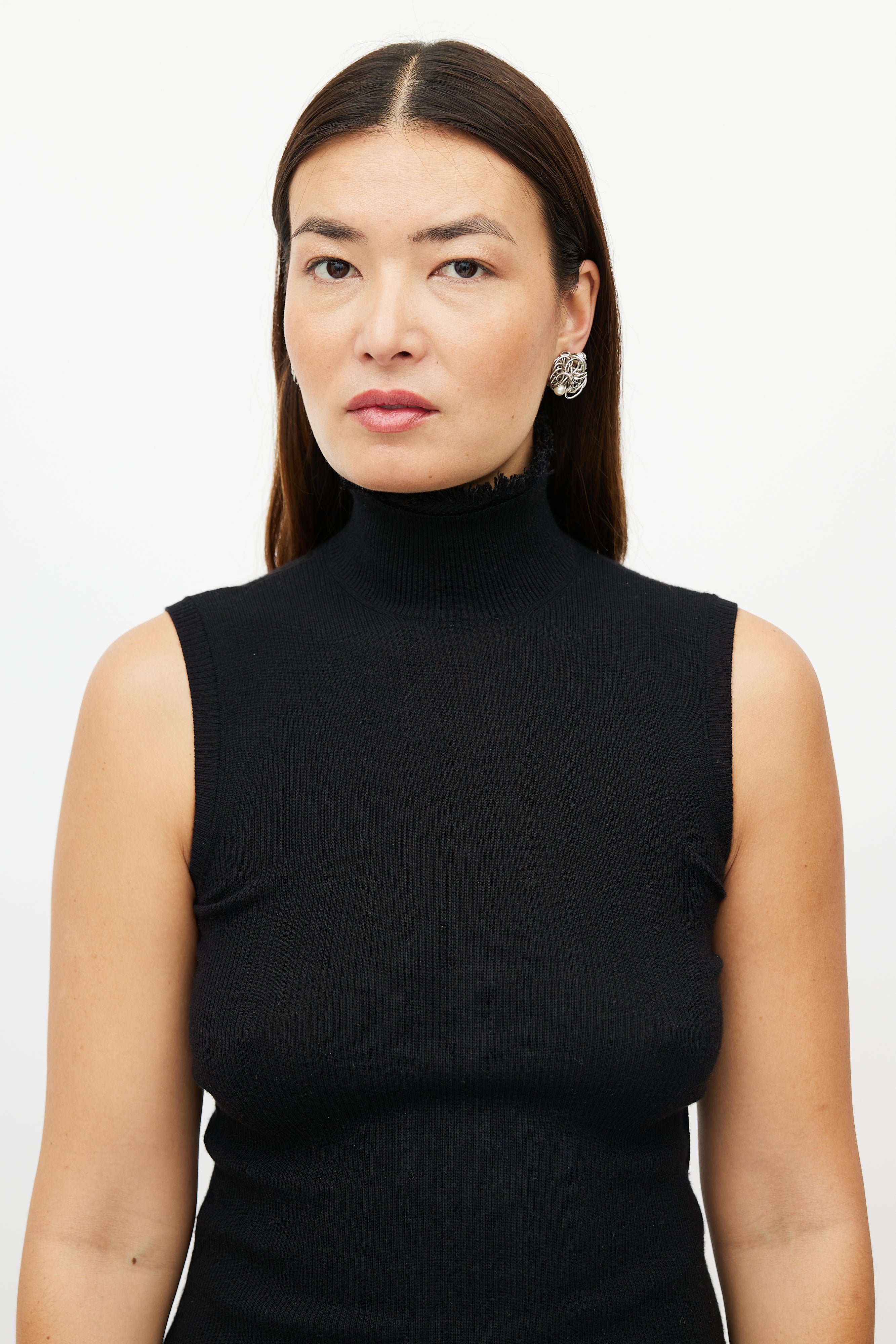 Pre-owned Chanel black cashmere top featuring a funnel neck collar with fringe trim, sleeveless styling, logo hardware detail at hip, and zip closure at back.