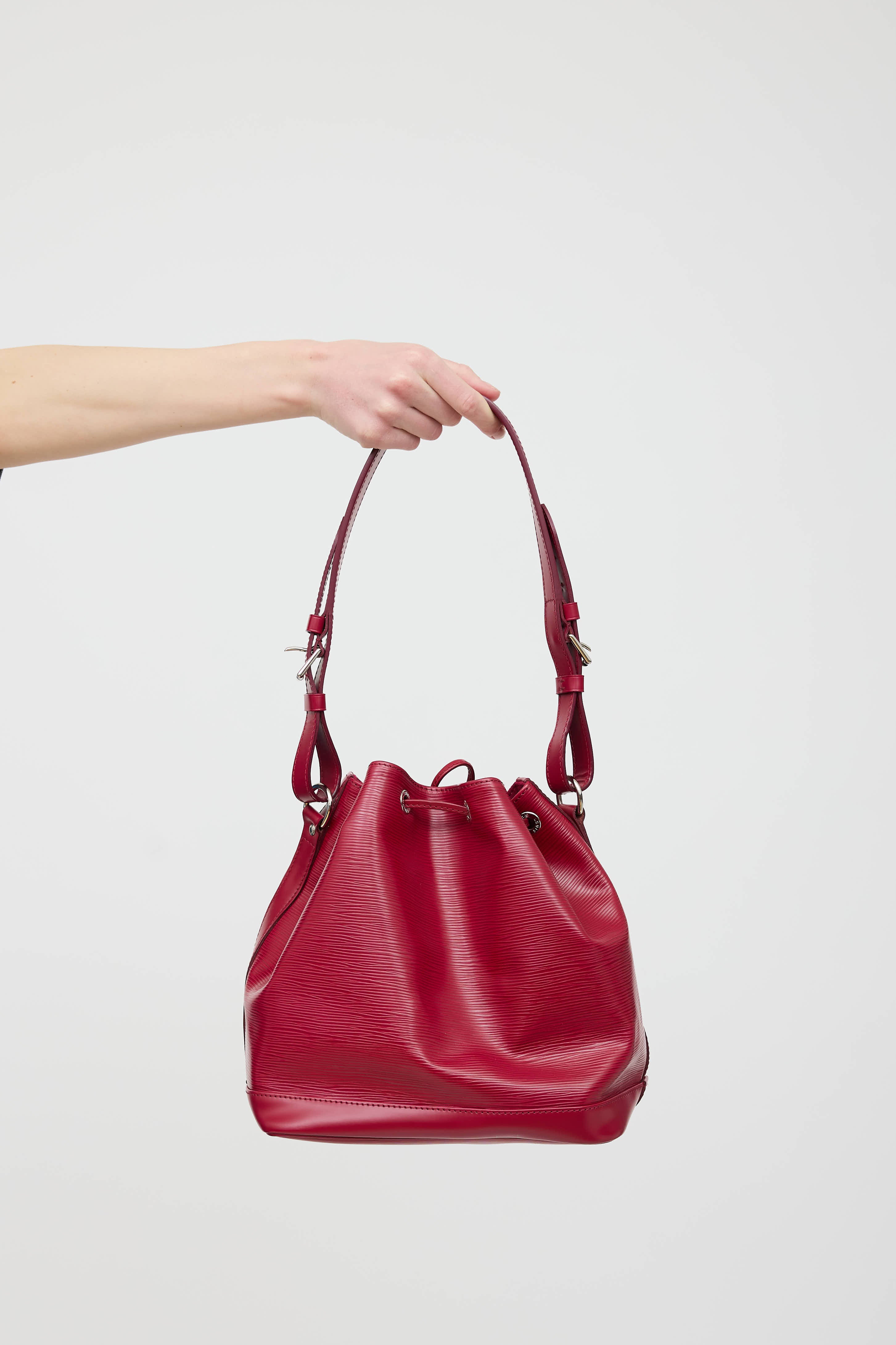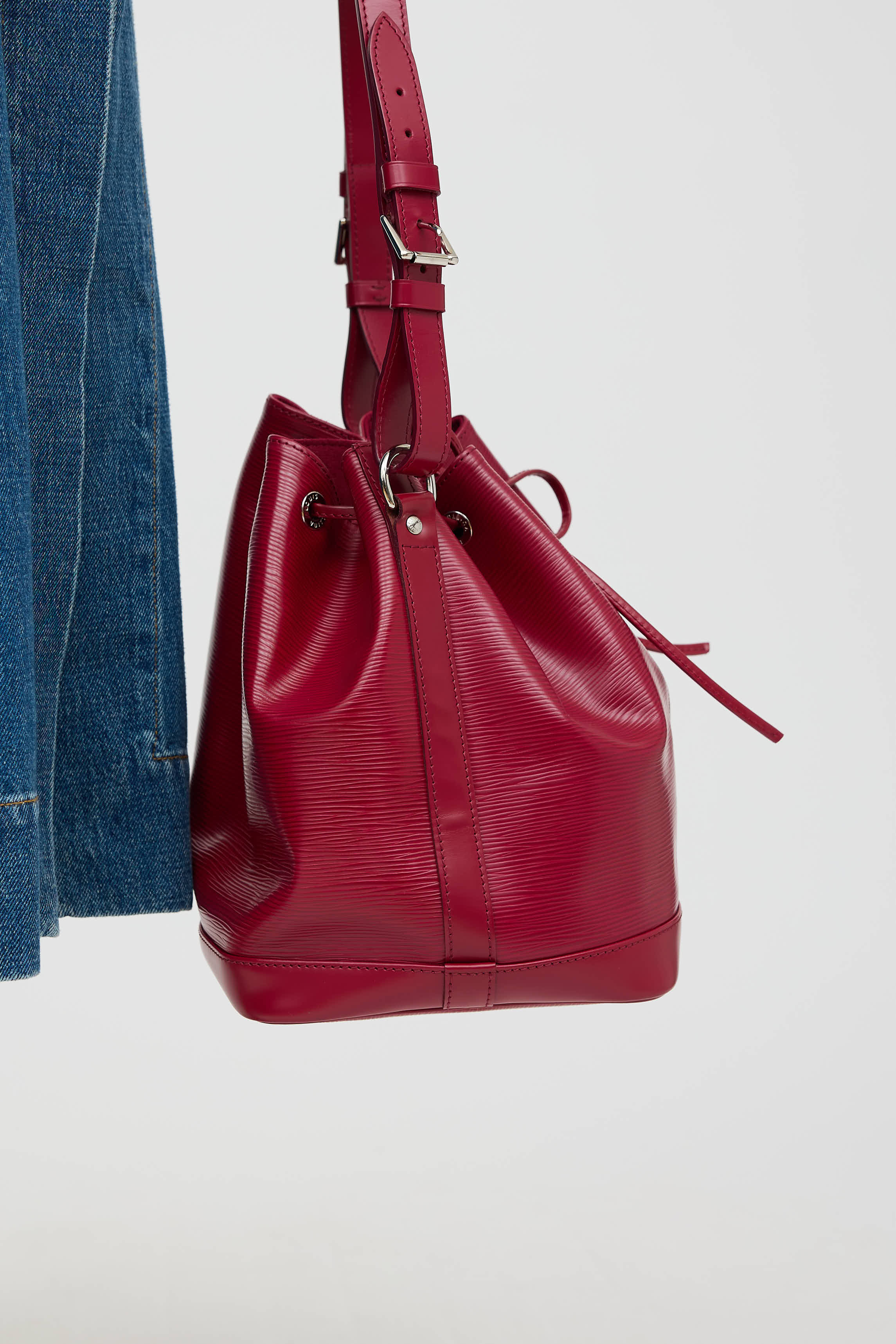 Pre-owned Louis Vuitton fushia Noé bucket bag in textured epi leather featuring an adjustable shoulder strap, one main compartment, debossed logo at corner, and drawstring closure.